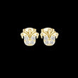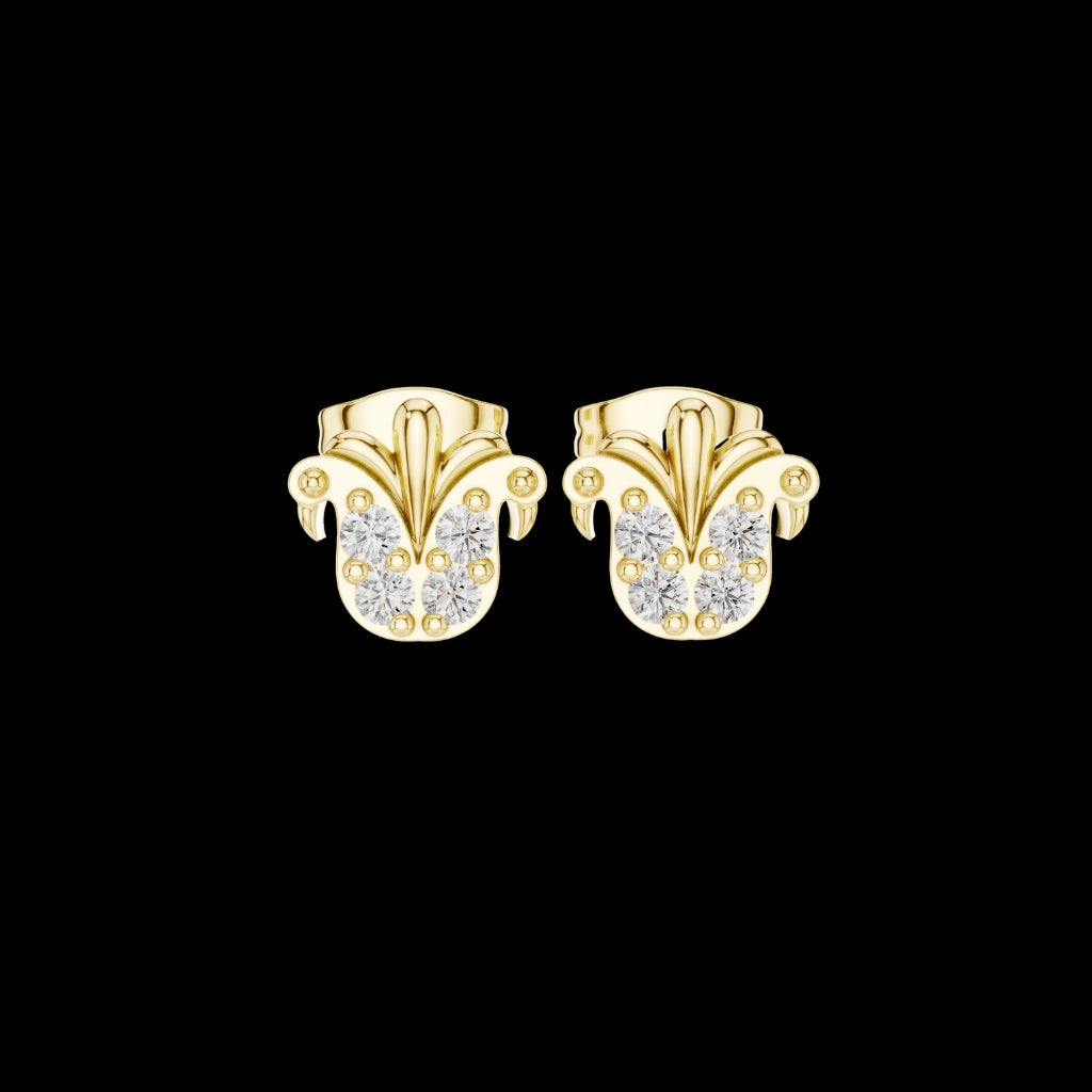 Inspired by classical royal ornamentation, these regal fan diamond stud earrings are beautifully crafted in polished gold. The sculpted crest design fans upward with elegant curves, while a quartet of round brilliant diamonds forms a luminous foundation below, offering balanced sparkle and symmetry. The combination of architectural gold detailing and refined diamond placement creates a statement that feels both historic and contemporary.