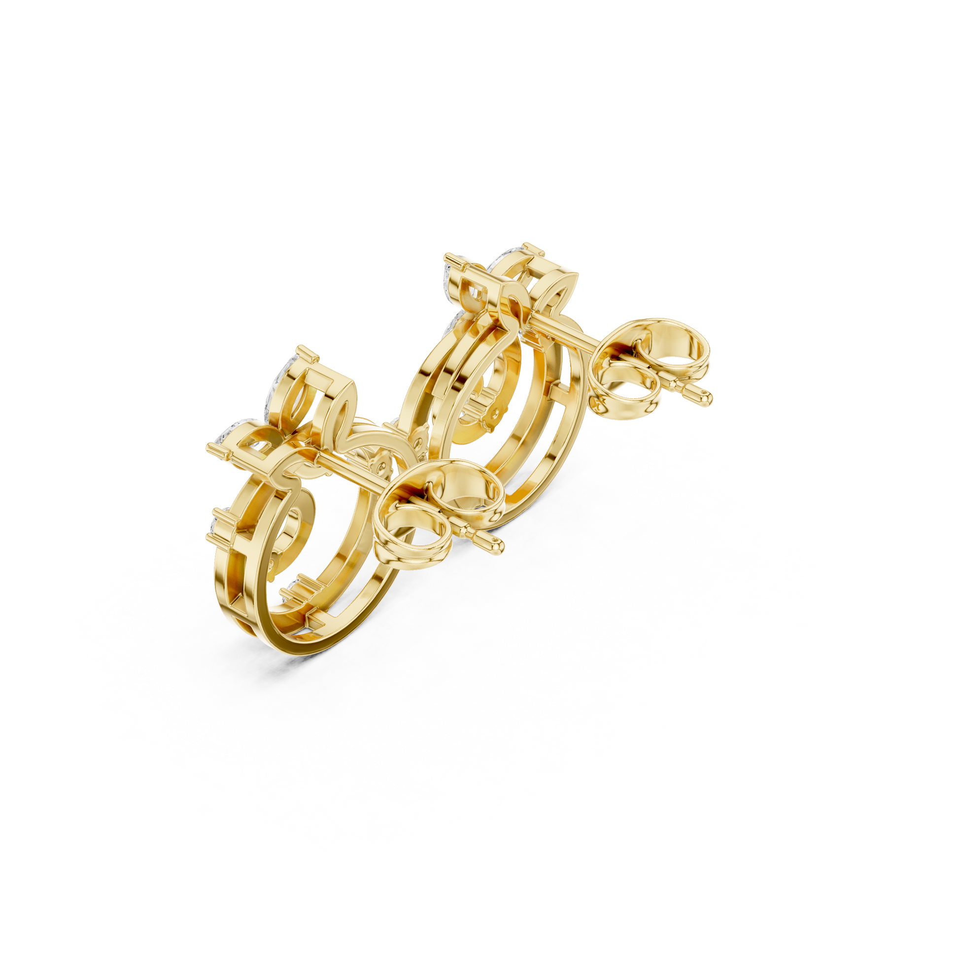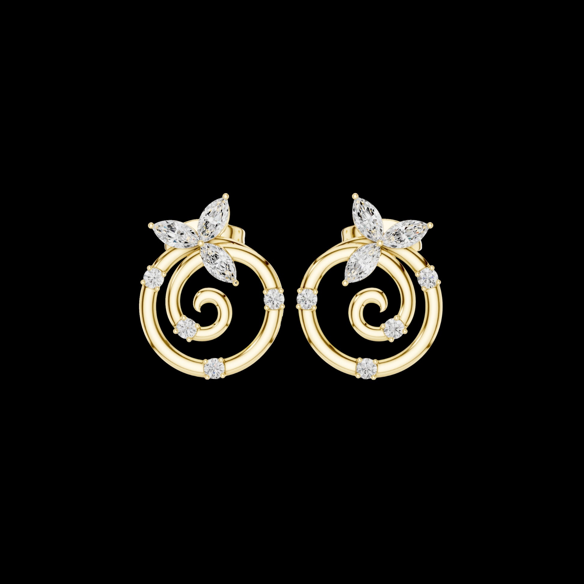 These refined earrings feature a graceful spiral design crafted in polished yellow gold, highlighted with sparkling round diamonds set along the curve. At the top, delicate marquise-cut diamond leaves add a natural, elegant touch that elevates the overall look. Perfect for special occasions or everyday luxury, these earrings blend timeless craftsmanship, brilliant shine, and modern elegance into one stunning pair.