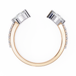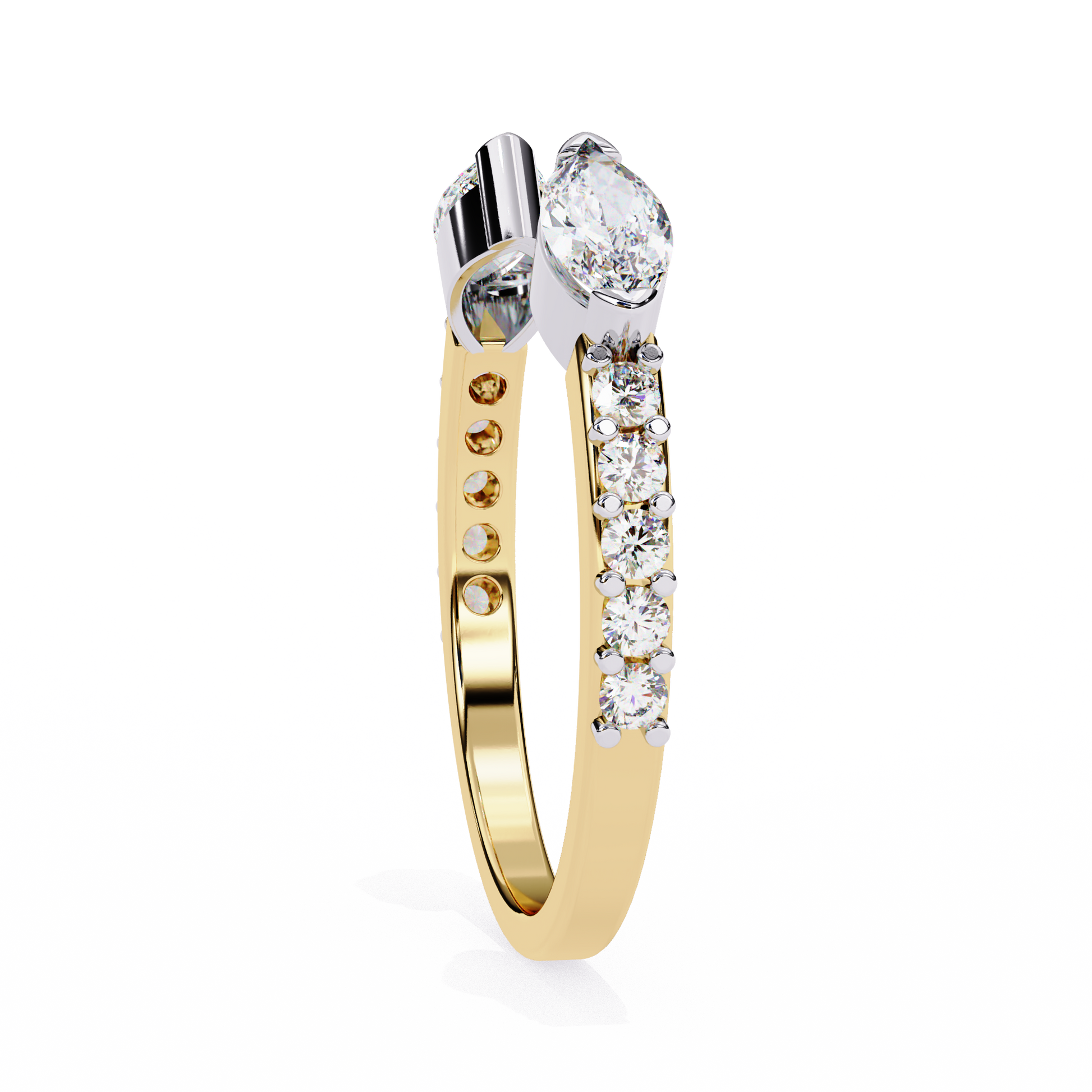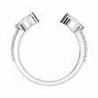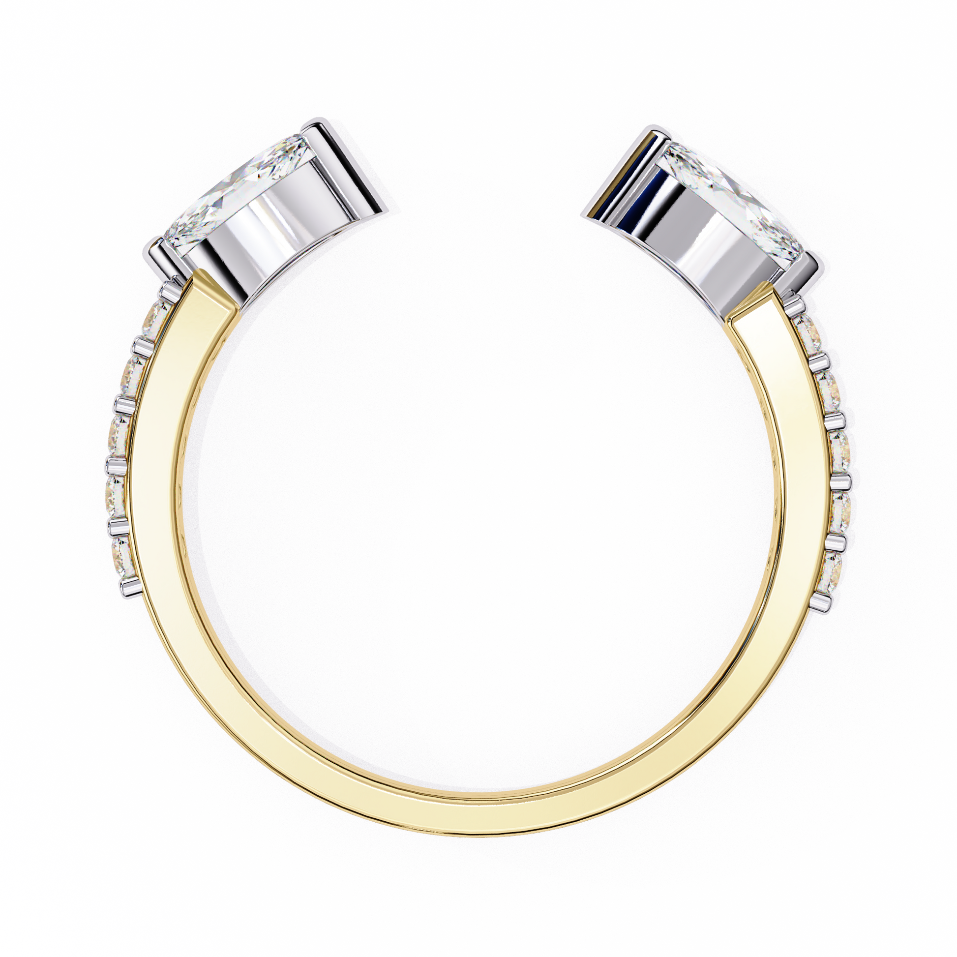 This striking open-style ring showcases a sleek gold band that curves gracefully toward two opposing marquise-cut diamonds, each set in polished metal for added brilliance and contrast. The tapered design draws the eye to the sparkling stones, creating a modern, sophisticated look that feels both bold and elegant. With its clean lines, refined craftsmanship, and luxurious dual-tone finish, this ring captures an exquisite balance of contemporary artistry and timeless glamour by Ivevar.