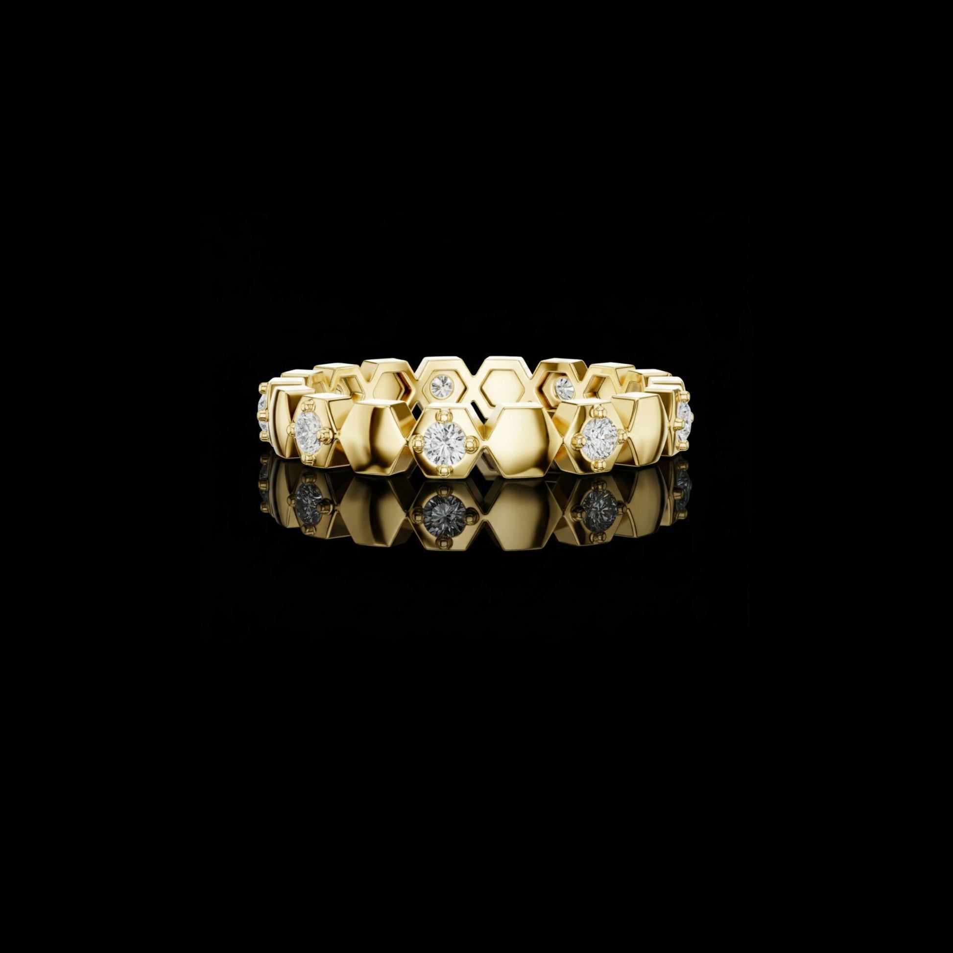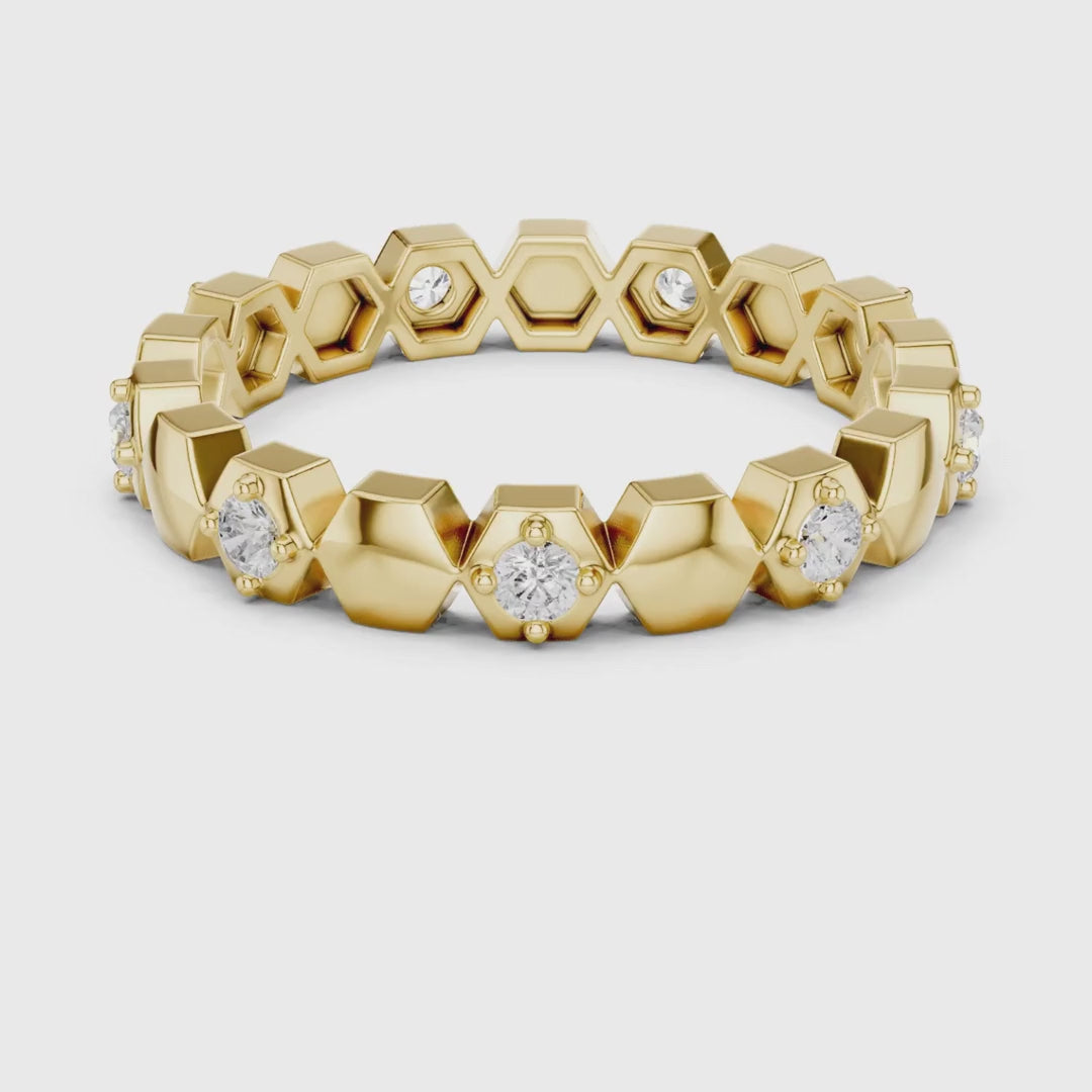 Elevate your style with this luxury geometric diamond band, crafted in rich high-polish gold and designed with a bold hexagon-inspired pattern. Each segment features brilliant round-cut diamonds, securely set to deliver exceptional sparkle, strength, and modern elegance.This ring blends contemporary design with timeless luxury, making it perfect for daily wear, anniversaries, weddings, or as a statement fashion piece.