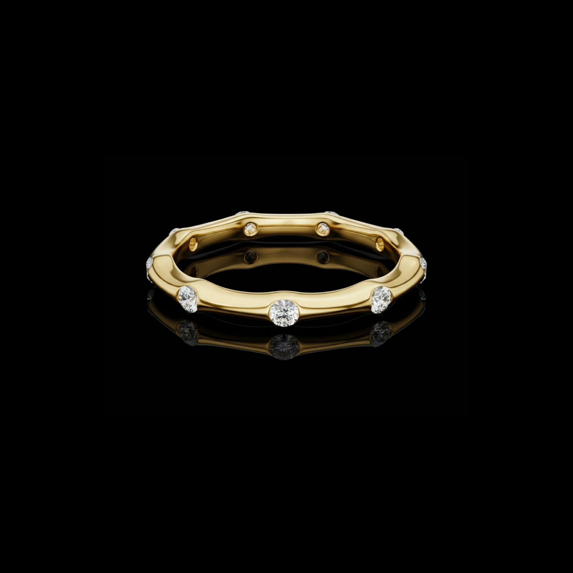 sleek and modern gold band features a unique, softly undulating design accented by evenly spaced round diamonds set flush into the metal. The subtle sparkle of the diamonds combined with the polished gold creates a refined and sophisticated look that works perfectly as a standalone statement or paired with other rings for a layered effect. Its minimalist yet elegant style makes it ideal for everyday wear or special occasions.