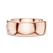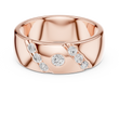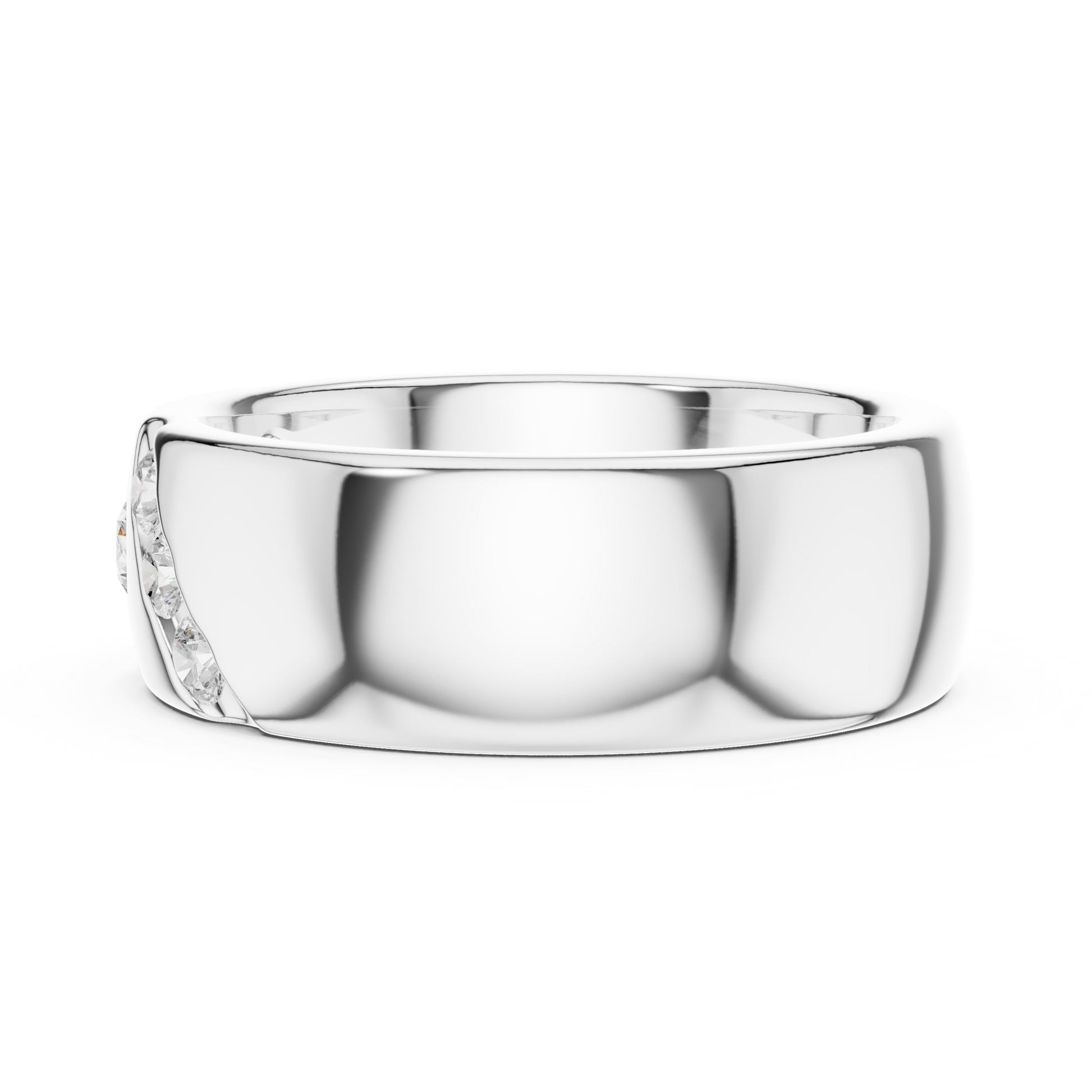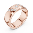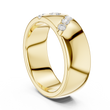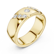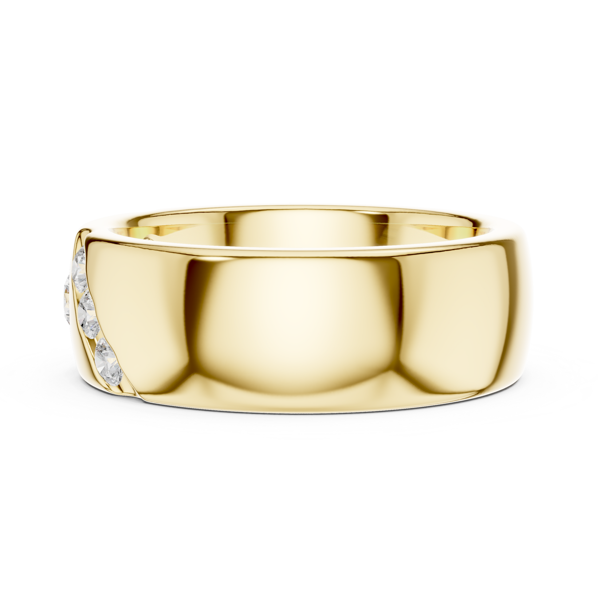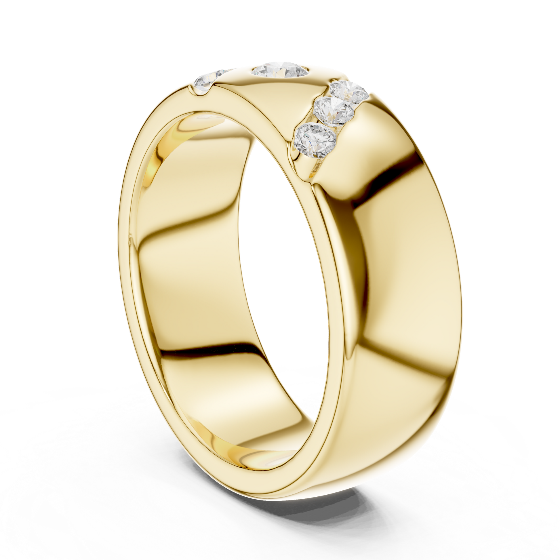 This distinctive gold ring features an organic, sculpted silhouette highlighted by bezel-set round diamonds arranged in an artistic, asymmetrical pattern. A brilliant central diamond anchors the design, while cascading accent diamonds add depth, movement, and contemporary flair. The high-polish gold surface enhances the fluid contours of the band, creating a bold yet refined statement that blends modern design with timeless luxury—perfect as a standout wedding band, anniversary ring, or signature piece for everyday sophistication.