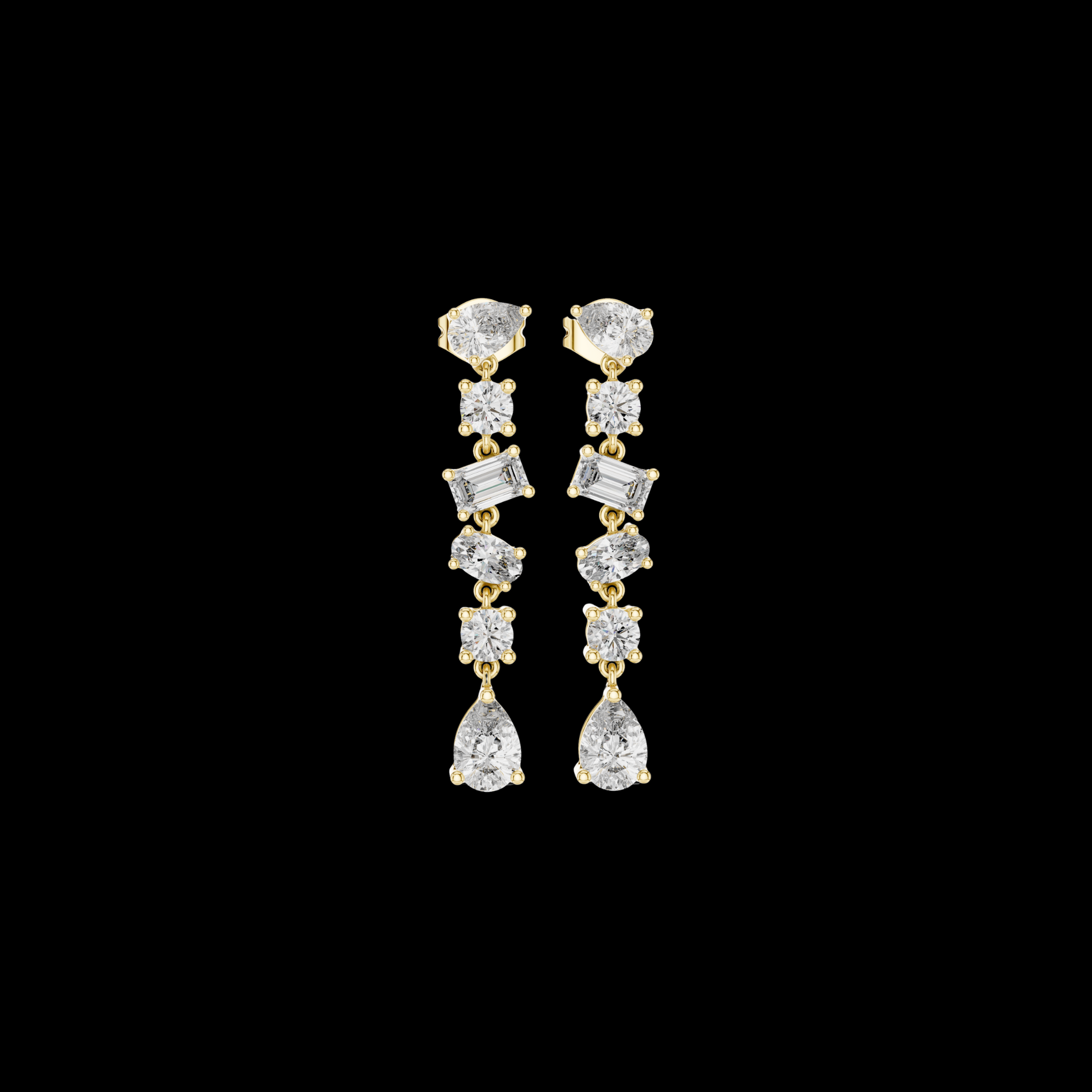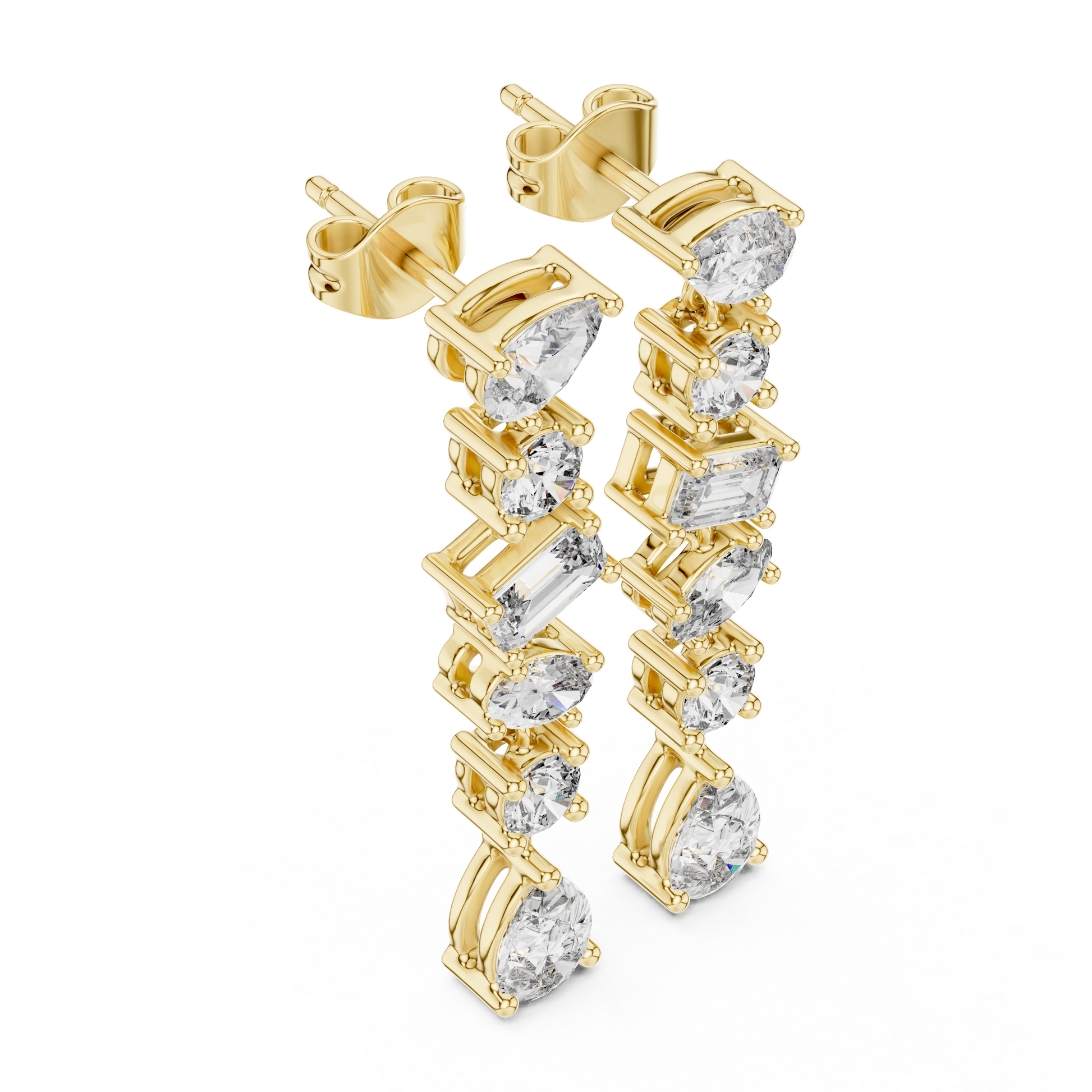 Designed to captivate with every movement, the Celestia Cascade Diamond Drop Earrings showcase a luxurious vertical arrangement of multi-shape diamonds, including pear, round, oval, and emerald cuts. Each stone is expertly prong-set i creating a graceful flow that elongates the silhouette and enhances brilliance.Perfect for formal evenings, weddings, or statement occasions, these earrings balance classic elegance with modern artistry. The cascading design reflects light beautifully, delivering exceptional sparkle, depth, and sophistication.