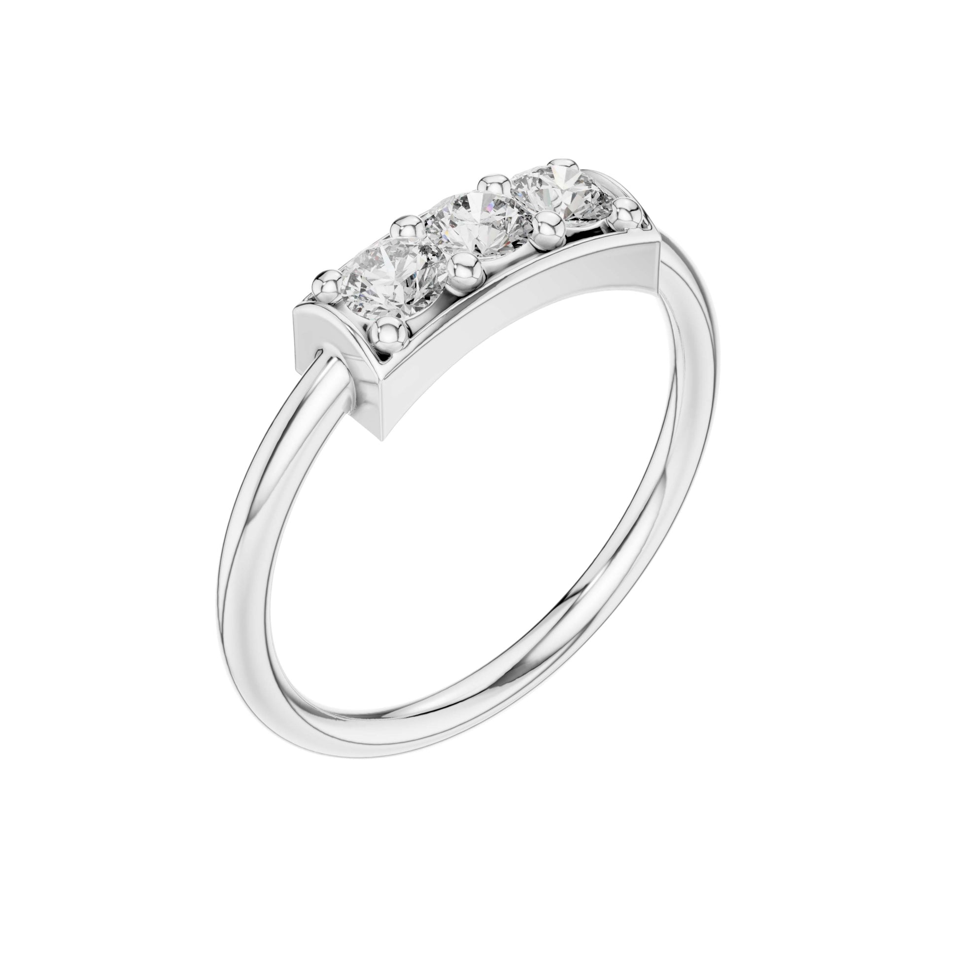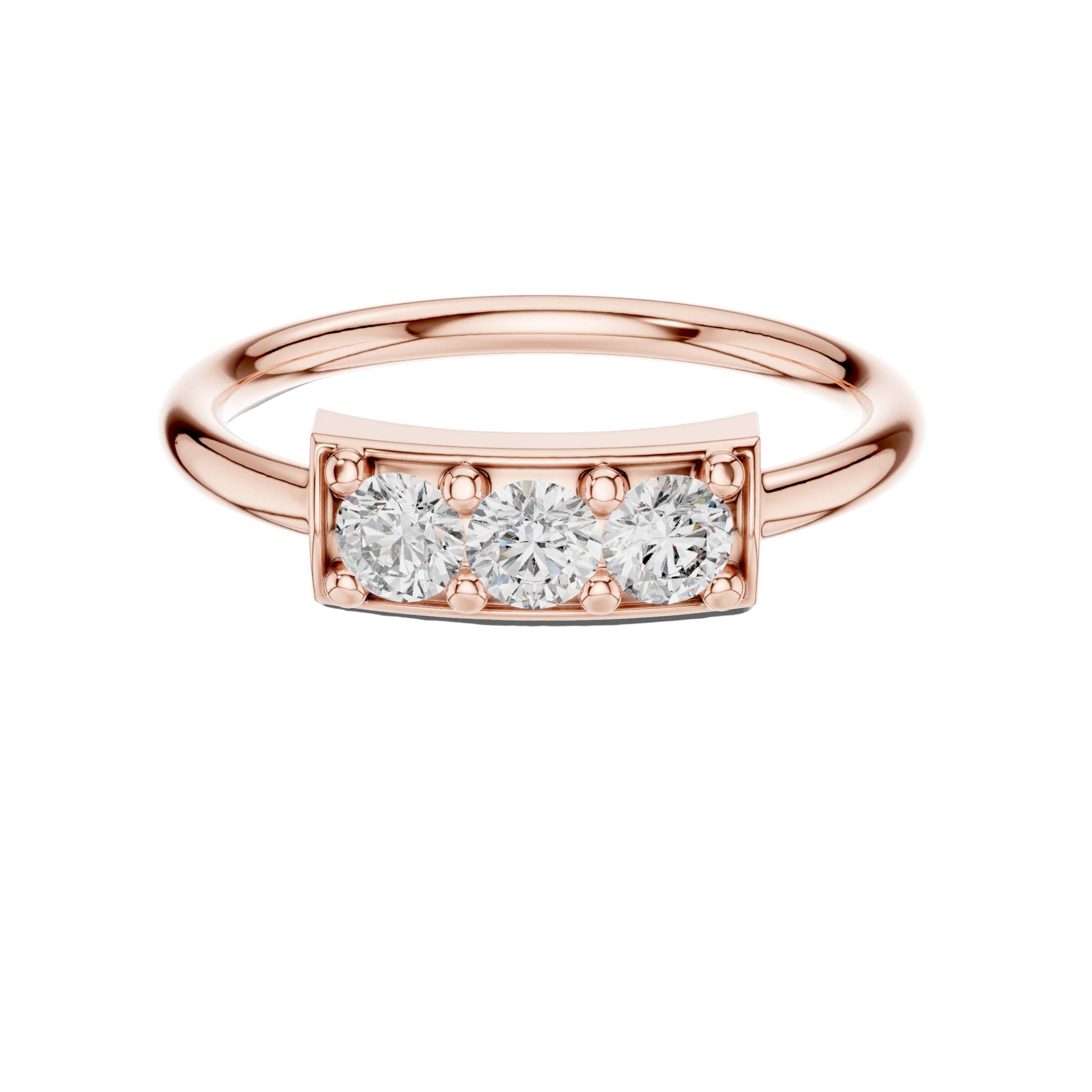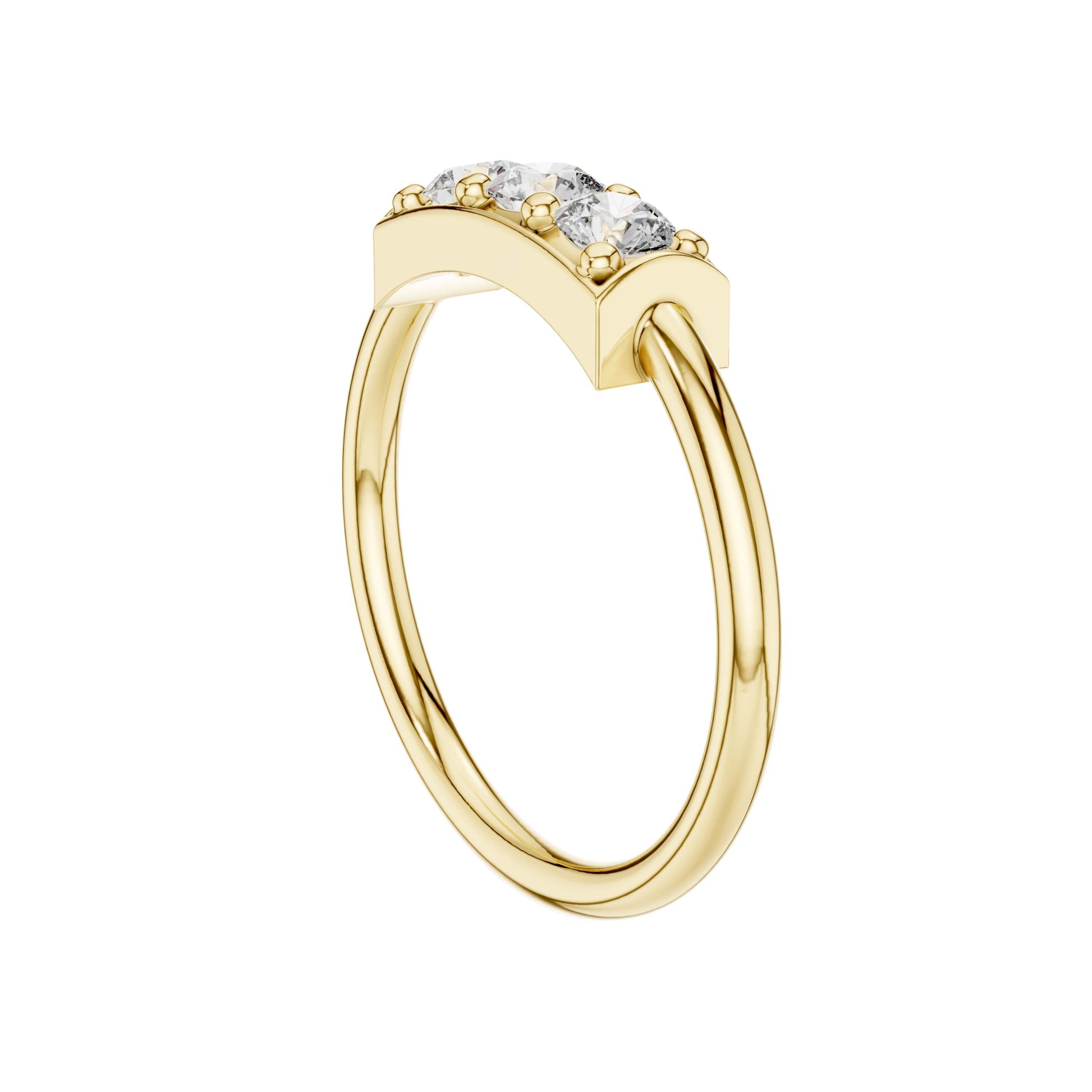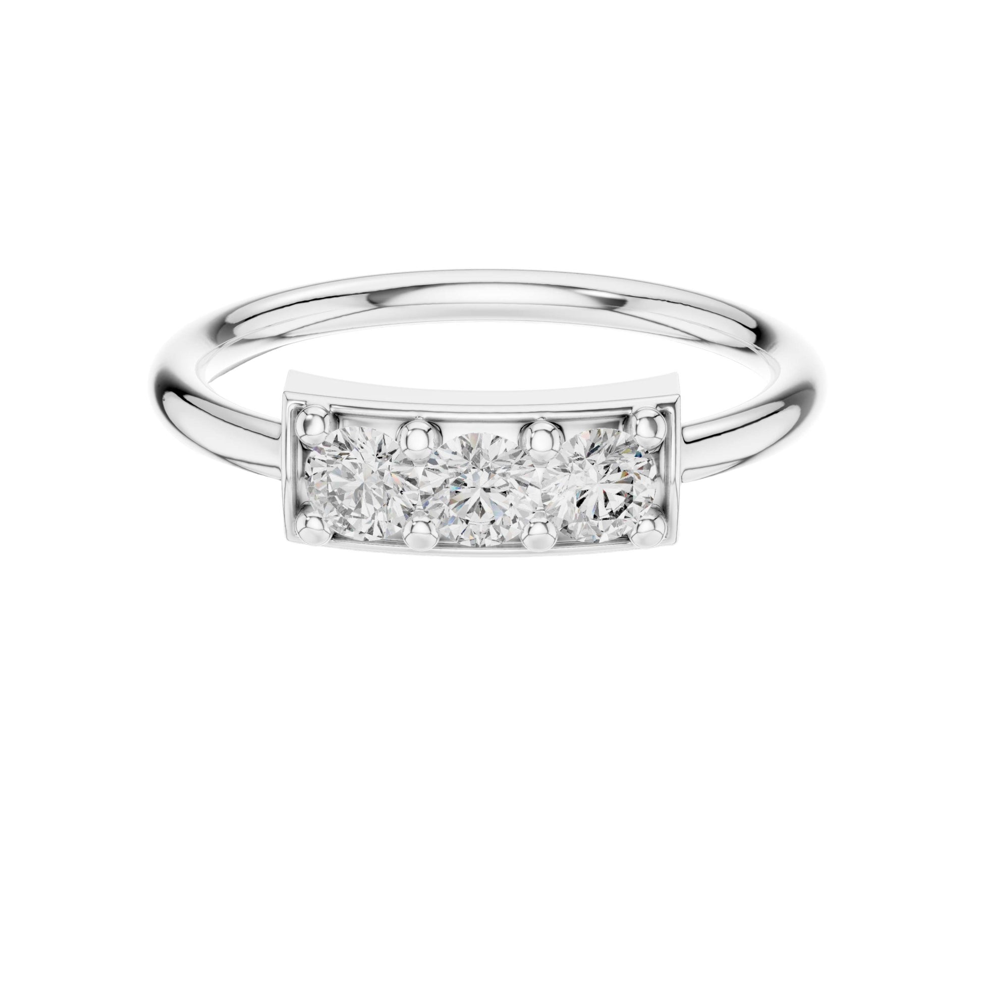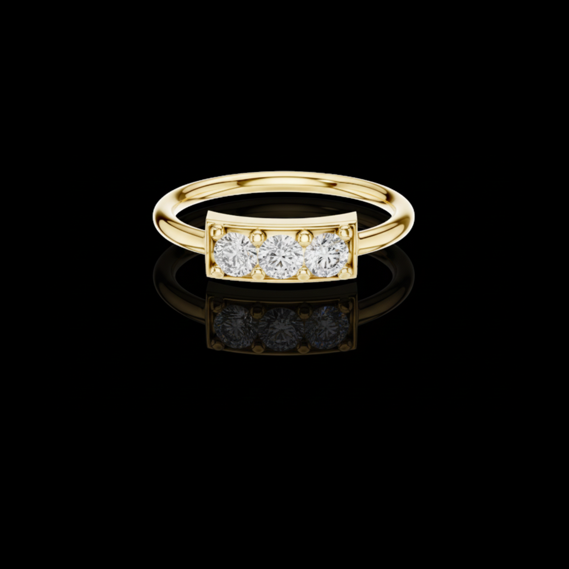 This timeless gold ring features a sleek horizontal bar setting showcasing three radiant round brilliant diamonds, creating a refined balance of modern structure and classic elegance. The polished gold band offers a smooth, comfortable fit, while the securely set diamonds deliver exceptional sparkle and symmetry. Perfect worn alone or stacked with other bands, this versatile design makes an ideal everyday luxury piece, anniversary ring, or meaningful gift that effortlessly blends sophistication with contemporary style.