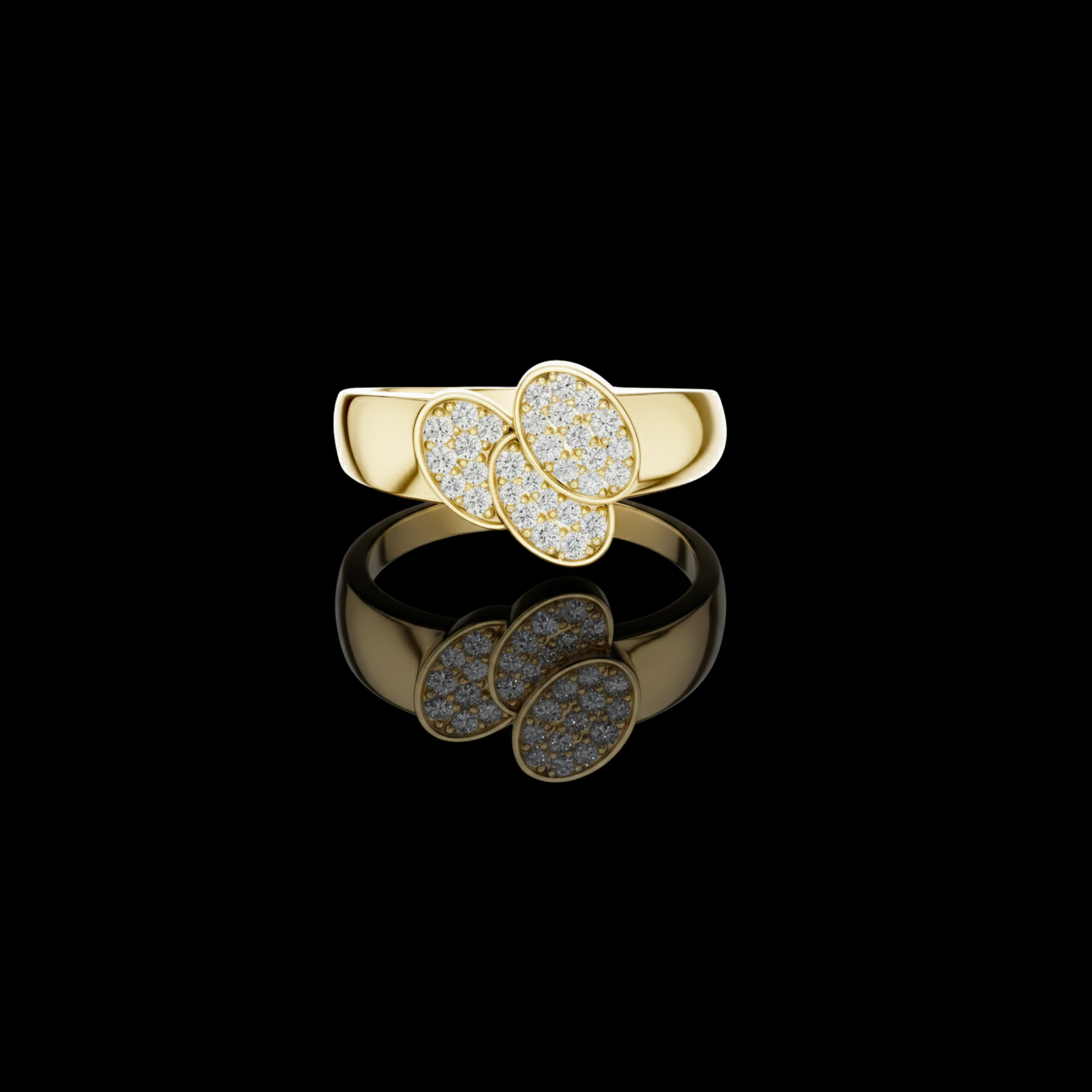 This elegant creation from IVEVAR LUXURY showcases a refined triple oval diamond cluster design crafted in rich gold. Three overlapping oval-shaped tops are beautifully set with shimmering pave diamonds, creating a graceful flow and exceptional sparkle from every angle. The smooth, wide gold band is polished to a mirror-like finish, offering both visual strength and everyday comfort.