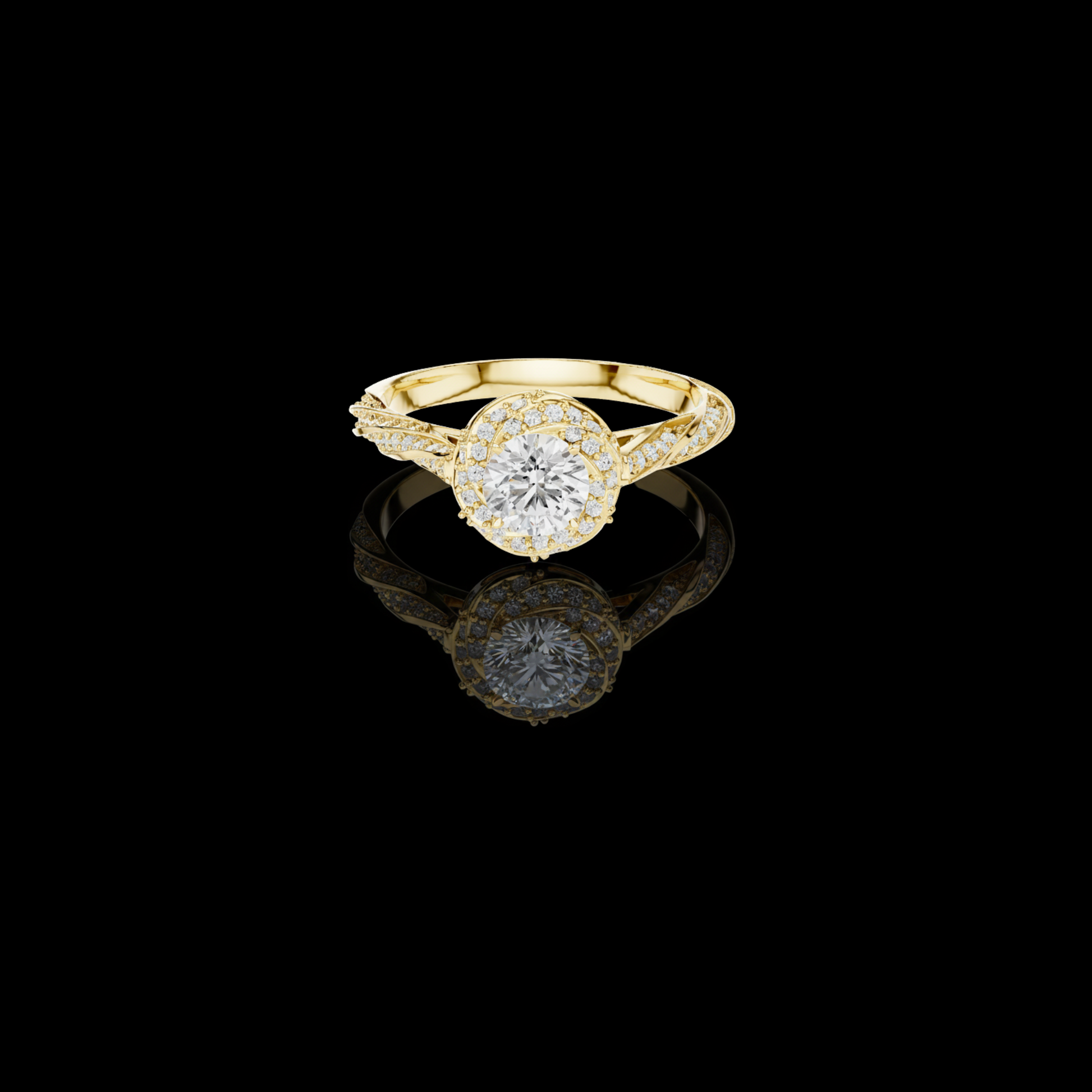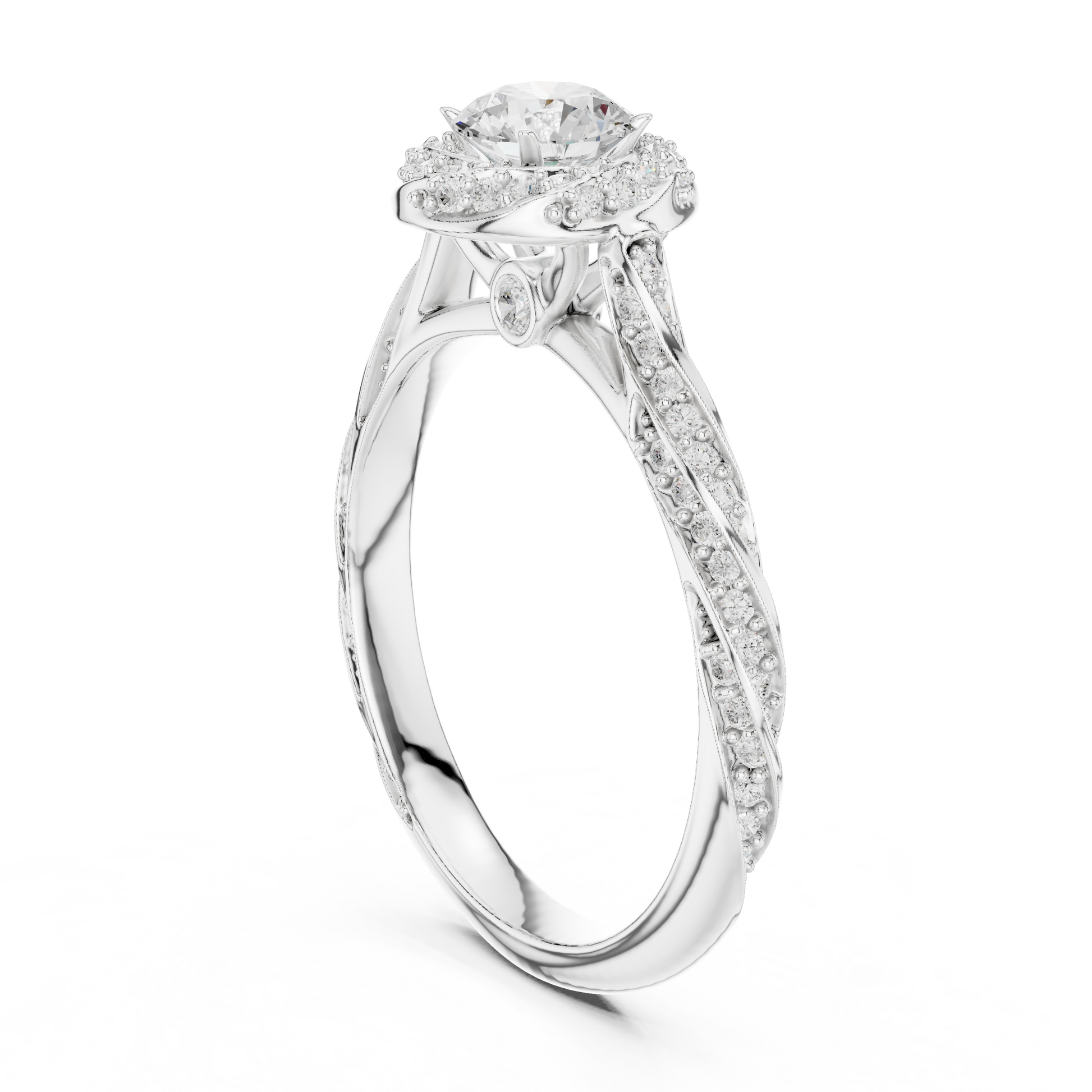 Grace meets brilliance in this elegantly sculpted halo diamond ring, designed to celebrate timeless beauty with a modern touch. The radiant round-cut center diamond is embraced by a fine pavé halo, amplifying its sparkle with every movement. A delicately twisted split band, accented with shimmering diamonds, flows gracefully into the centerpiece, creating a look of fluid sophistication and refined artistry.Crafted in this ring offers both luxury and comfort, making it perfect for everyday elegance or life’s most meaningful moments.