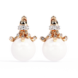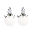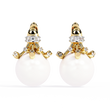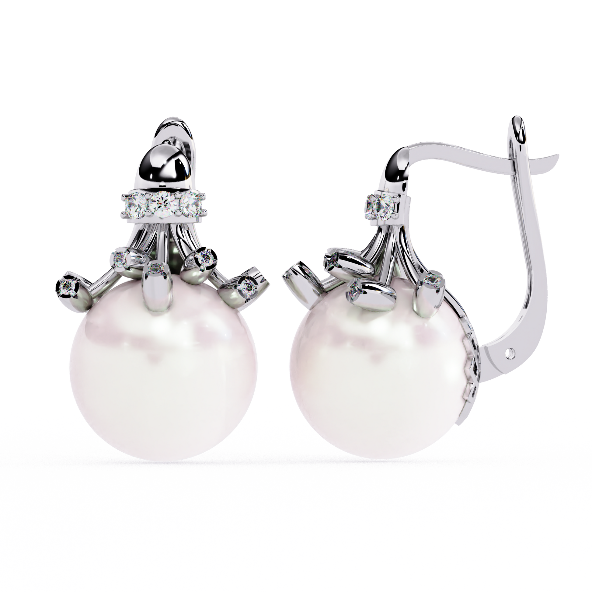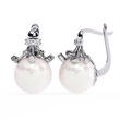 These elegant earrings feature luminous white pearls suspended from intricate gold settings adorned with sparkling round gemstones, creating a luxurious and timeless design. The gold detailing forms a delicate, crown-like structure around each pearl, adding sophistication and visual interest. The brilliant stones set above the pearls enhance their natural glow, making the earrings perfect for formal occasions or adding a touch of refinement to any outfit by Ivevar.