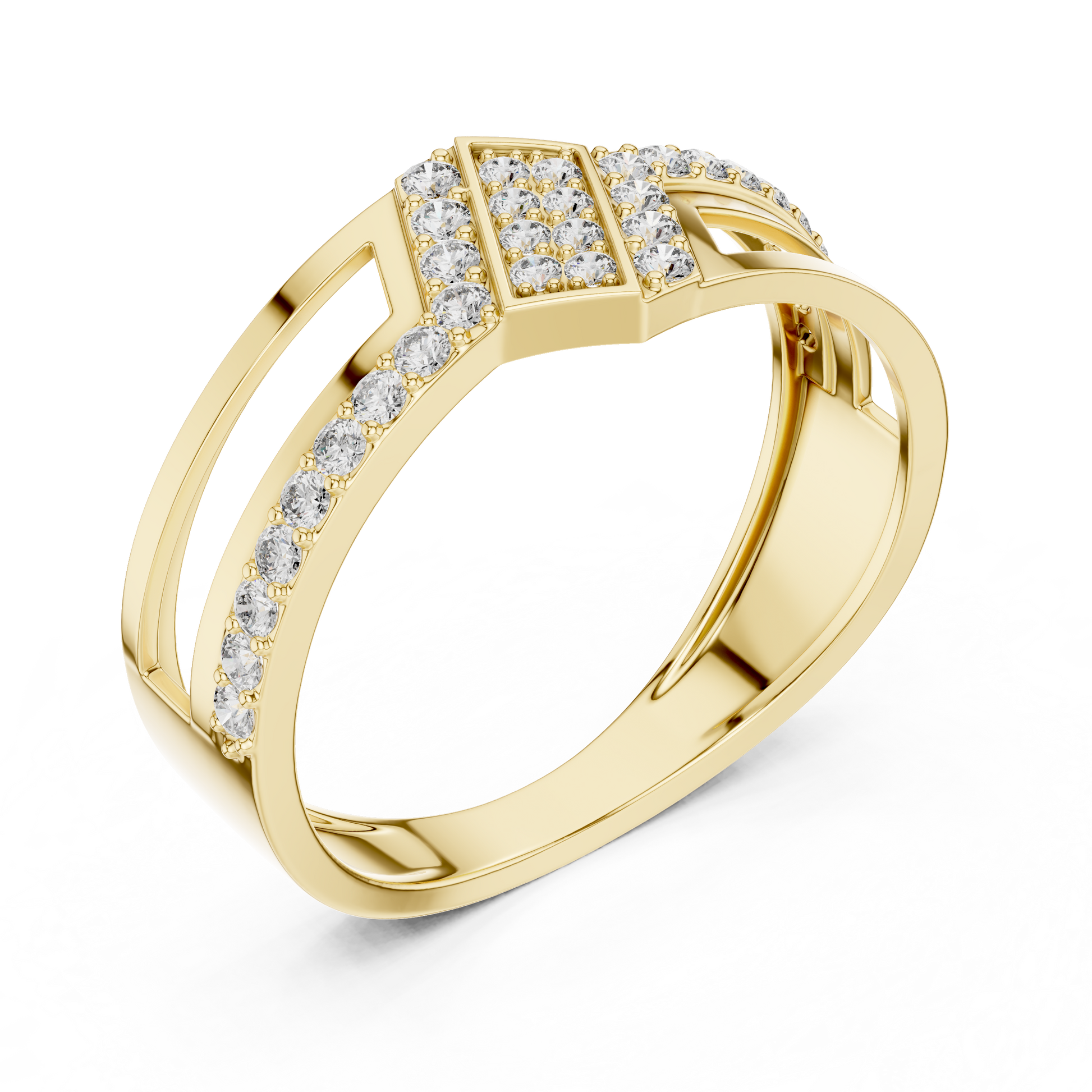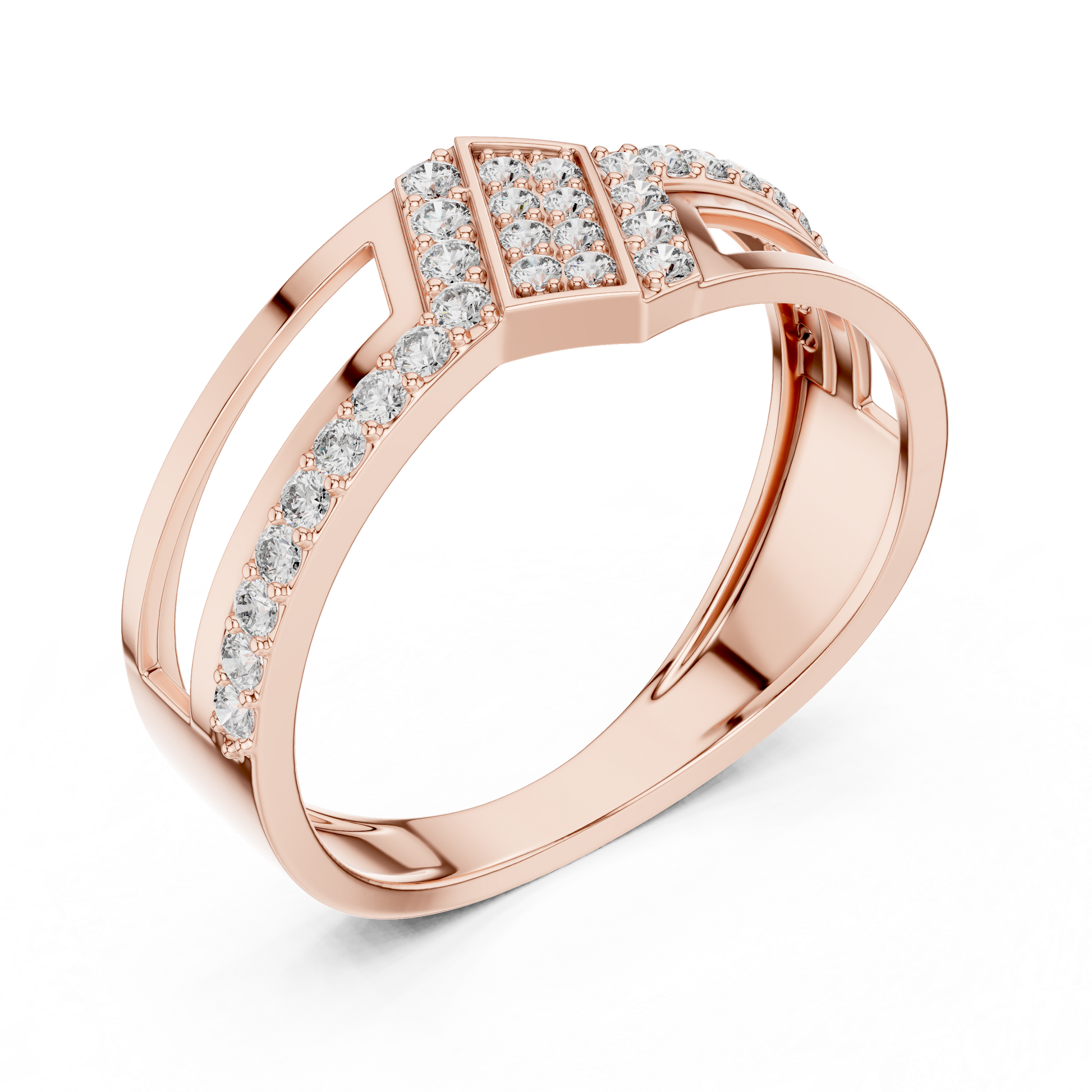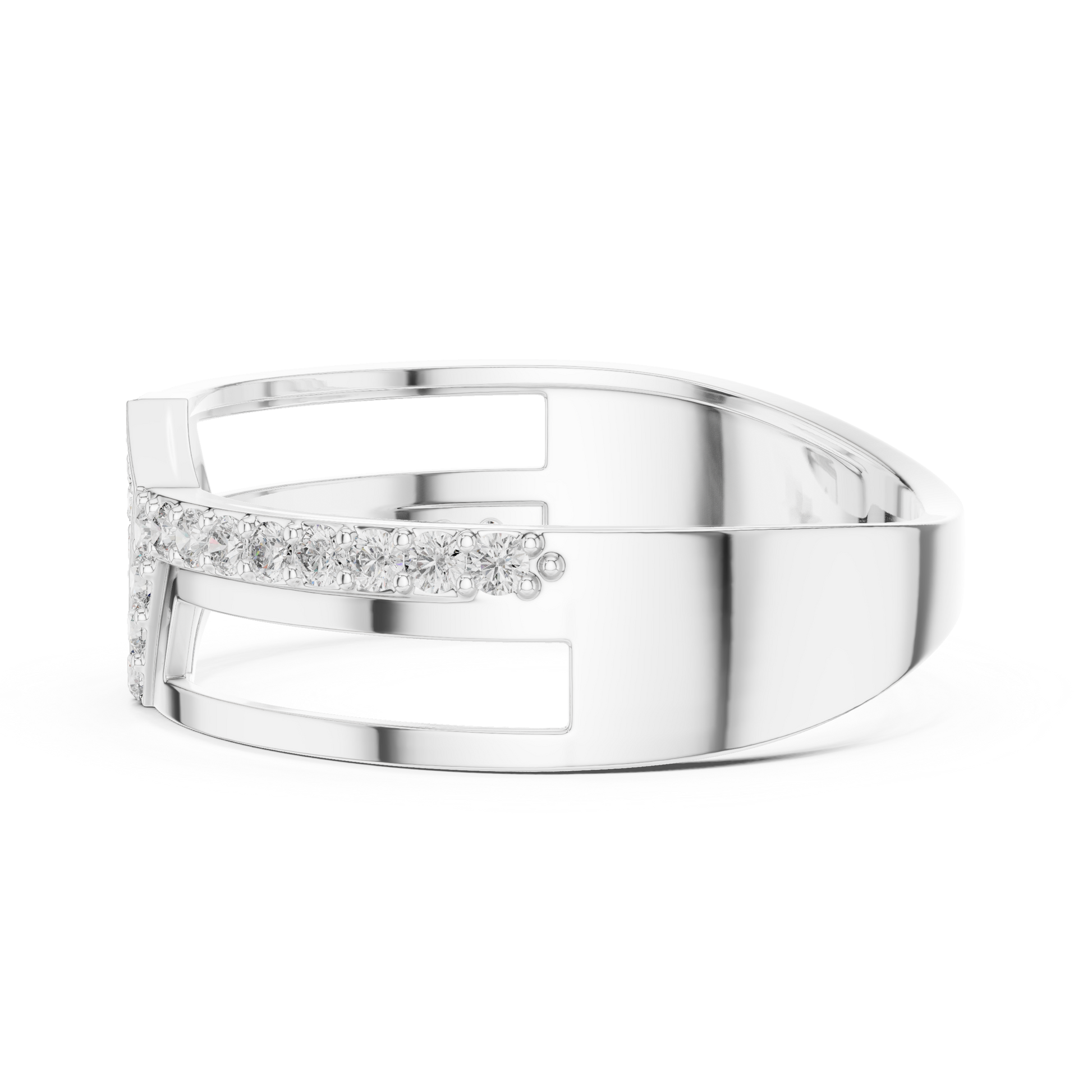 At Ivevar Luxury, this ring is designed to embody bold elegance and contemporary craftsmanship. the ring features a striking geometric openwork band accented with brilliant pave-set round diamonds that shimmer from every angle. The structured architectural design creates depth while maintaining a sleek, wearable silhouette. Perfect as a statement ring, luxury gift, or modern engagement-style band, this piece reflects confidence, refinement, and timeless luxury.