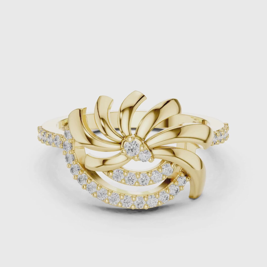 Inspired by the beauty of a blossoming flower in motion, this exquisitely sculpted ring features gracefully curved petal-like forms that spiral around a luminous central diamond. A trail of pavé-set diamonds enhances the flowing design, adding depth, brilliance, and refined luxury. The harmonious blend of organic floral artistry and modern craftsmanship makes this ring a striking statement of femininity, confidence, and enduring beauty—perfect for those who appreciate distinctive fine jewelry with artistic expression.