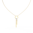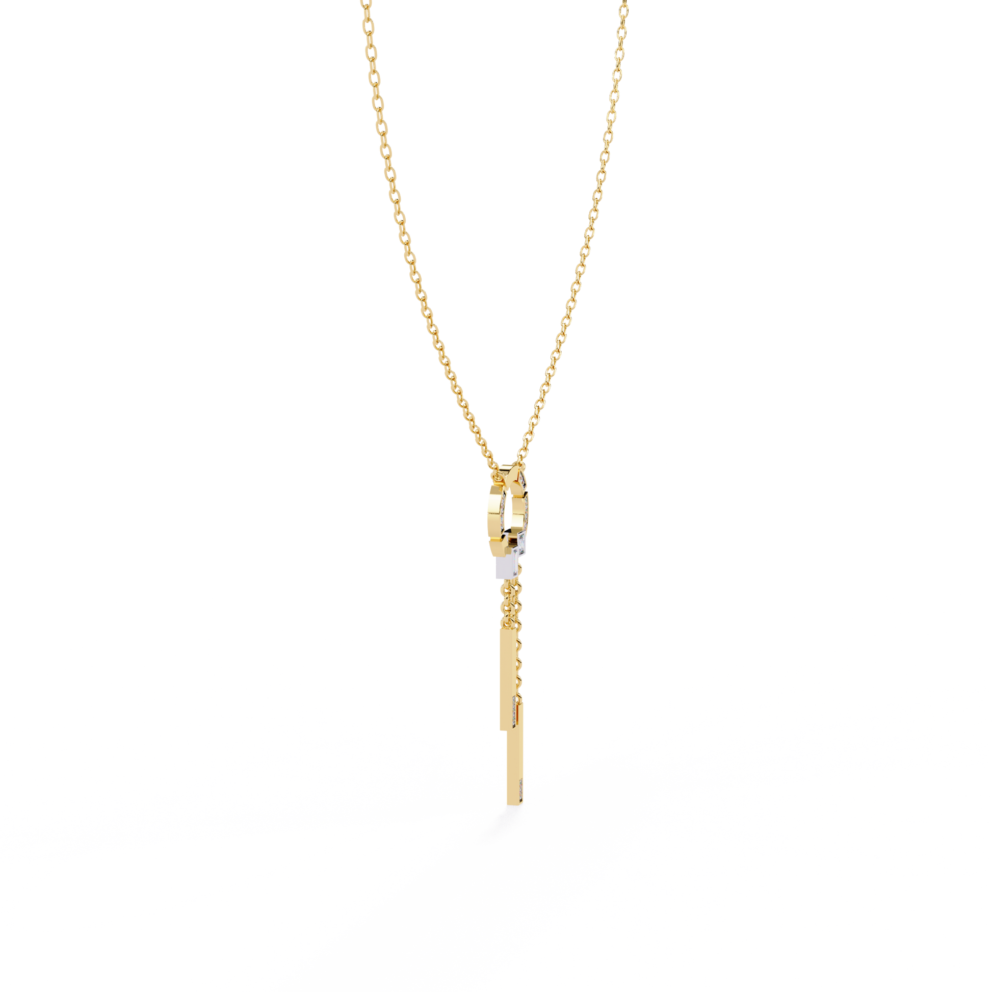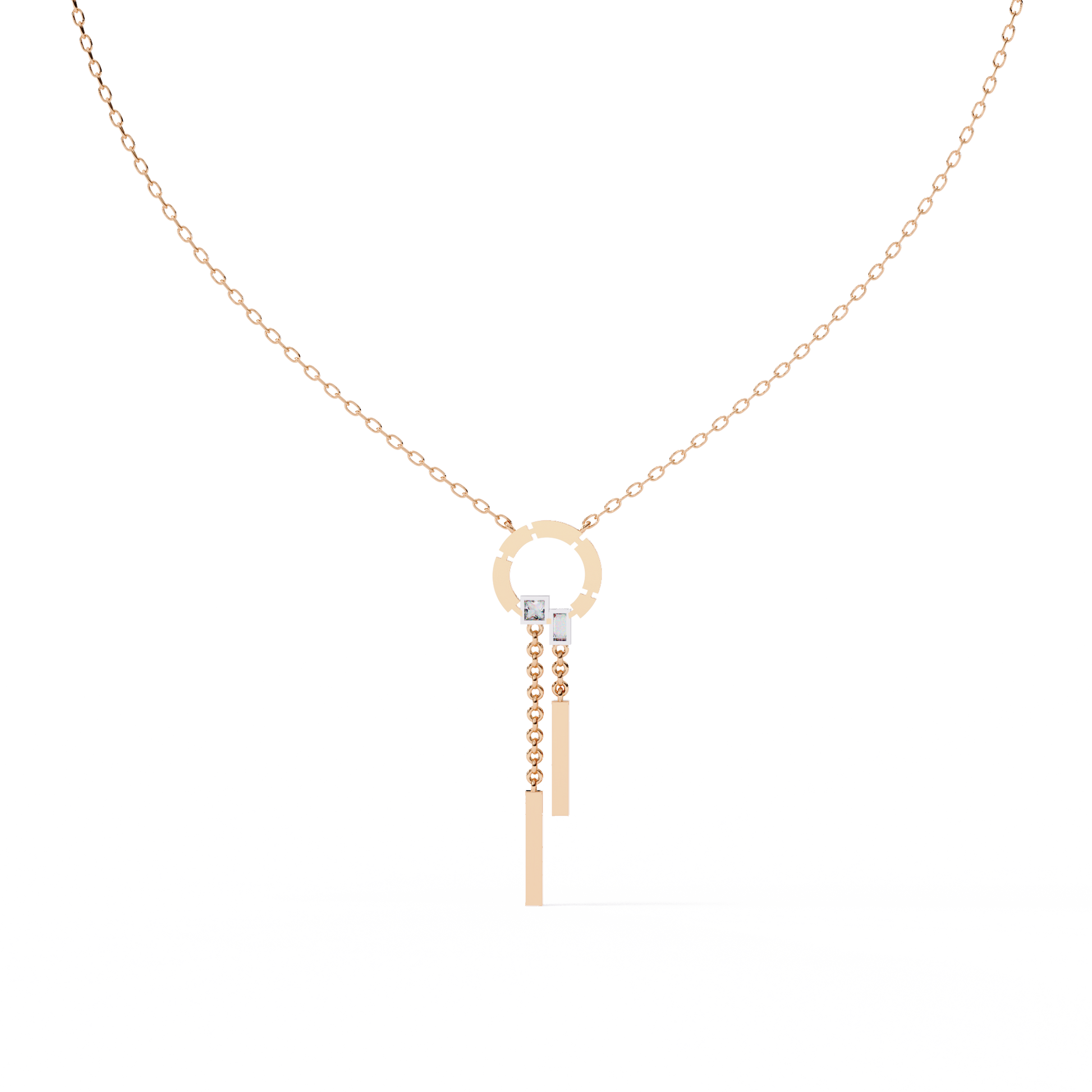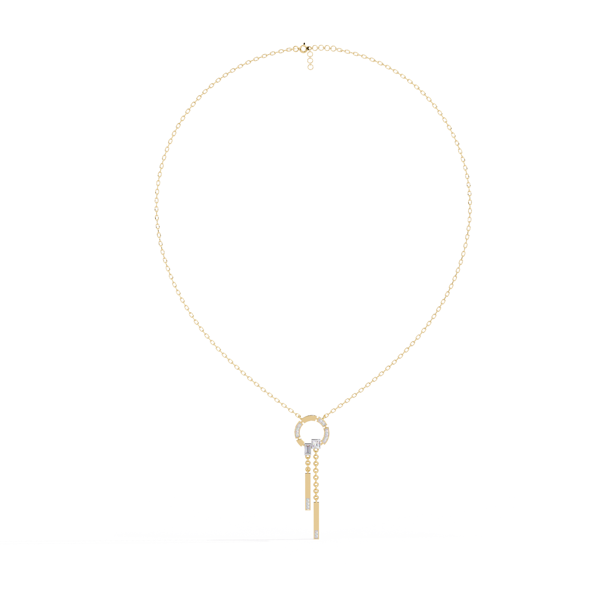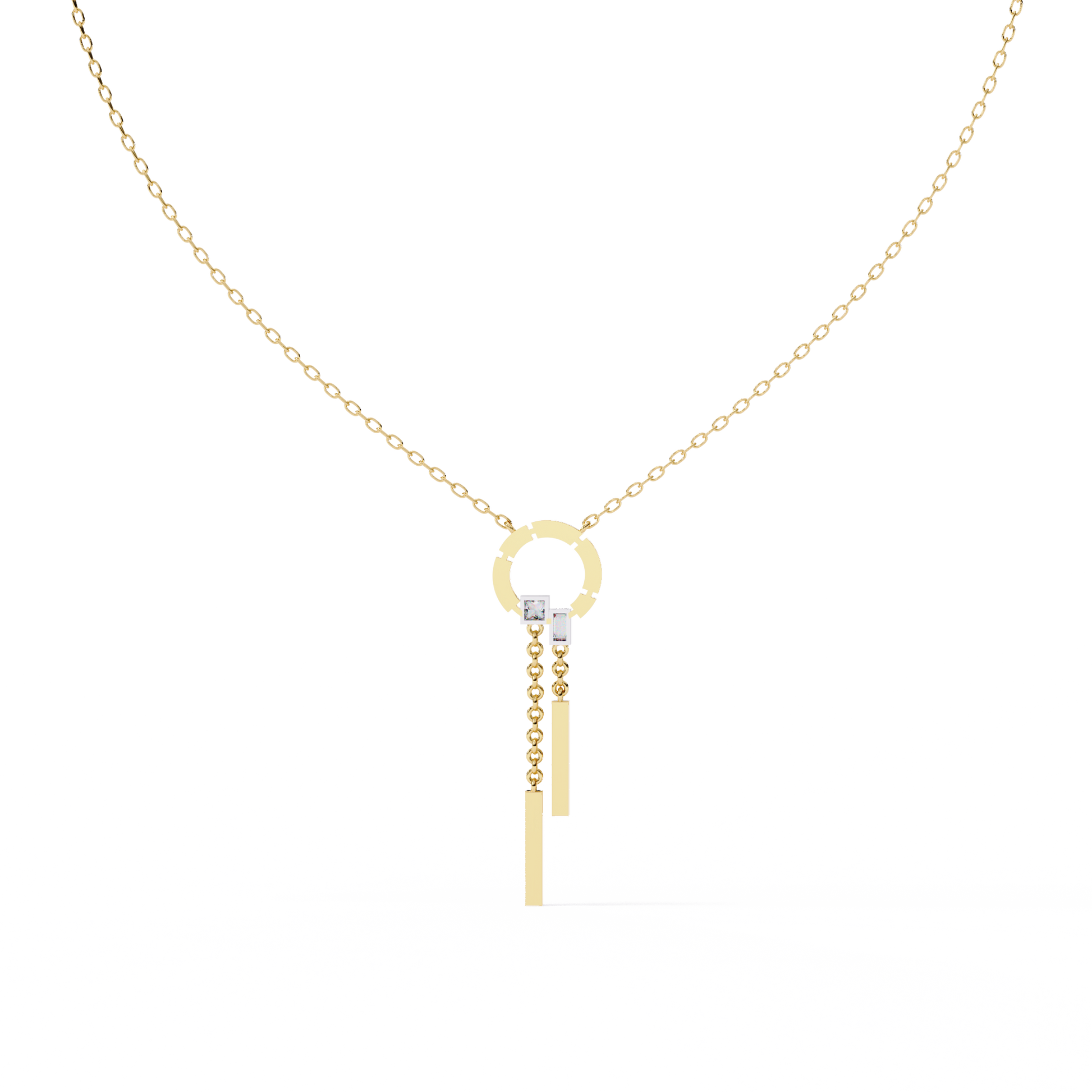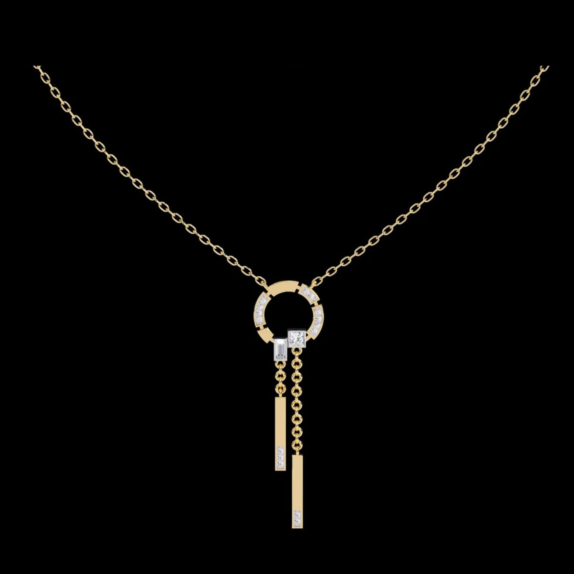 This modern geometric necklace beautifully blends elegance and sophistication, making it a standout accessory for any occasion. Designed with a circle pendant accented by round, princess and baguette-cut stones, it exudes a refined sparkle that catches every angle of light. The pendant gracefully suspends from a delicate chain, featuring two vertical bar drops that add a contemporary edge to the timeless design. Perfect for elevating both casual and formal looks, this necklace is a statement of modern luxury and minimalistic charm a must-have piece for women who appreciate fine craftsmanship and unique style by Ivevar luxury.