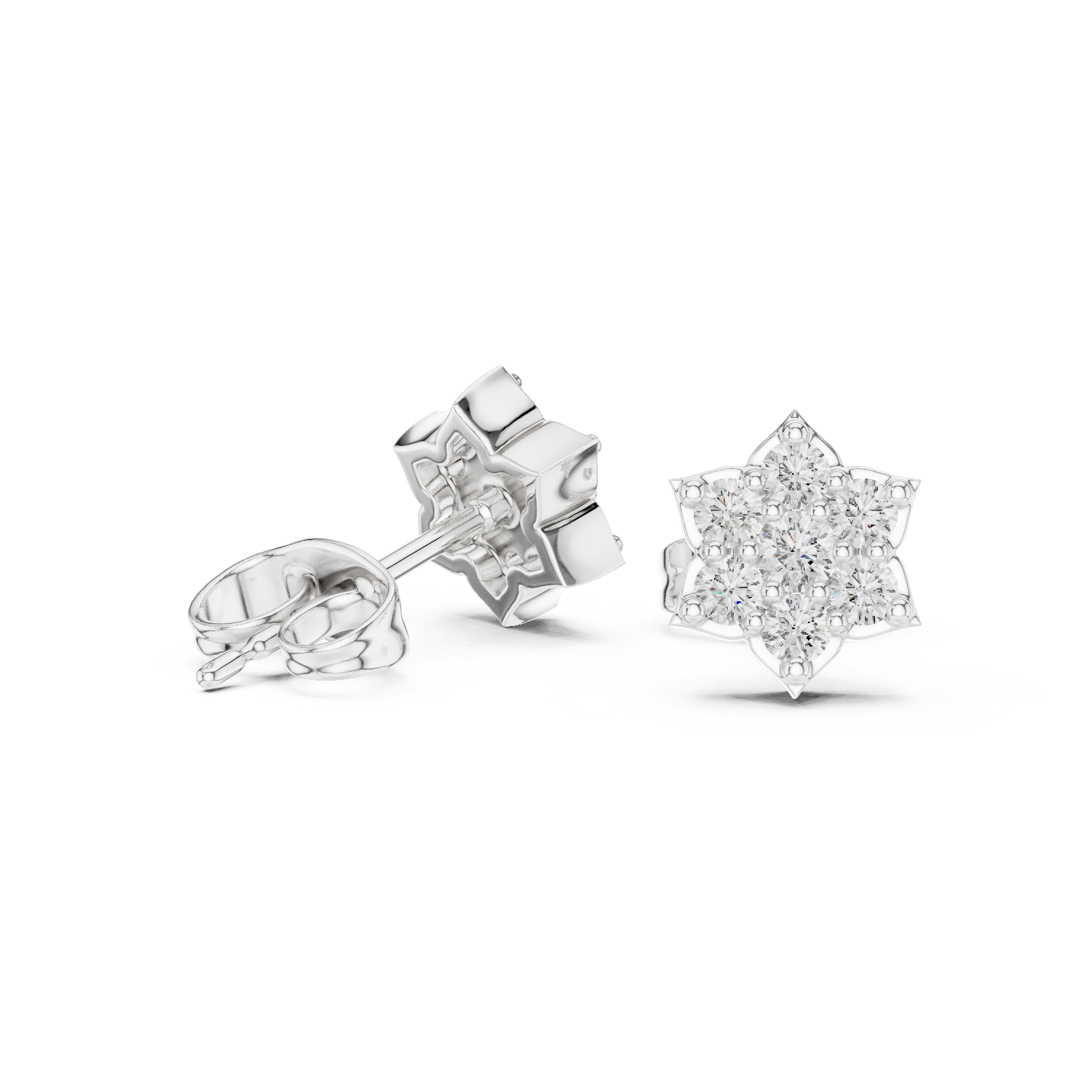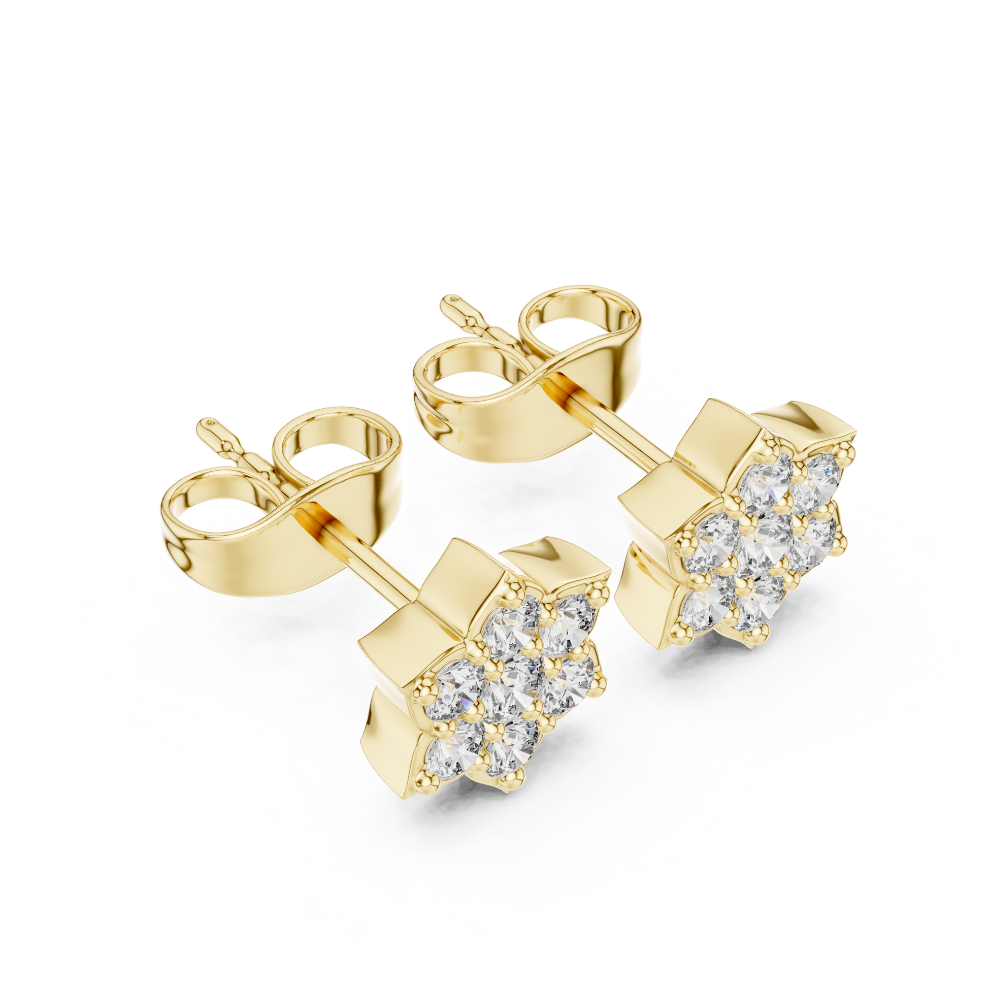 The Starpetal Radiance Gold Stud Earrings feature a striking floral form defined by elegant pointed petals and a brilliant round diamond cluster center. Each round diamond is meticulously placed to create a star-like bloom, enhanced by a high-polish gold setting that adds depth and structure. This bold yet refined design delivers exceptional sparkle while maintaining a balanced, wearable profile. Ideal for those who love distinctive luxury, these studs make a confident statement from day to evening.