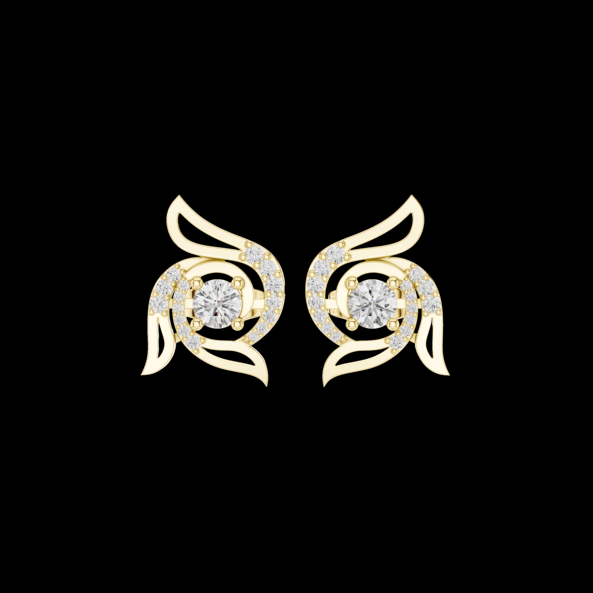 These beautifully designed earrings feature a round-cut center diamond embraced by a graceful swirl motif with wing-inspired gold accents. Crafted in radiant yellow gold and highlighted with pavé-set diamonds, the design reflects movement, elegance, and luxury. Perfect for those who love artistic fine jewelry, these studs add a distinctive sparkle to both everyday looks and special occasions.