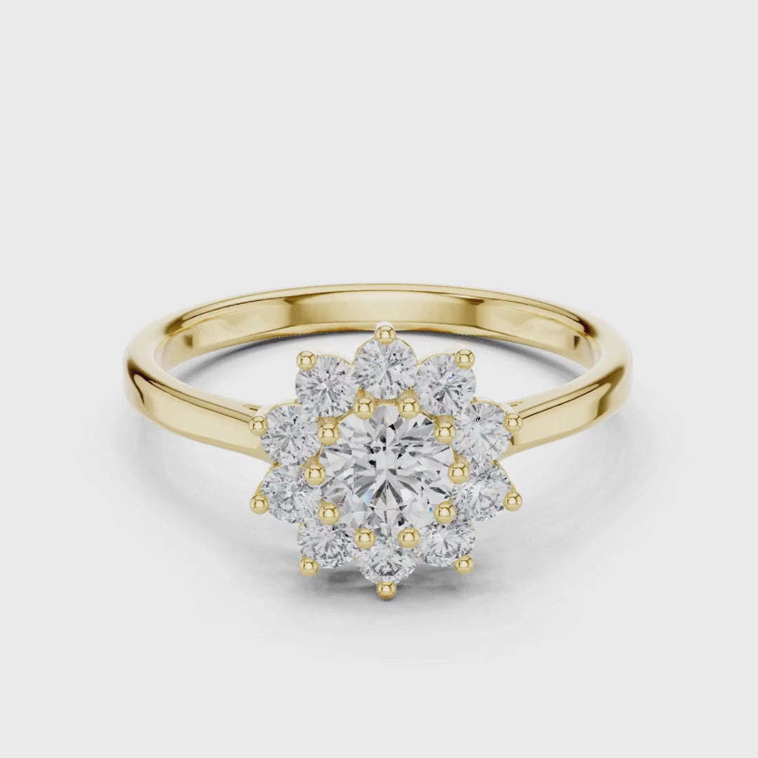 This elegant gold ring showcases a radiant round diamond at its heart, encircled by a sparkling floral halo of perfectly matched round diamonds that create a captivating bloom effect. The polished gold band adds warmth and contrast, enhancing the brilliance of the clustered stones while maintaining a timeless, refined silhouette. Designed to catch the light from every angle, this ring blends classic romance with a distinctive floral-inspired setting, making it a stunning choice for an engagement or a meaningful celebration.