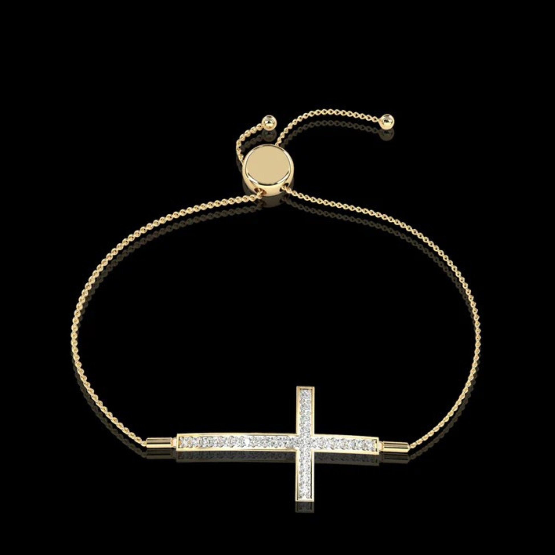 Radiating understated elegance, this Diamond Pave Cross Adjustable Gold Bracelet features a refined horizontal cross adorned with shimmering pavé-set diamonds. Crafted with a smooth, adjustable slider chain for a perfect, comfortable fit, it blends modern minimalism with timeless symbolism. A graceful piece designed for everyday sophistication or meaningful gifting, it adds a touch of luminous beauty to any jewelry collection.