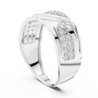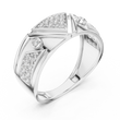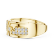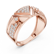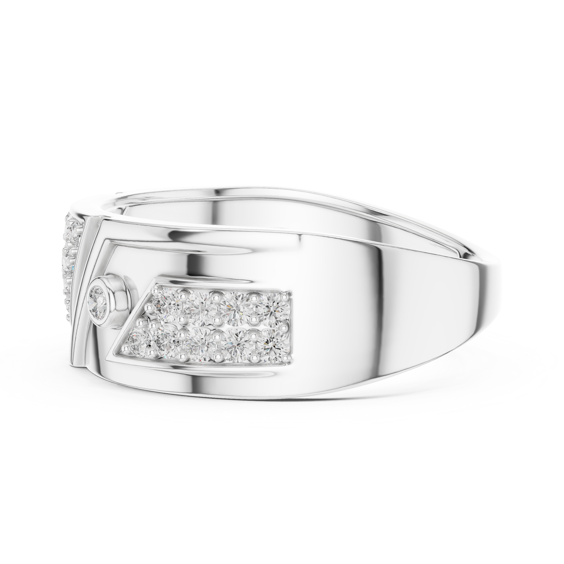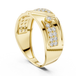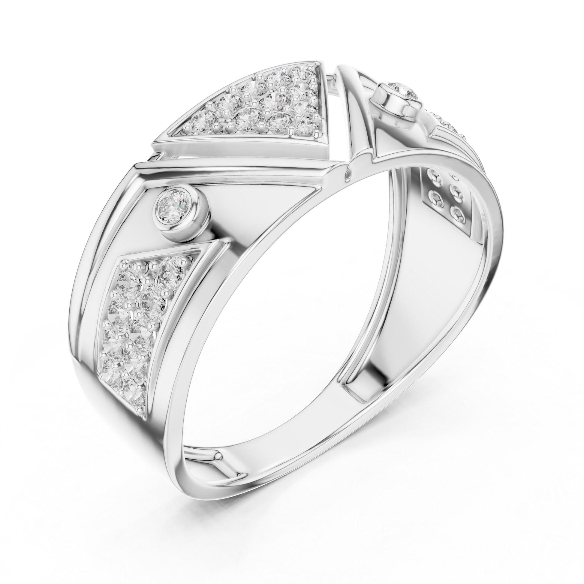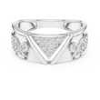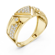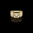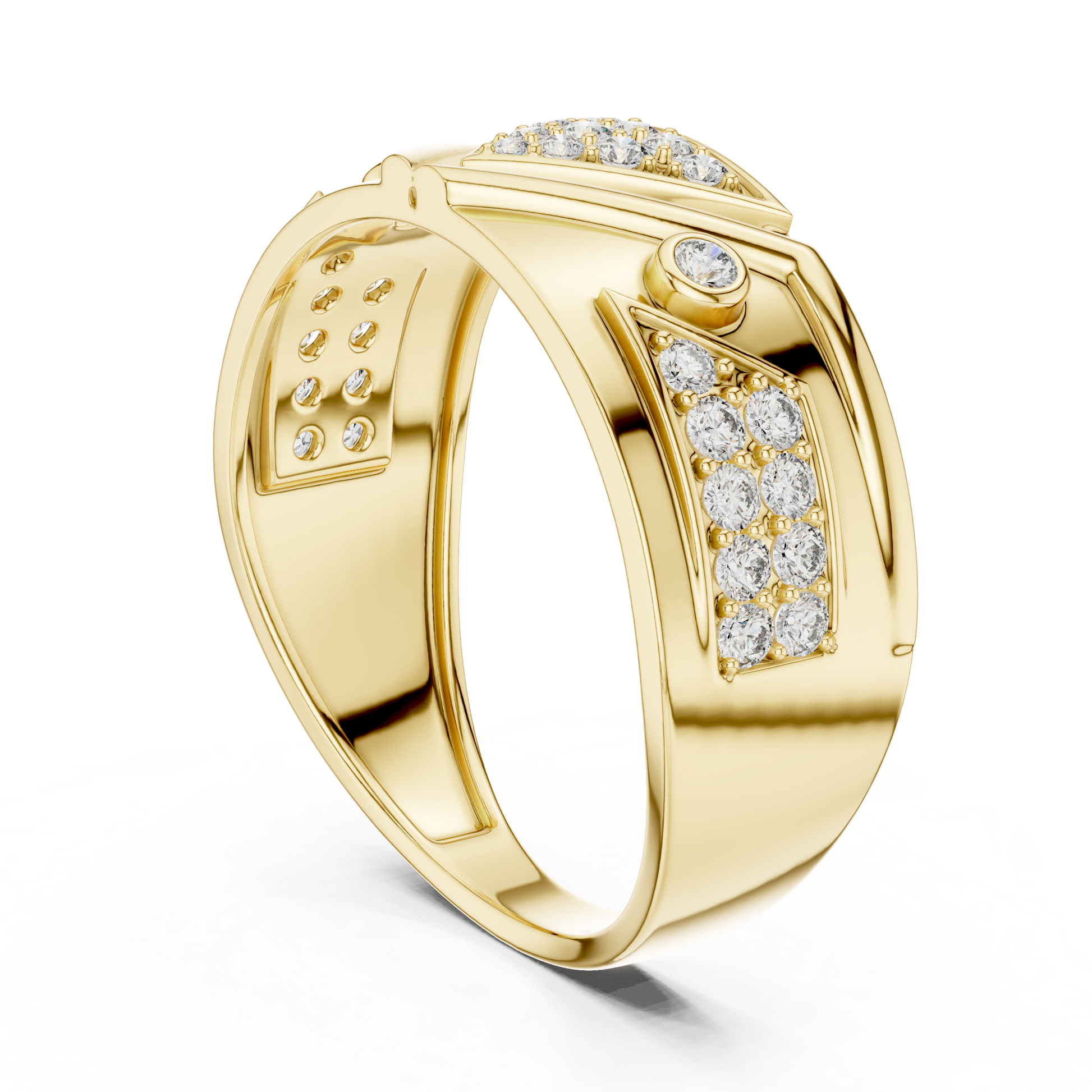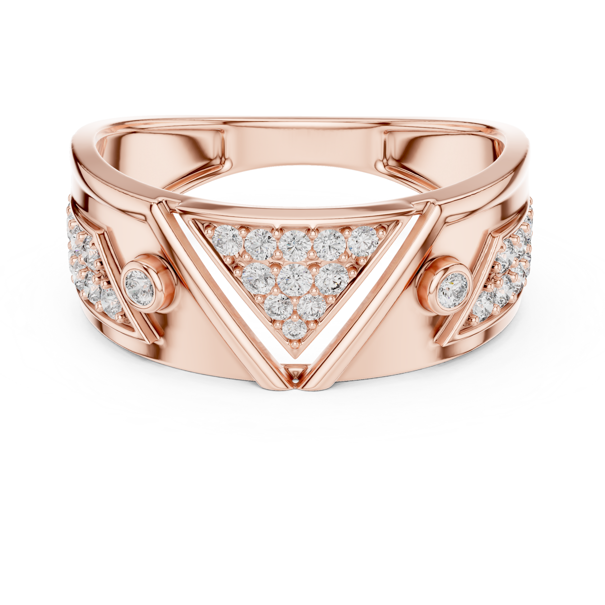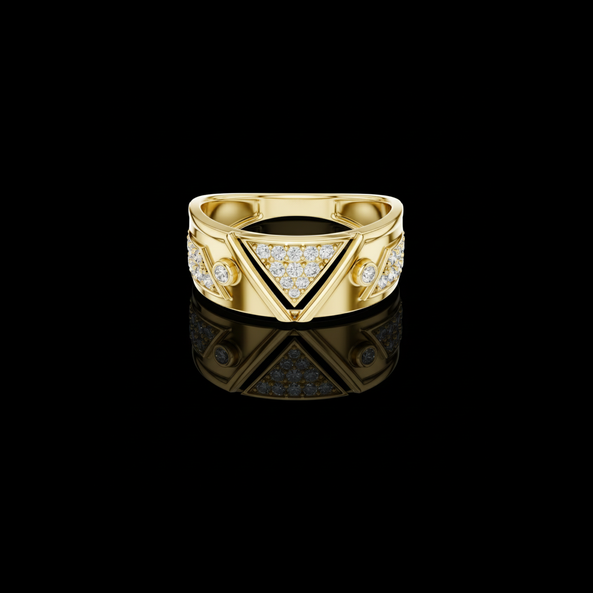This striking geometric ring from IVEVAR LUXURY showcases a bold architectural design. The centerpiece features a unique inverted triangle pave diamond cluster that draws the eye with brilliant symmetry, while matching diamond-set side panels and bezel-set round diamonds add depth and dimension. A wide, high-polish gold band enhances the modern aesthetic, offering both durability and a smooth, comfortable fit. Designed for those who appreciate contemporary luxury.