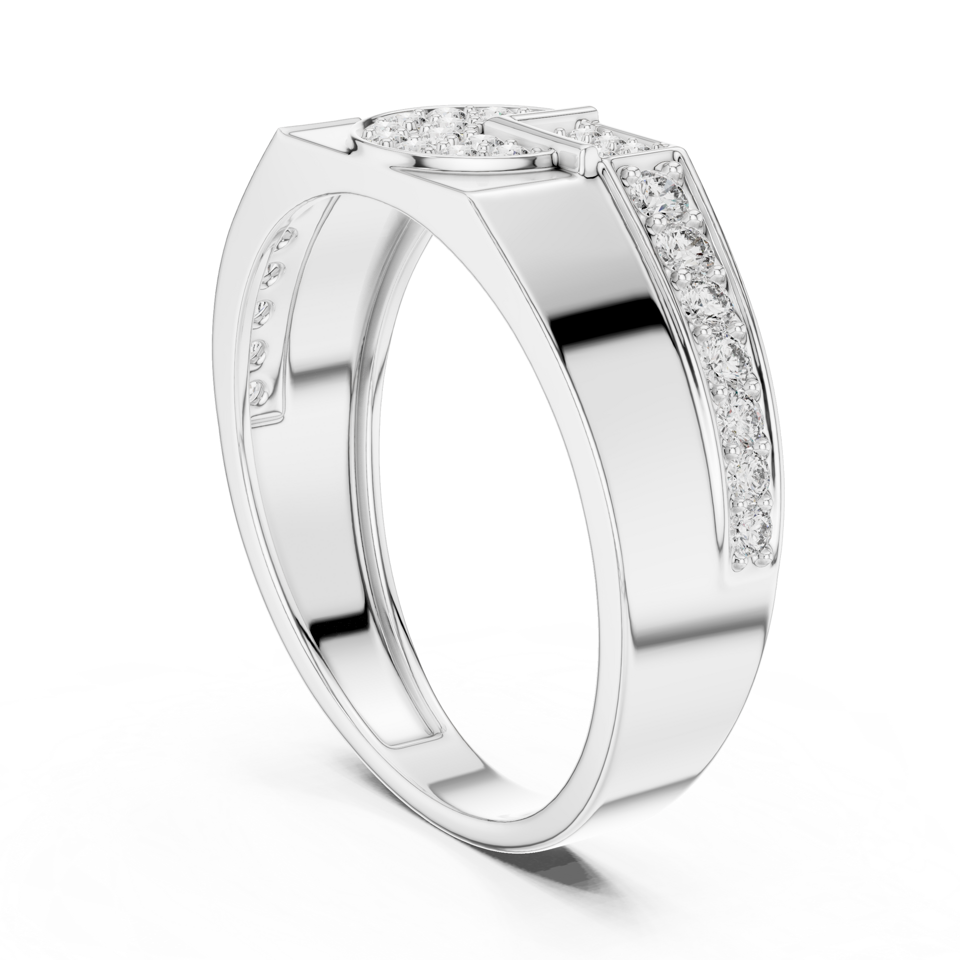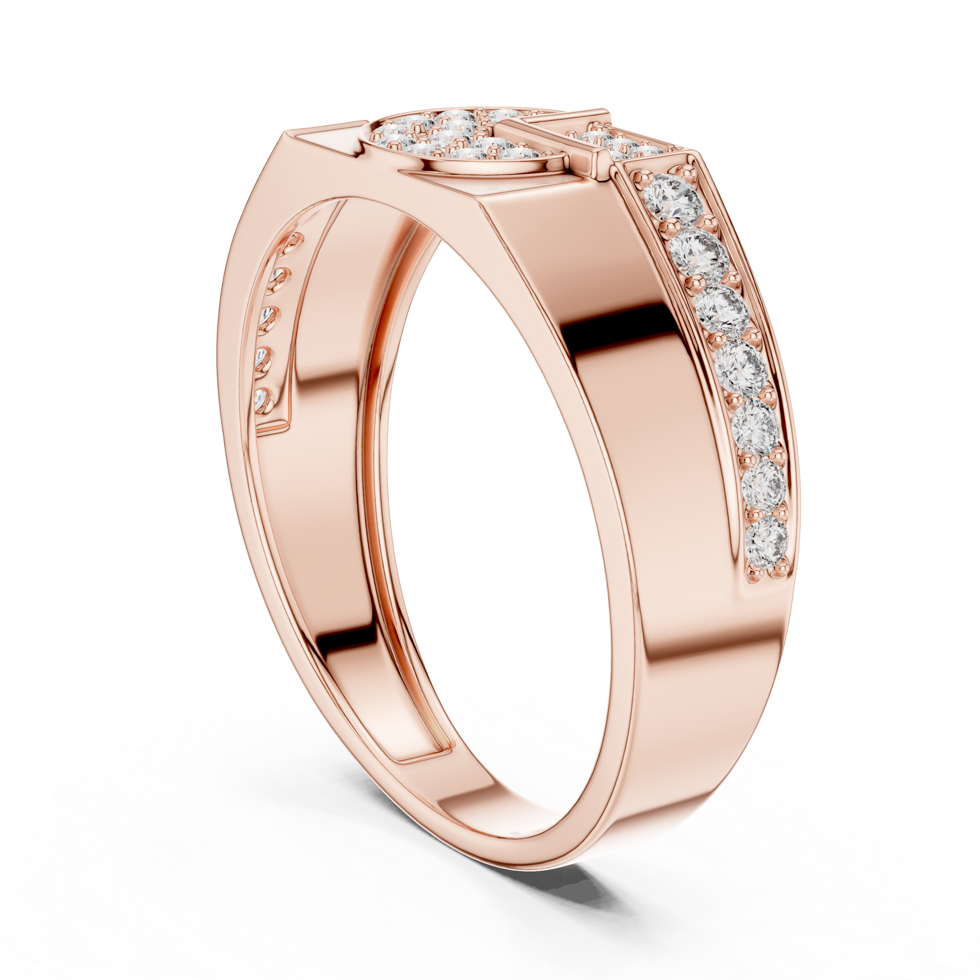 This powerful men’s ring from Ivevar Luxury is a statement of modern refinement and confident design. Crafted in a rich gold finish, the ring features a striking round pave diamond cluster center, complemented by rectangular diamond-set accents that create a bold geometric balance. The clean, structured band enhances the ring’s masculine presence while allowing the diamonds to command attention.