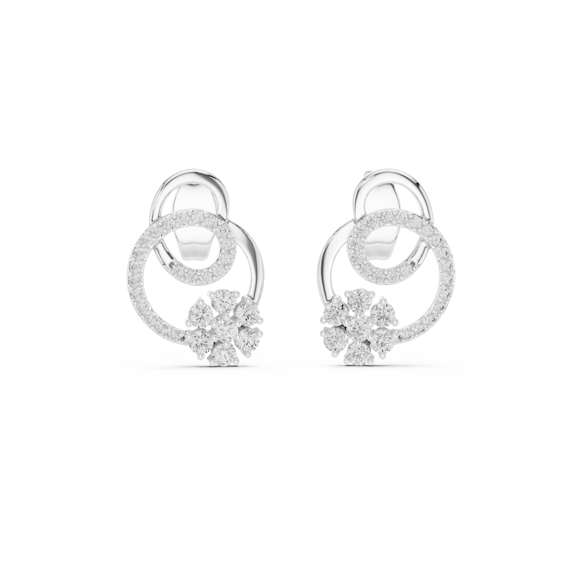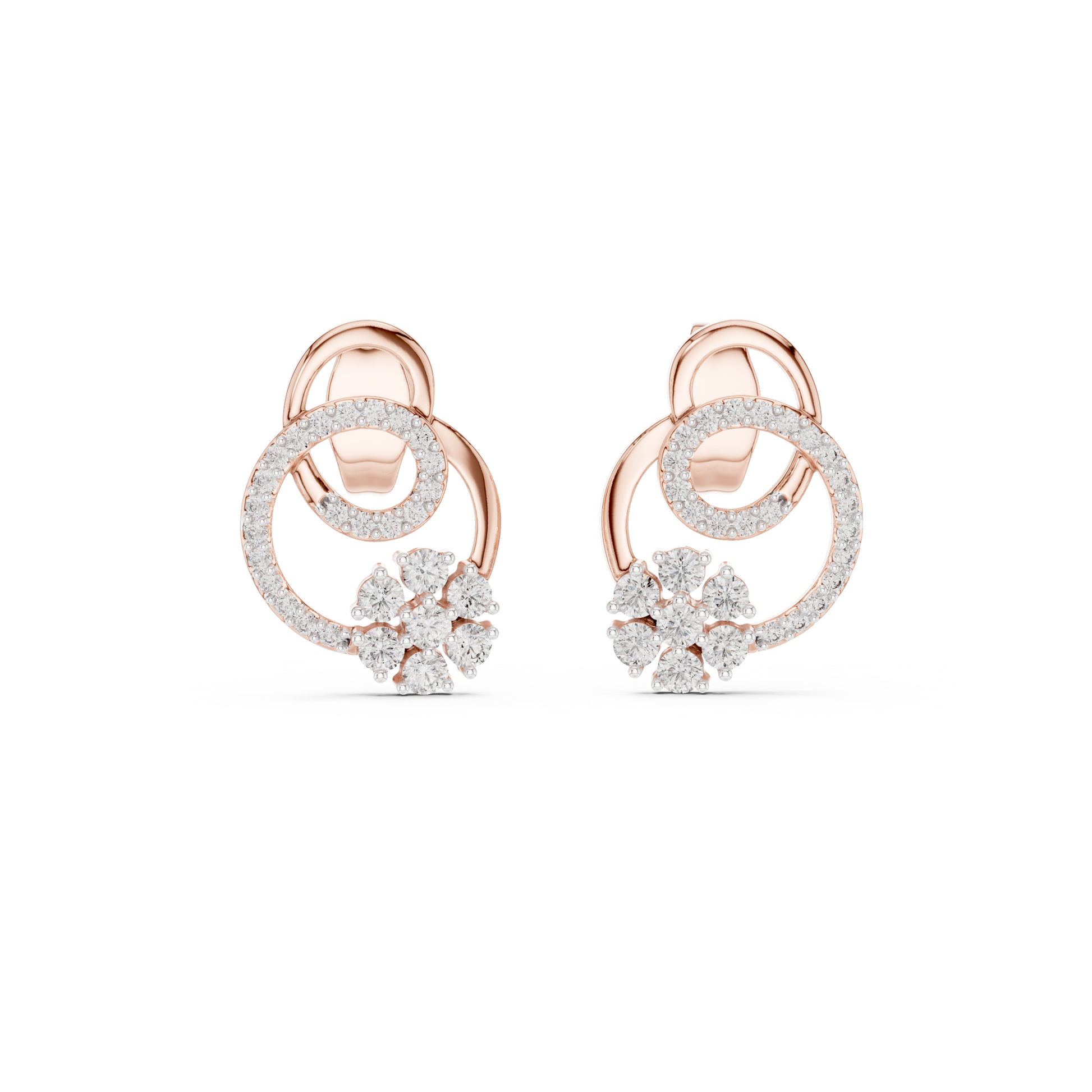 Designed with graceful movement and refined sparkle, these swirl circle diamond stud earrings feature a sculpted gold loop intertwined with a pave set round  diamond ring. A brilliant floral diamond cluster at the base adds a radiant focal point, creating a harmonious blend of softness and structure. The circular swirl silhouette symbolizes continuity and elegance, while the layered design offers depth and visual interest. Perfect for elevating everyday looks or complementing evening wear, these studs deliver timeless beauty with a modern edge.