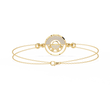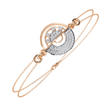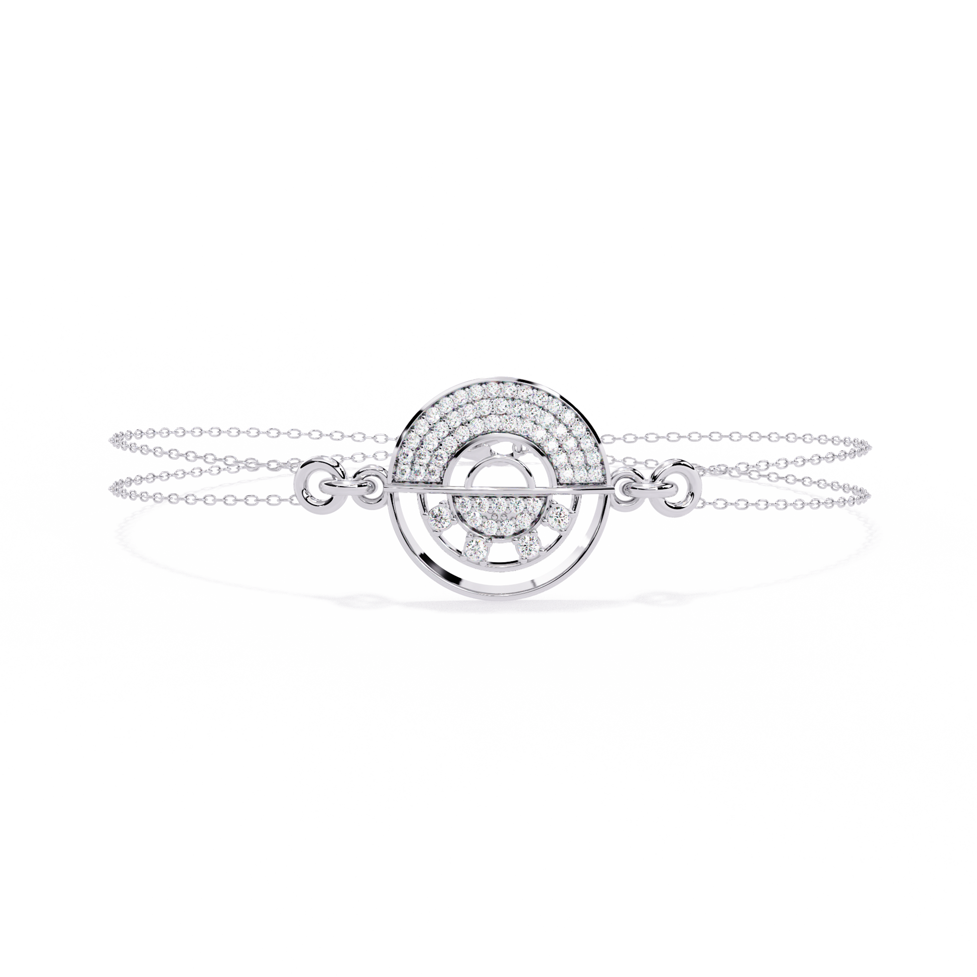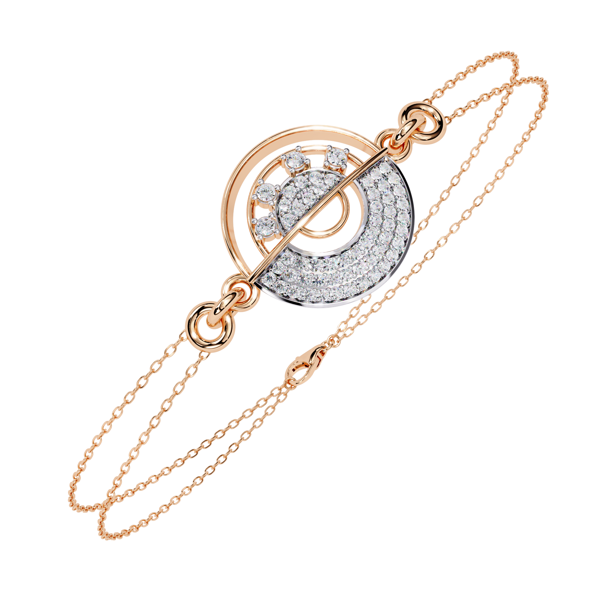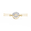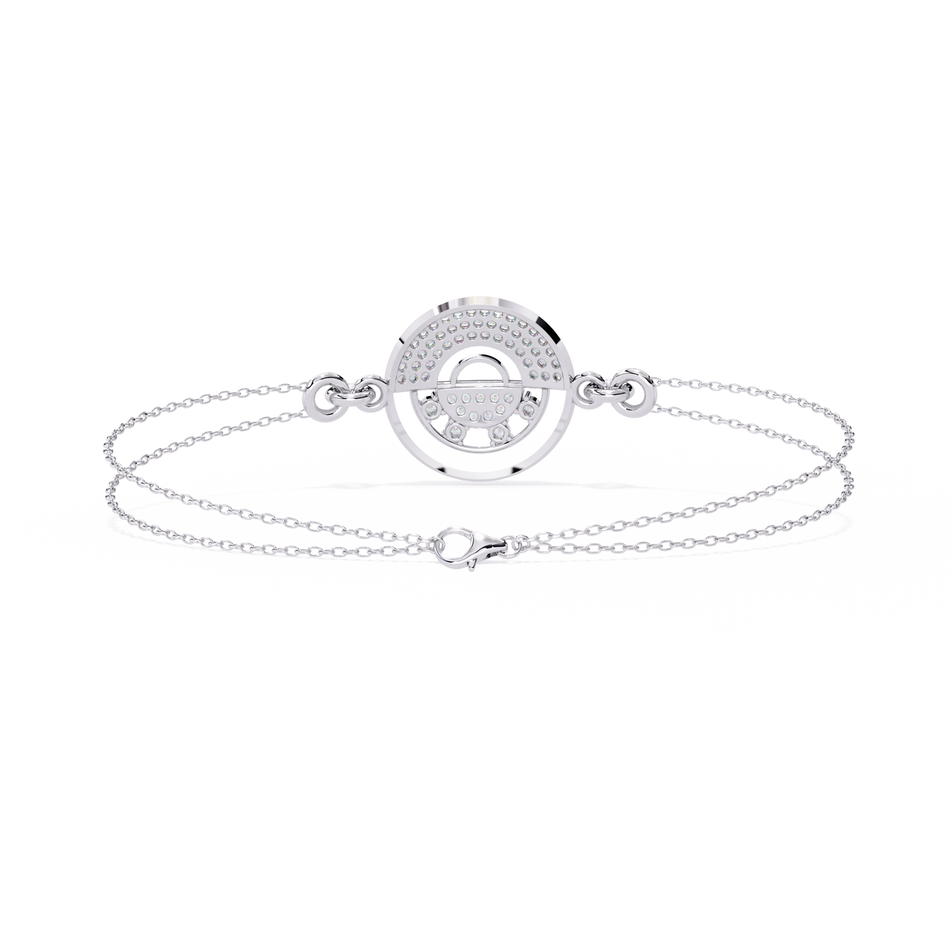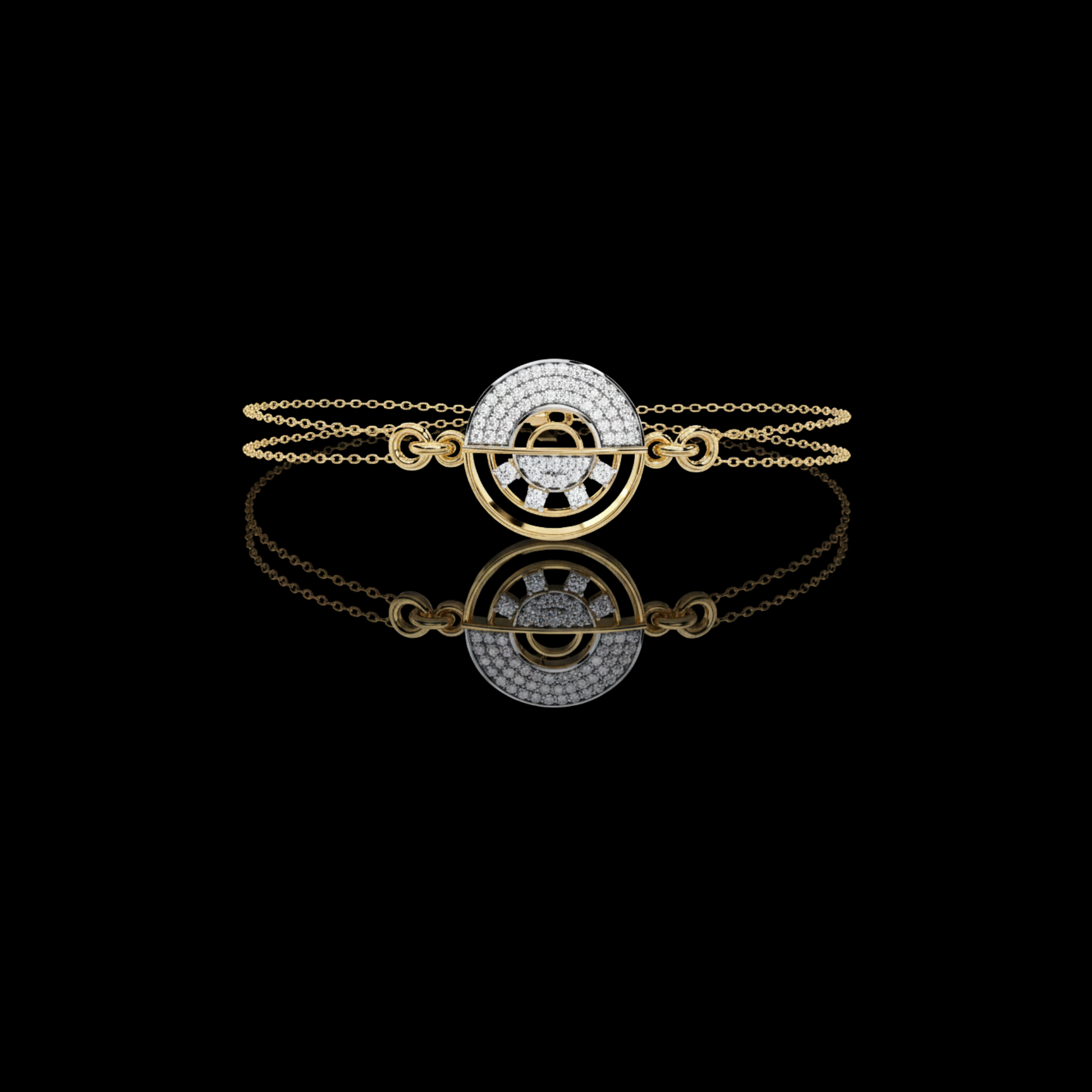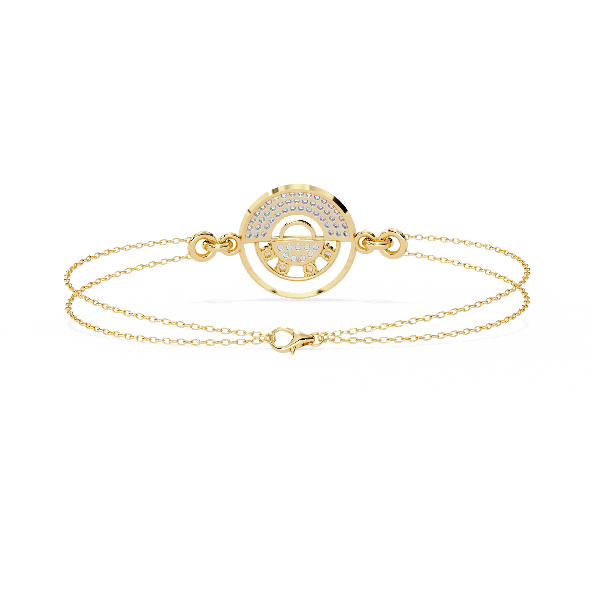 This bracelet showcases a striking blend of modern elegance and timeless luxury, featuring a double-layered gold chain that converges into a bold circular centerpiece. The geometric medallion is adorned with shimmering pavé-set round diamonds on the upper arc and accented with a complementary diamond-studded inner design, creating a radiant interplay of light and texture. Its polished gold structure and intricate detailing make it a sophisticated statement piece, perfect for elevating any refined ensemble.