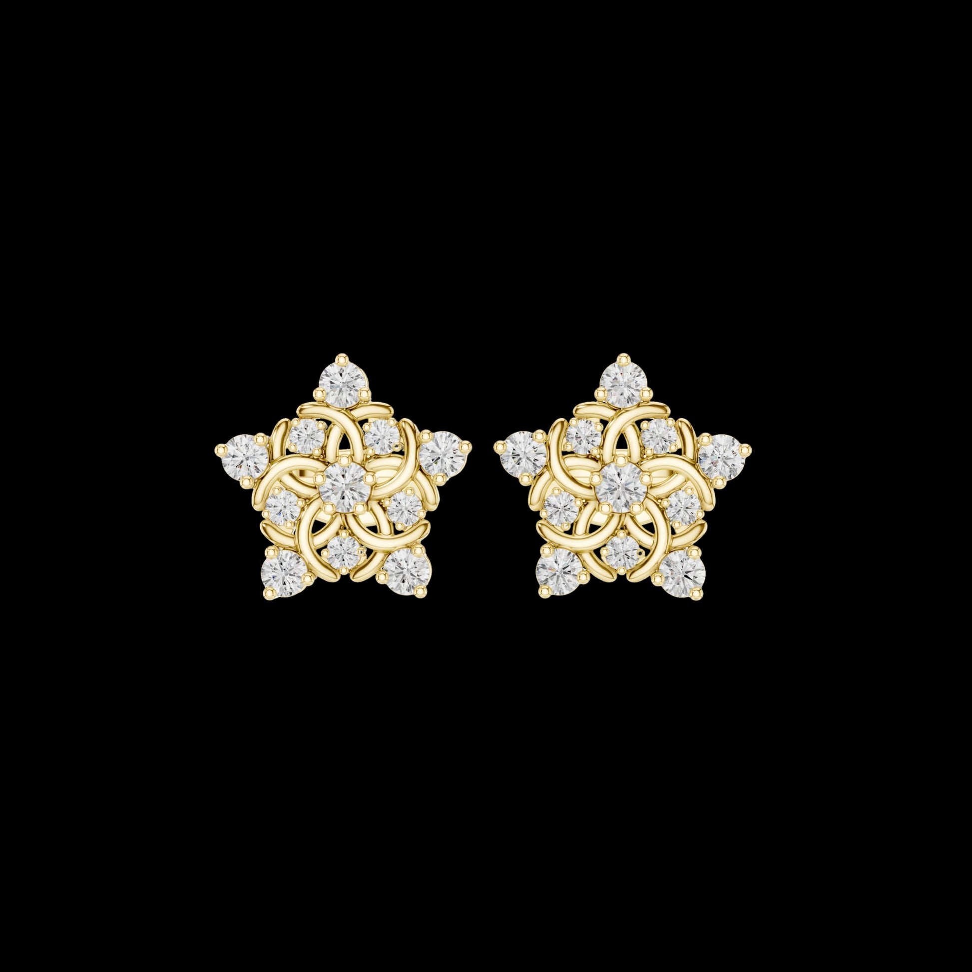 These exquisite gold diamond stud earrings feature a beautifully detailed star-floral design enhanced with graceful swirling gold patterns. Set in a rich yellow gold finish, each stud is adorned with brilliant round-cut diamonds that deliver exceptional sparkle from every angle. The symmetrical layout and refined craftsmanship make these earrings ideal for weddings, festive occasions, and elegant everyday wear. A timeless jewelry piece that blends luxury, tradition, and modern sophistication.