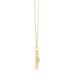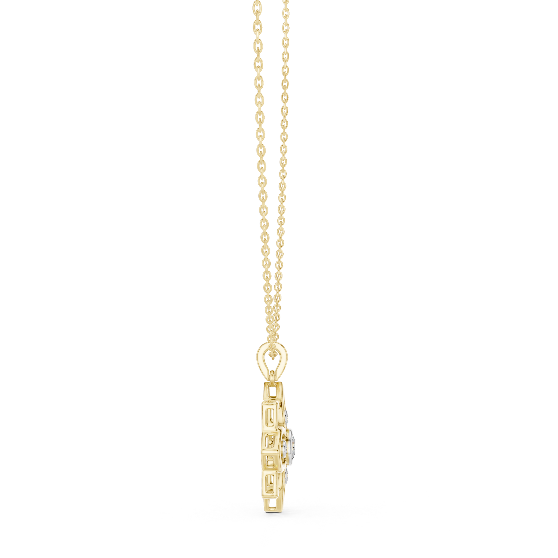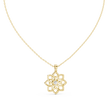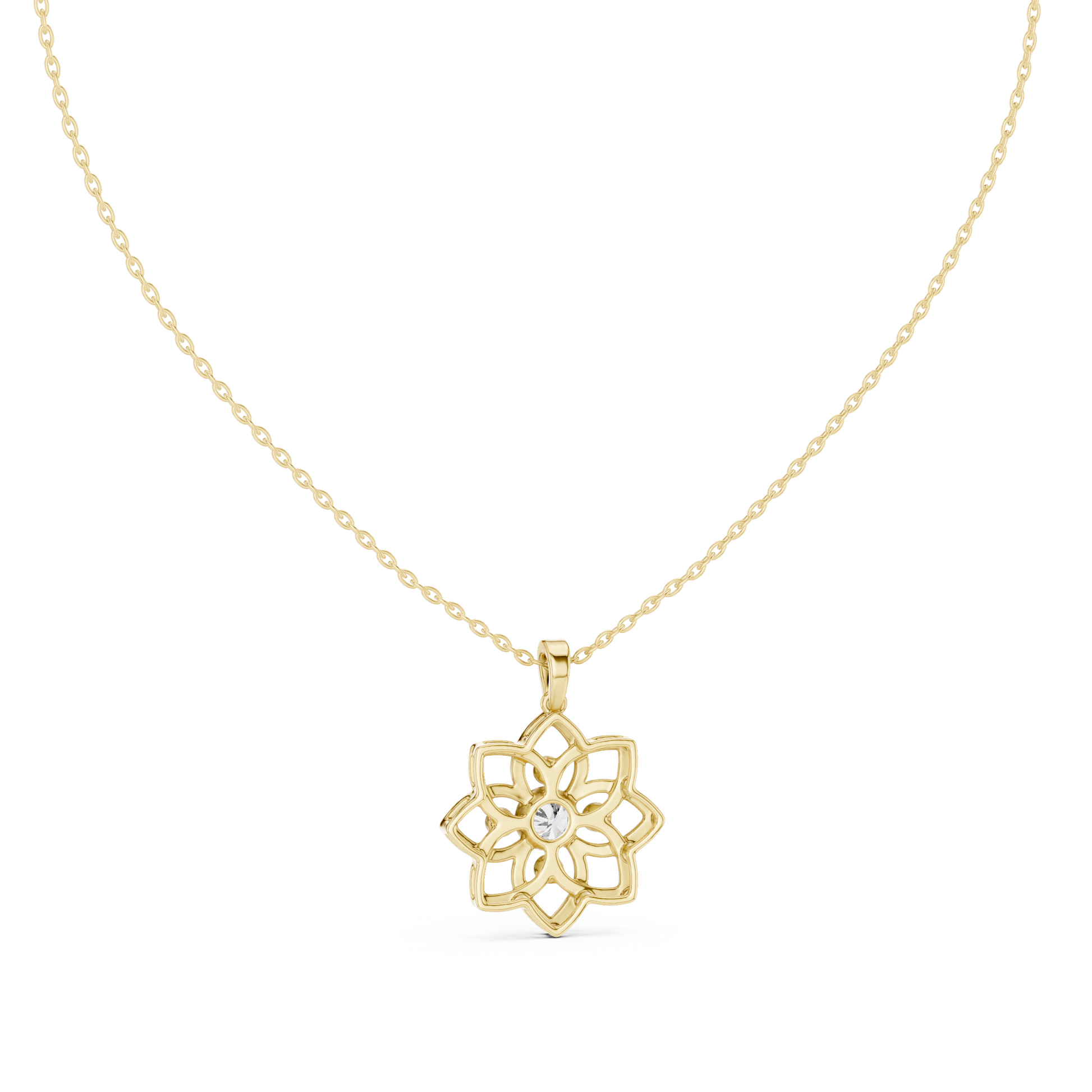 Refined beauty is expressed through delicate form and thoughtful detail. This elegant floral pendant features an open petal design crafted in polished gold, creating a light and graceful silhouette. At its center, a brilliant diamond accent adds subtle sparkle, enhancing the symmetry and balance of the flower motif. The pendant is suspended from a fine gold chain, allowing it to rest effortlessly at the neckline.