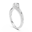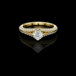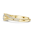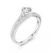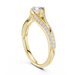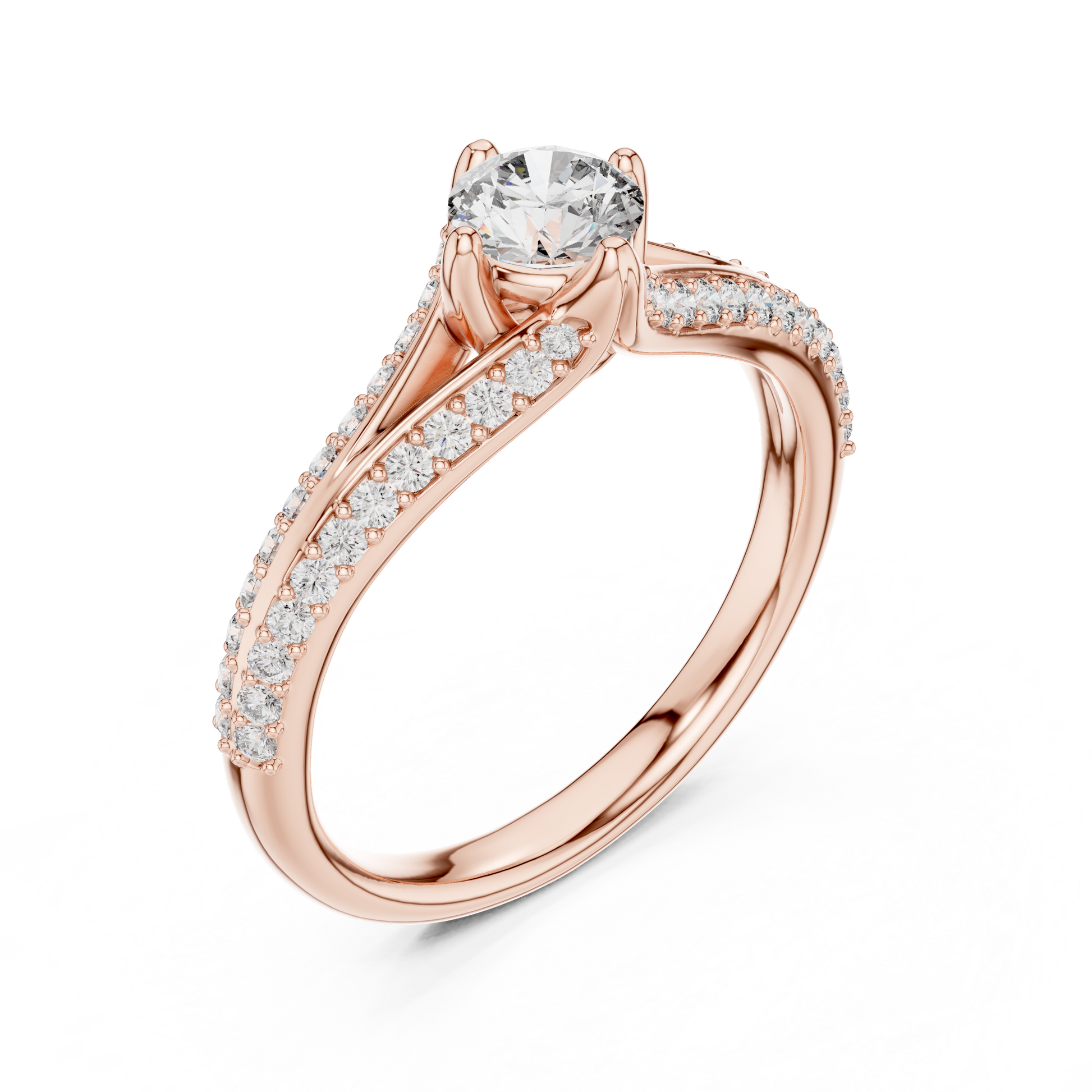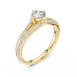This exquisite ring showcases a brilliant round-cut diamond, held securely in a unique four-prong setting that features a delicate V-shaped point below the stone. The setting lifts the sparkling solitaire, maximizing its brilliance and fire. The defining feature is the modern split-shank band, which gracefully separates near the center stone and is lavishly covered in two rows of micro-pavé set accent diamonds. Crafted in warm yellow gold, the pavé diamonds extend down the shoulders, adding magnificent sparkle and creating a luxurious and eye-catching silhouette. This ring is a perfect choice for a contemporary yet timeless engagement ring.
