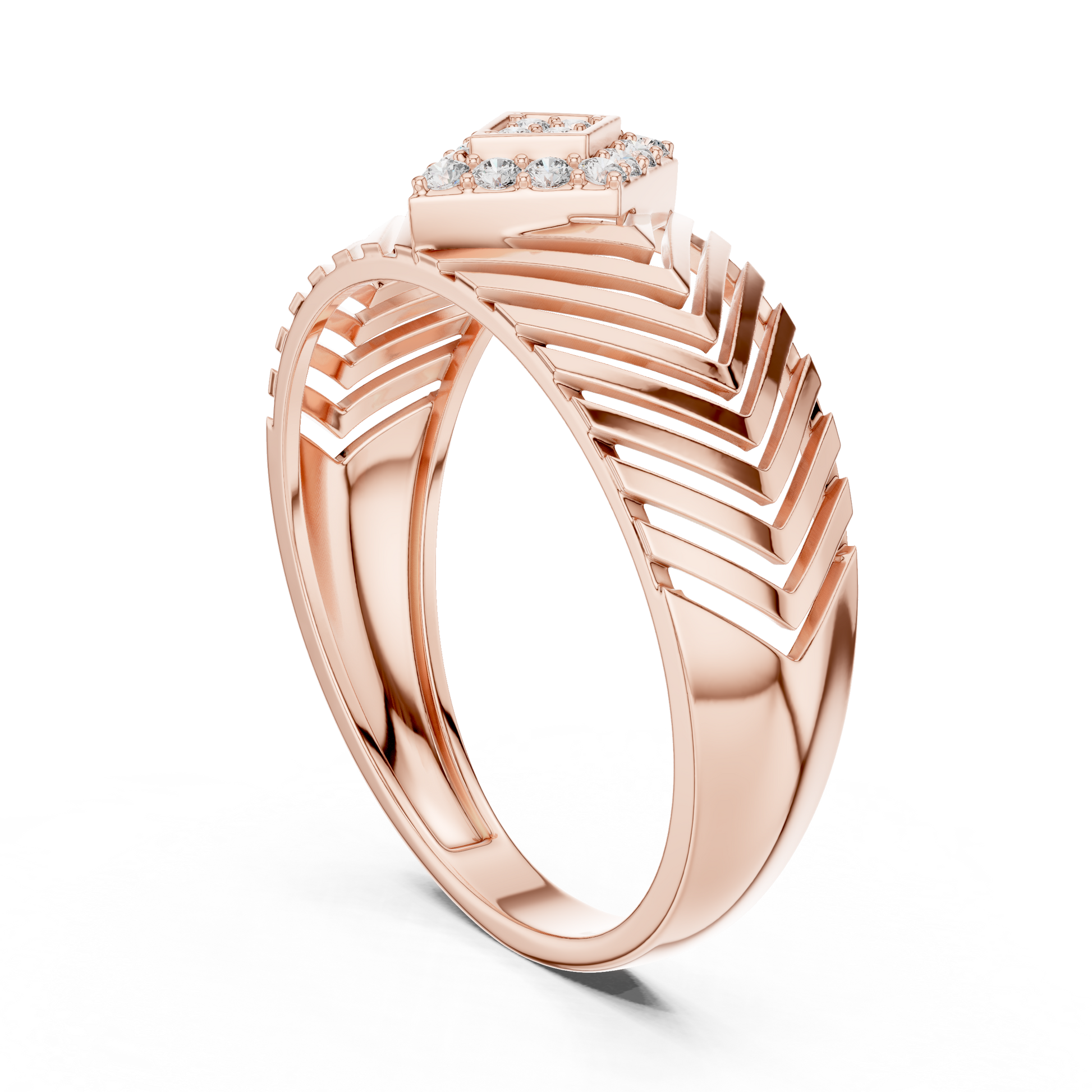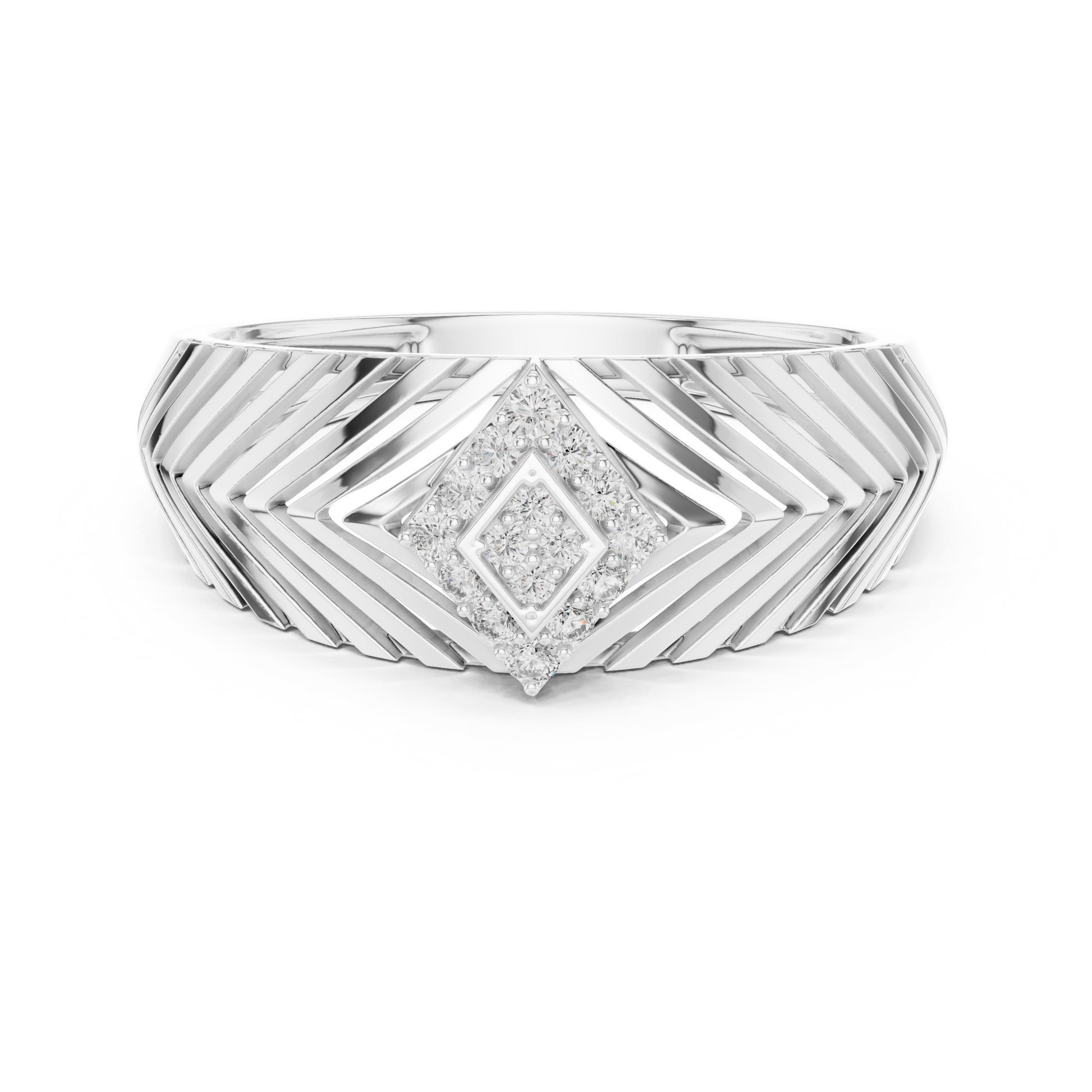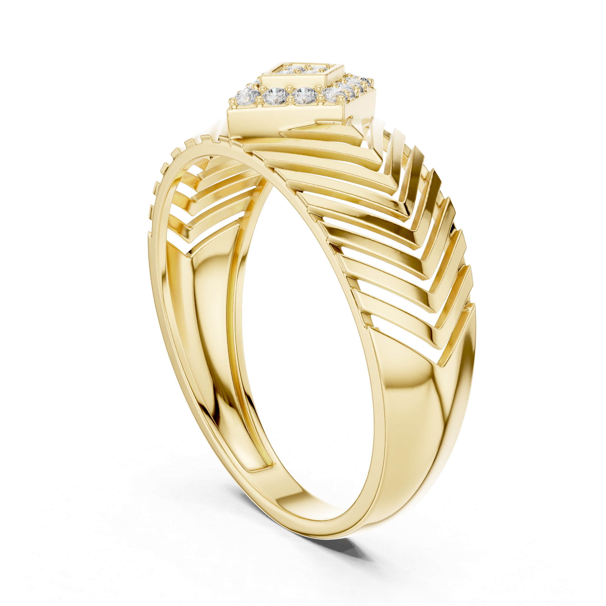 At Ivevar Luxury, this striking ring is designed for those who appreciate bold craftsmanship and refined elegance. The ring showcases a distinctive chevron-patterned gold band, layered with precision-cut lines that create depth and a powerful architectural presence. A square diamond cluster centerpiece anchors the design, surrounded by brilliant round diamonds that enhance sparkle from every angle.