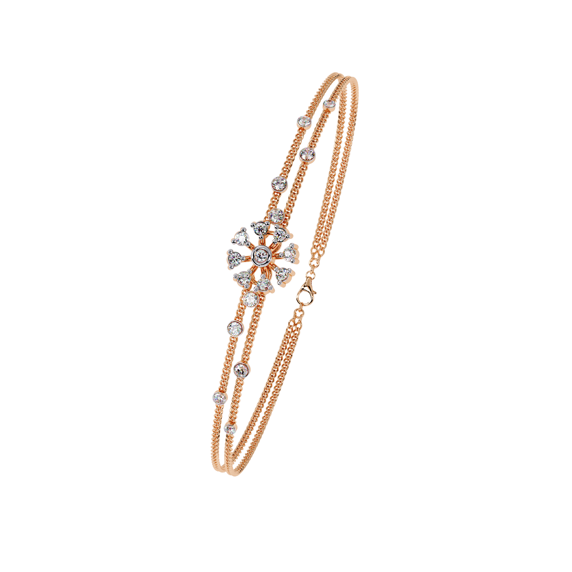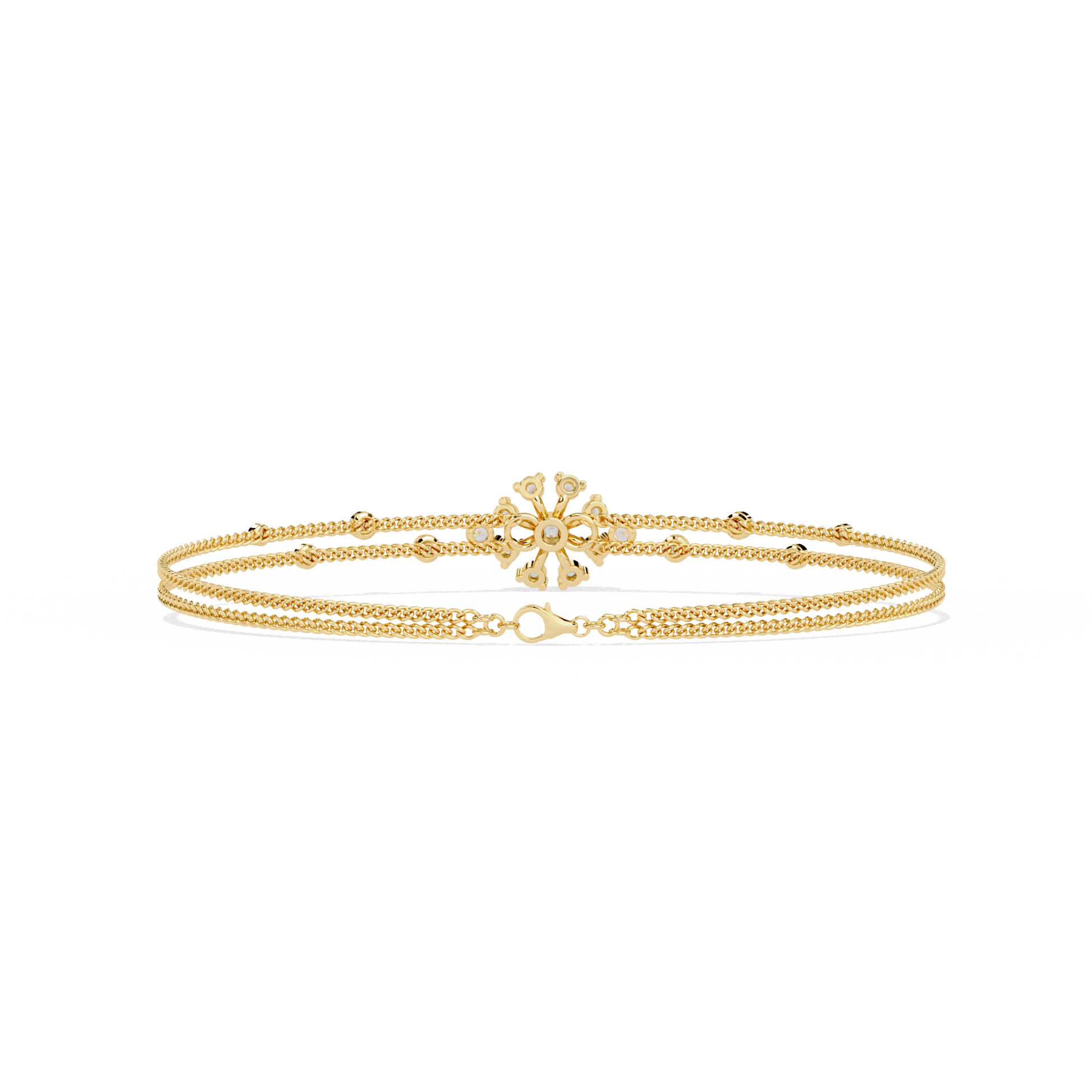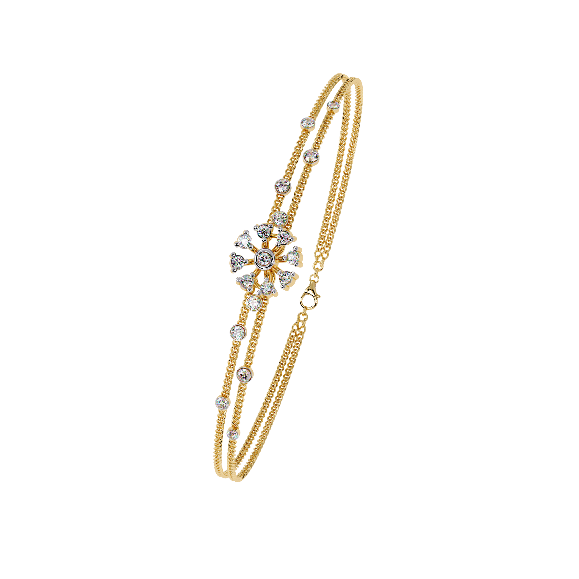 This elegant bracelet features a refined dual-strand gold design accented with sparkling round diamonds that bring a touch of sophistication to every angle. At its center sits a stunning floral-inspired diamond motif, intricately arranged to create a radiant focal point that enhances the bracelet’s delicate charm. The combination of polished gold and brilliant diamonds offers a timeless, luxurious look, making it the perfect piece for adding graceful sparkle to both everyday wear and special occasions by Ivevar.