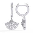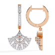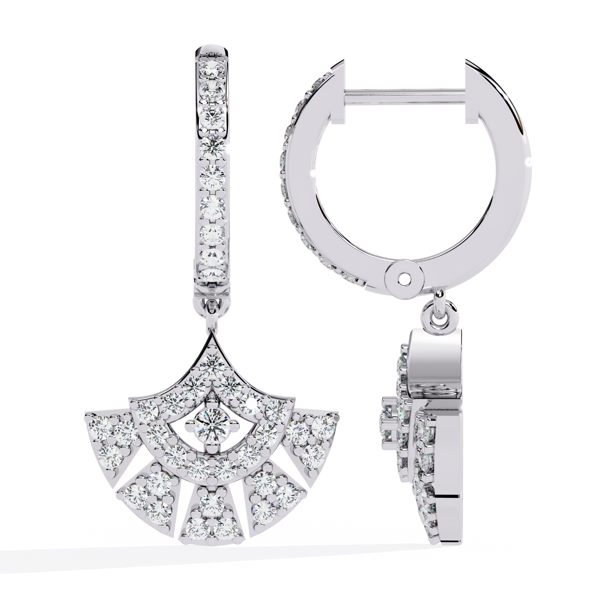 These striking earrings feature a luxurious fusion of geometric artistry and radiant sparkle, beginning with elongated pave-set diamond bars that gently lead to fan-shaped pendants. Each pendant is meticulously arranged with round diamonds framed by subtle gold accents, creating a layered, architectural look reminiscent of a modern sunburst motif. The intricate segmentation enhances brilliance from every angle, giving the earrings a bold yet refined presence that beautifully elevates both elegant and contemporary styles.
