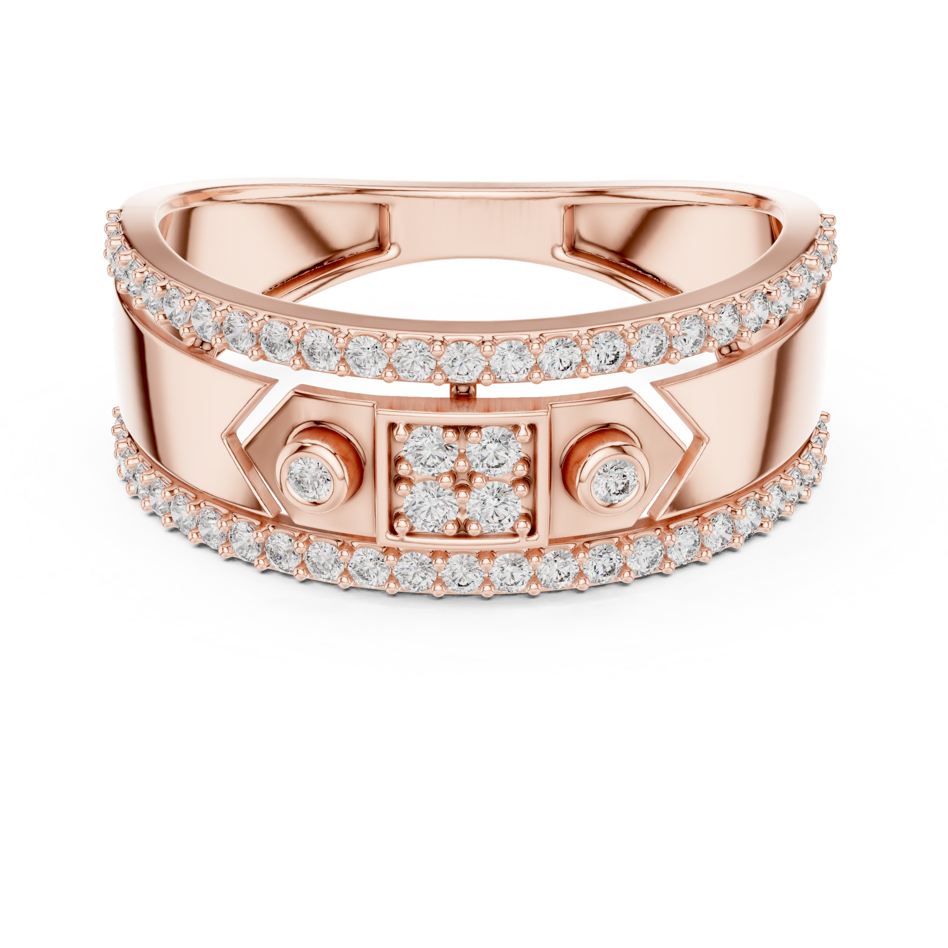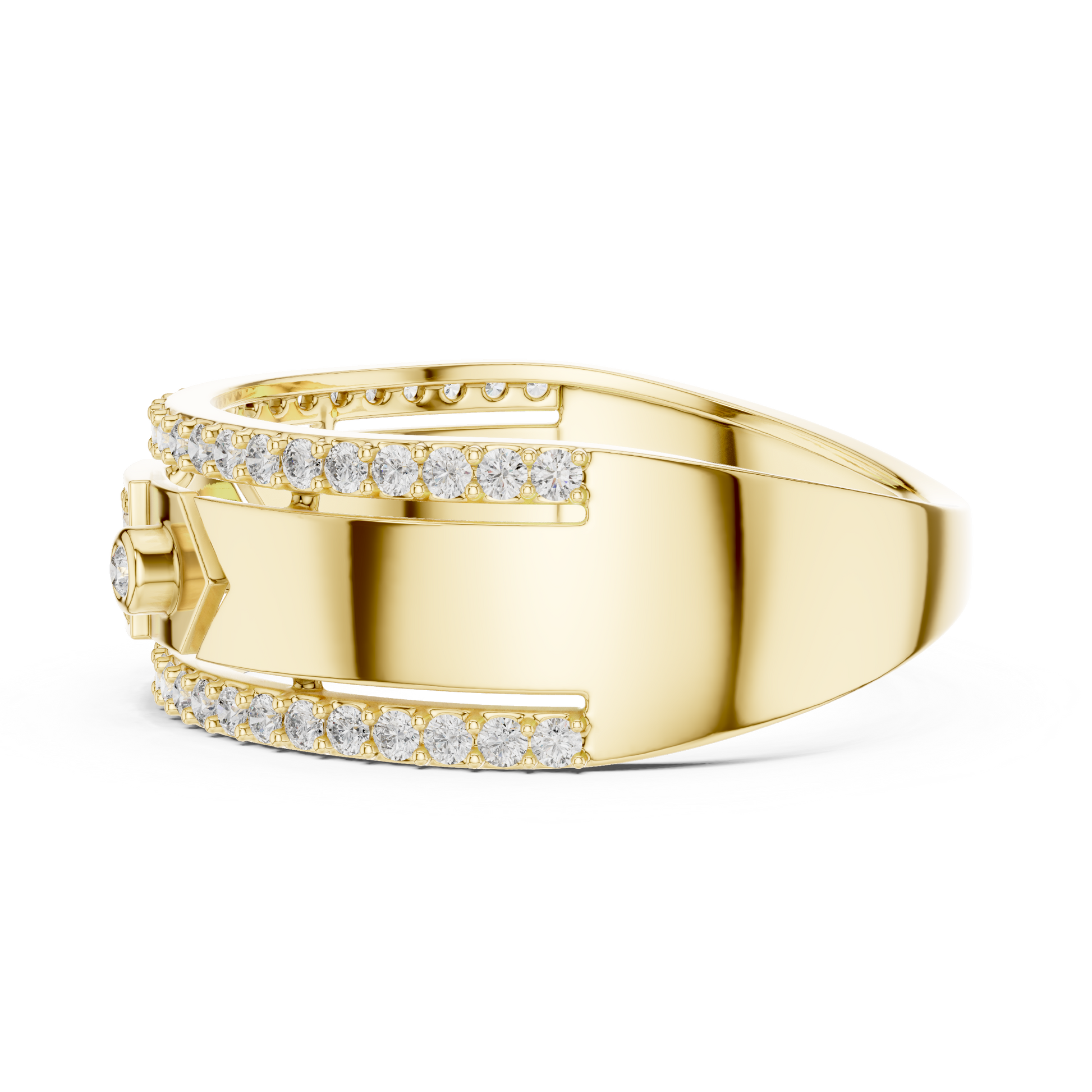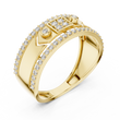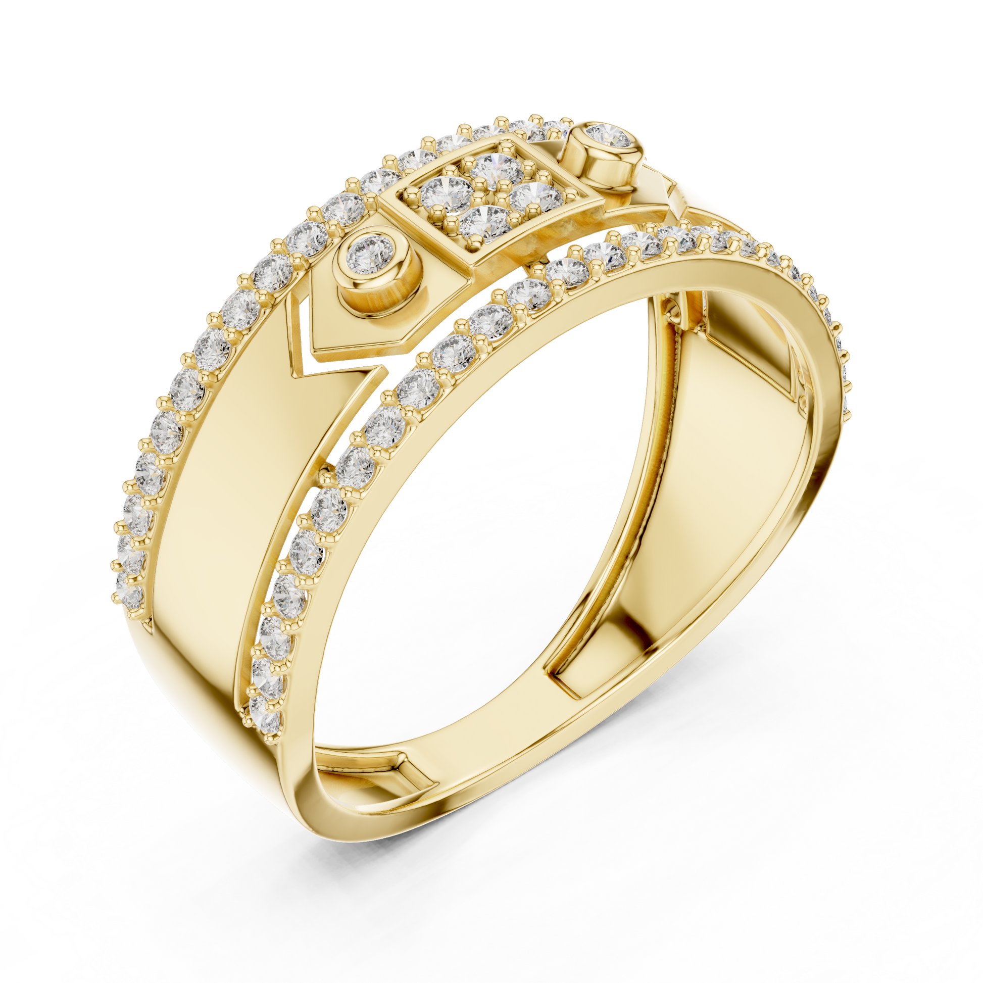 This bold and architectural design from IVEVAR LUXURY features a striking wide gold band accented with multiple rows of shimmering pavé-set diamonds. The centerpiece showcases a refined square diamond cluster framed by geometric detailing, complemented by bezel-set round diamonds on each side for balanced brilliance.
