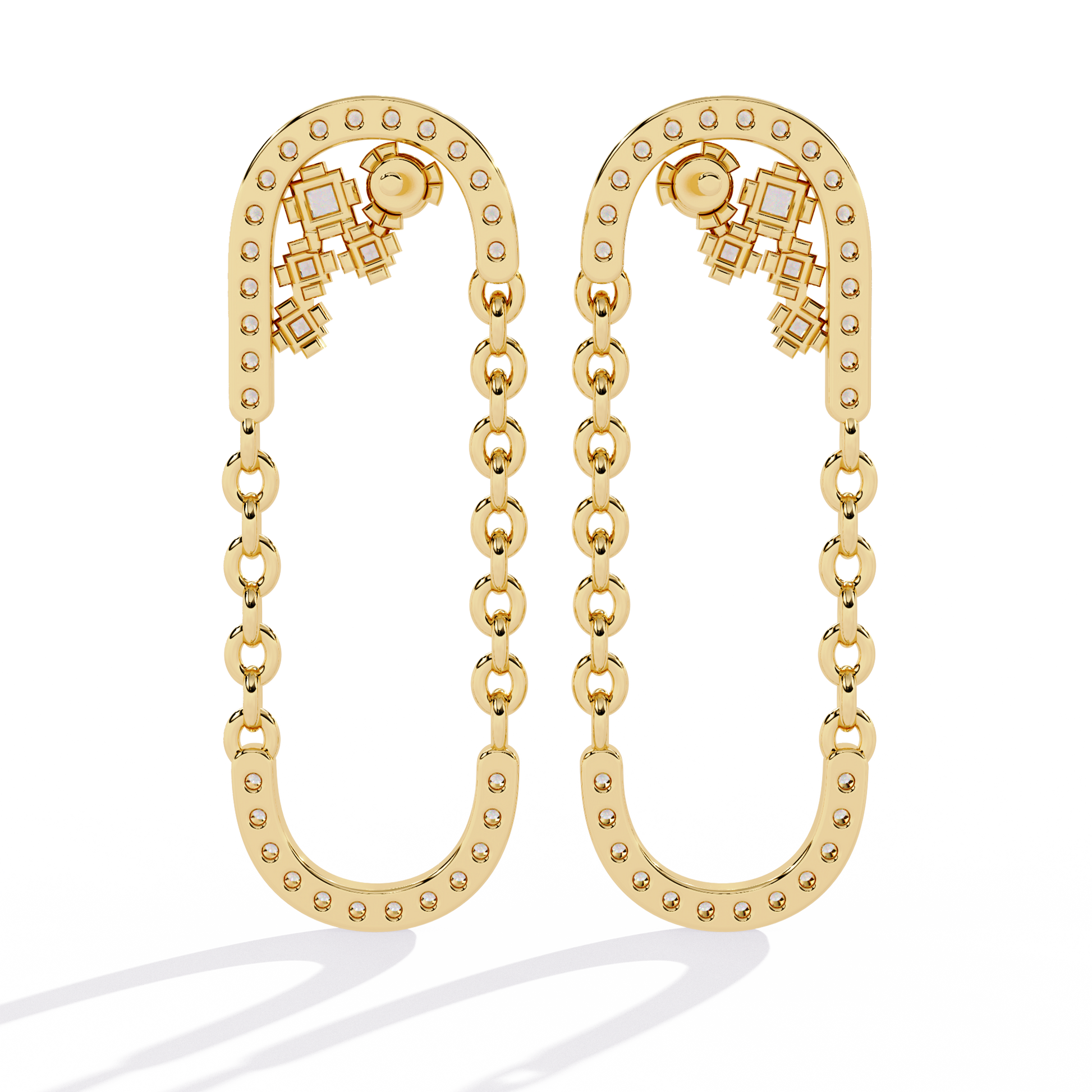 These striking earrings feature a modern open-loop design that beautifully blends gold chain links with shimmering, pave-style round diamond accents. The top of each loop is adorned with a delicate cluster of sparkling princess and round stones, adding a touch of elegance and brilliance to the contemporary silhouette. The contrast between the sleek, diamond-studded curves and the bold gold chains creates a sophisticated yet edgy look, making these earrings a perfect statement accessory for both chic daytime outfits and glamorous evening ensembles.