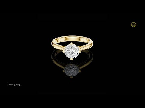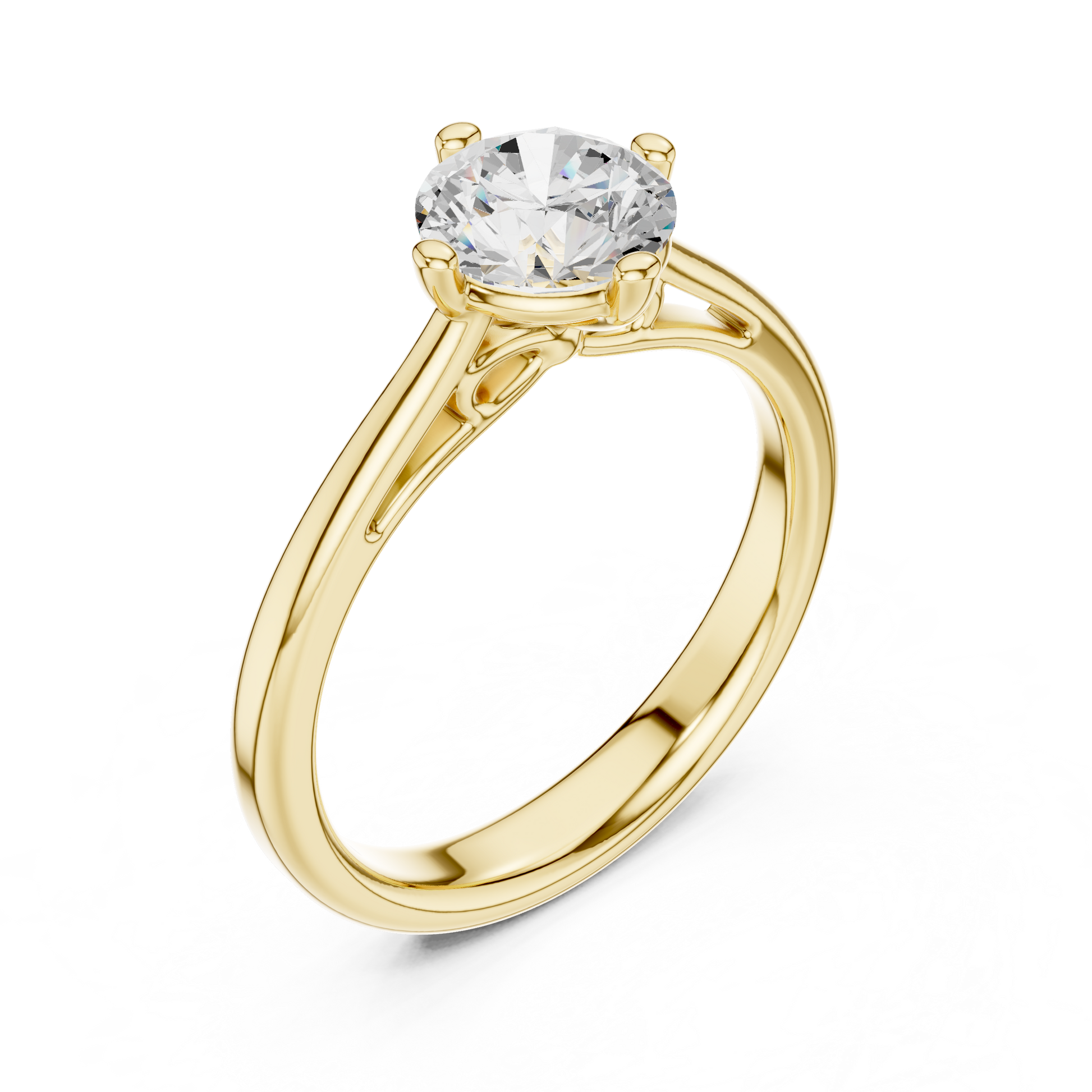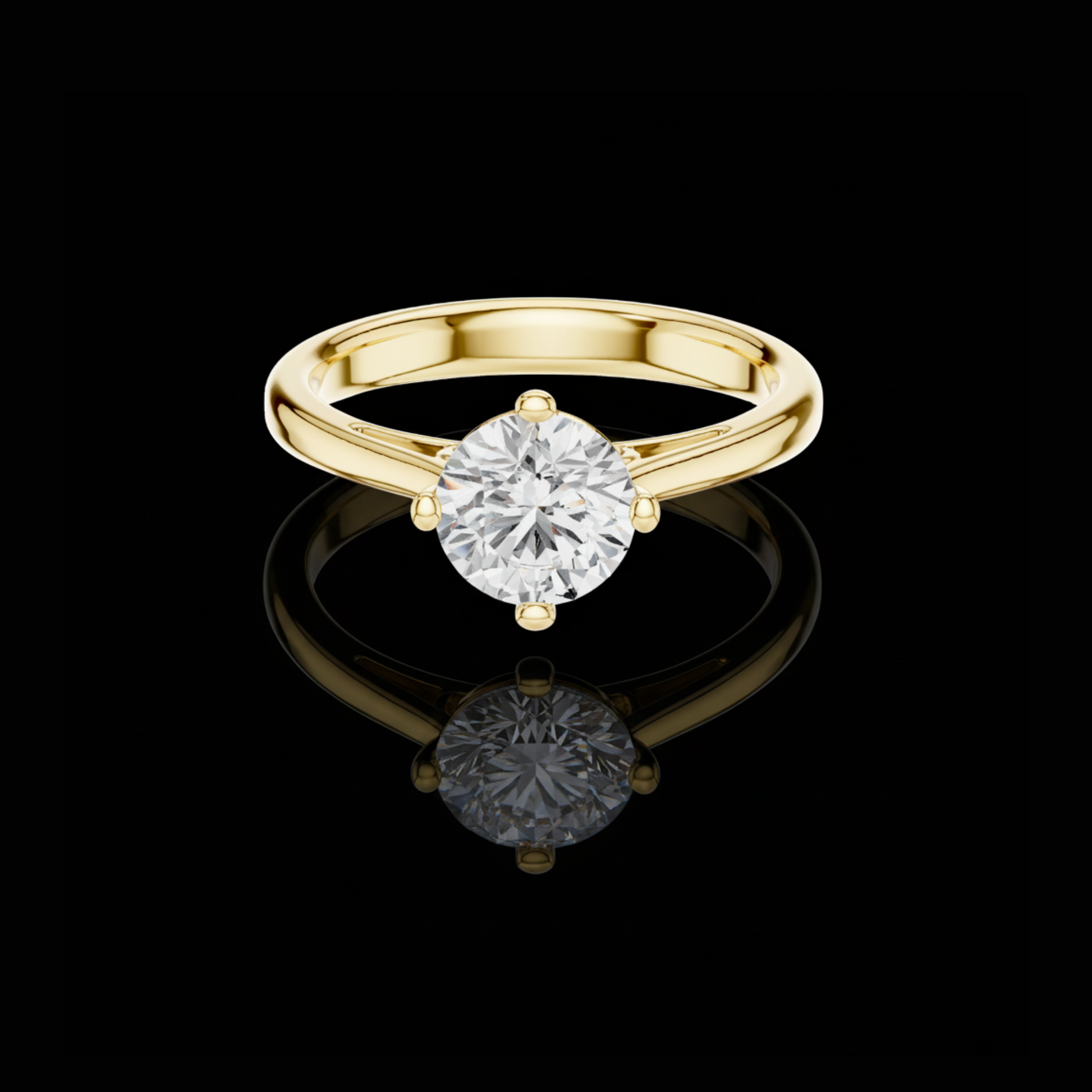 Discover the timeless beauty of this round brilliant solitaire, where classic design meets refined craftsmanship. The ring showcases a perfectly centered round brilliant cut held in a secure four-prong crown that maximizes light return and sparkle. Its polished gold band features a subtle tapered shank, offering both everyday comfort and couture elegance. Designed as an engagement ring or a sophisticated daily statement piece, the silhouette highlights the stone as the unforgettable focal point.