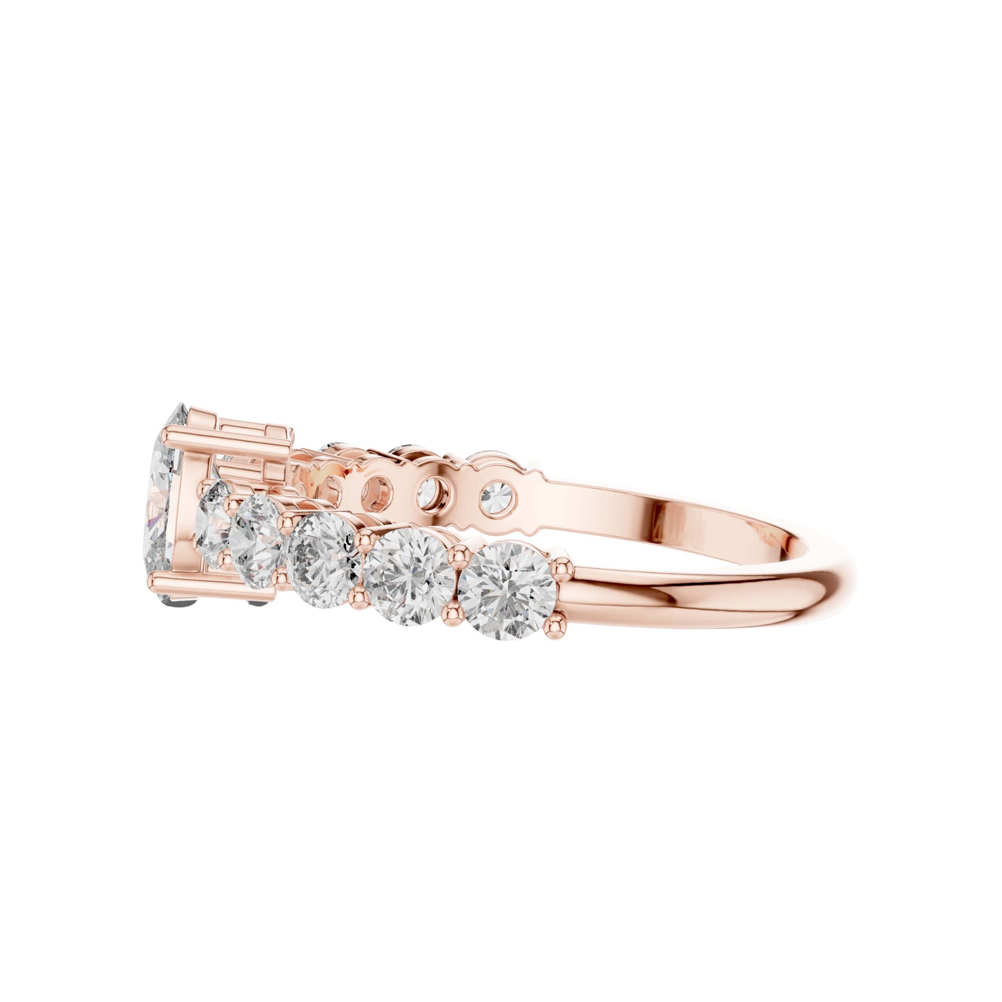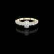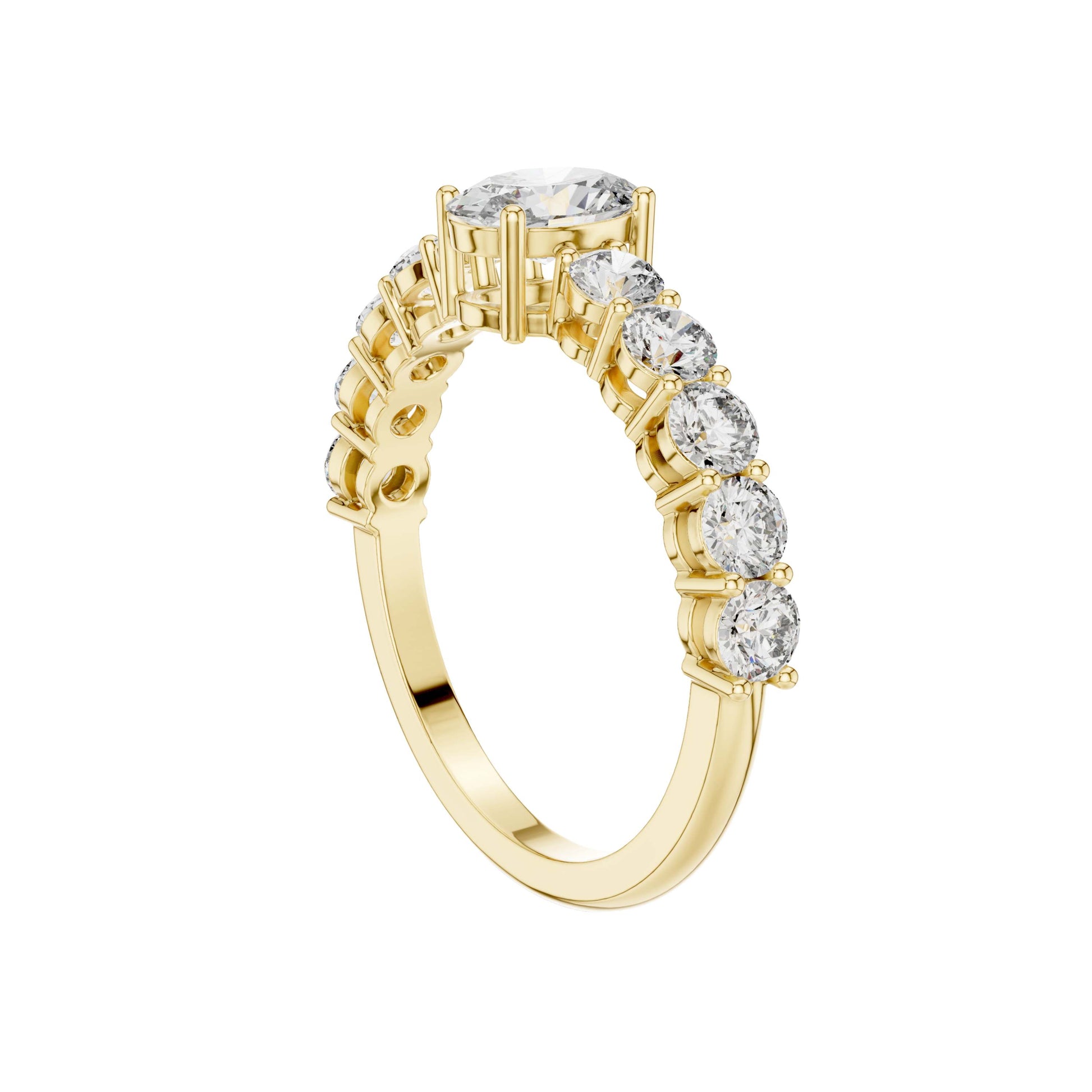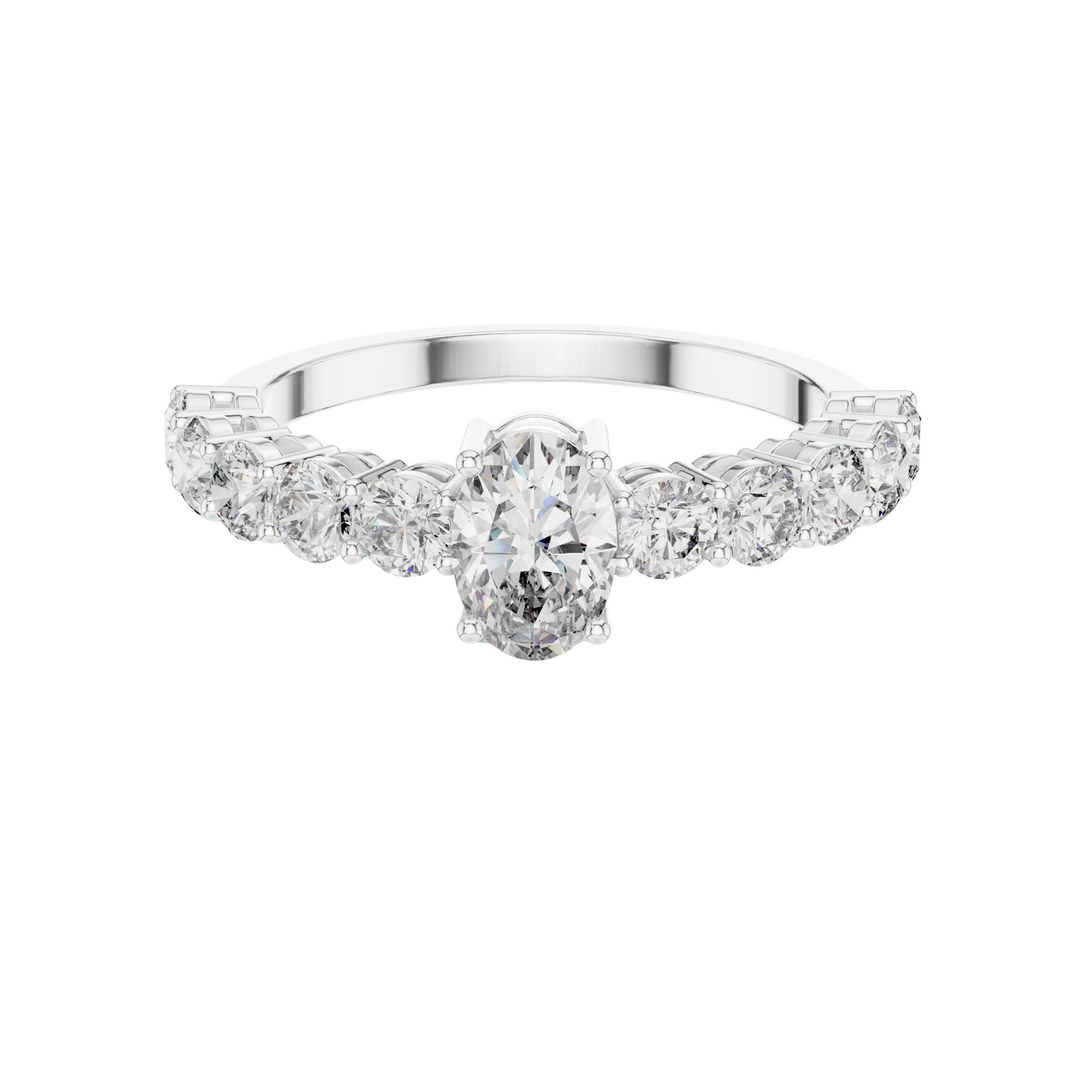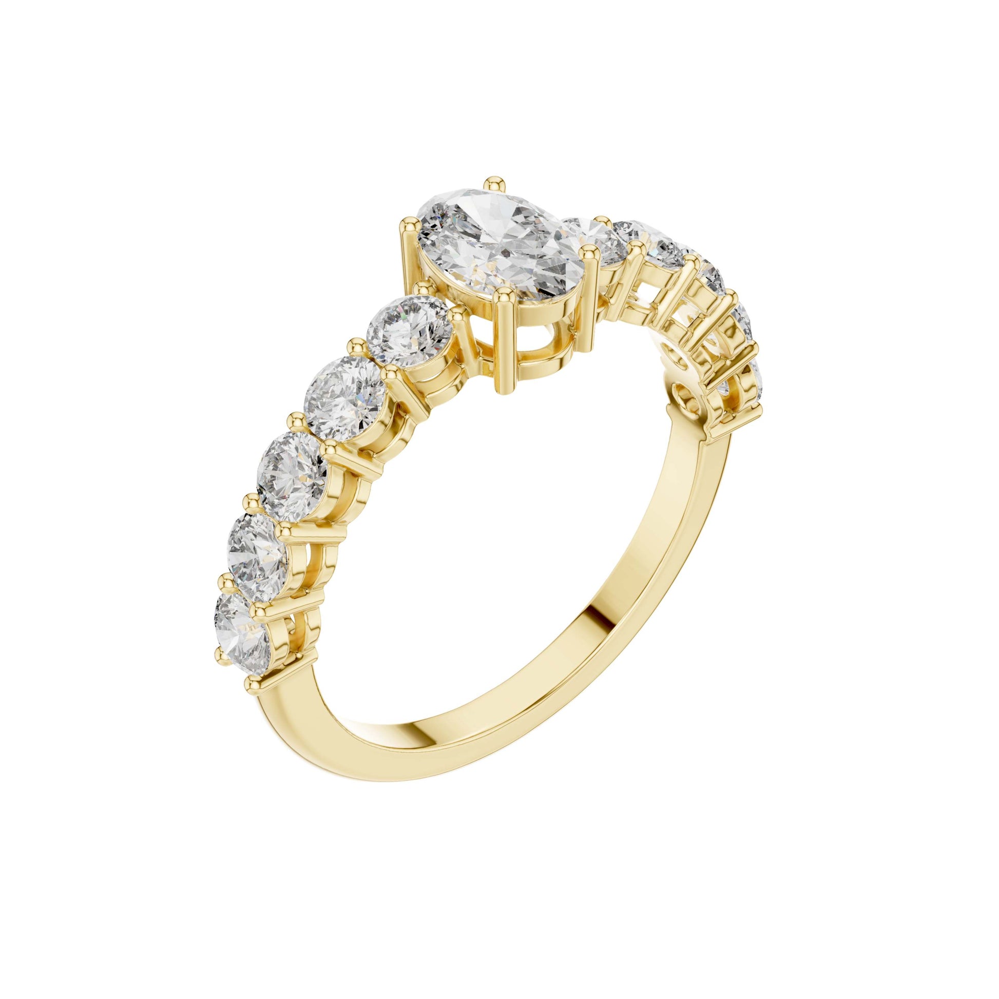 This stunning engagement ring features a captivating oval brilliant-cut center diamond, elegantly secured in a classic four-prong gold setting. A row of sparkling round brilliant diamonds adorns the band, adding depth and continuous shimmer that enhances the brilliance of the center stone. Crafted in polished gold with a refined silhouette, this timeless design blends classic romance with modern sophistication, making it a perfect symbol of enduring love and commitment by Ivevar Luxury.