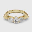 The Regal Bloom Diamond Ring is a celebration of royal elegance and timeless artistry. Showcasing a luminous oval-cut diamond at its center, the design is gracefully complemented by pear-shaped side diamonds that enhance brilliance and create a beautifully balanced silhouette.The band features intricate ornamental detailing in high adding depth, texture, and a sense of heritage craftsmanship. Every element is thoughtfully designed to highlight the diamonds while offering durability, comfort, and enduring beauty.