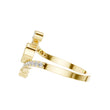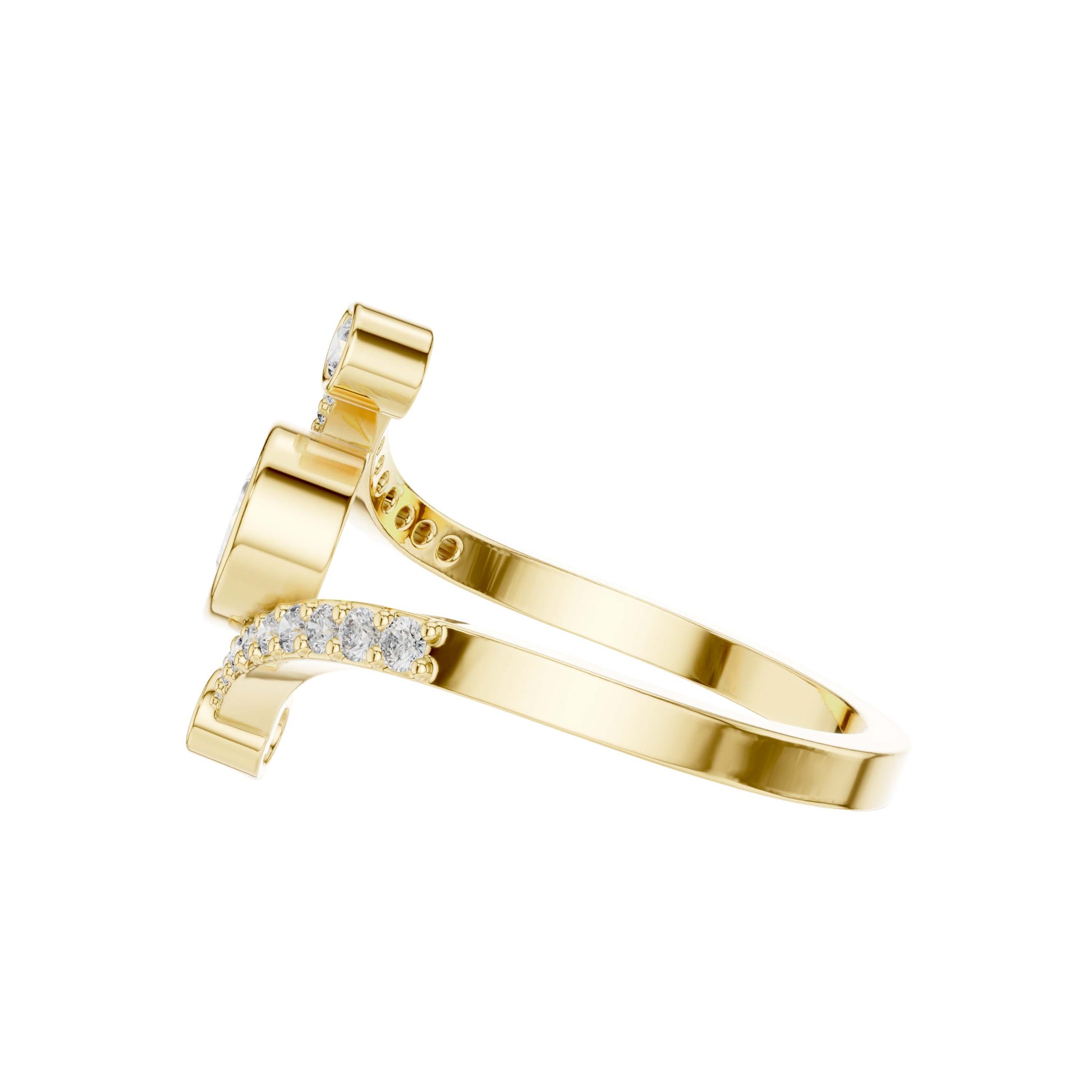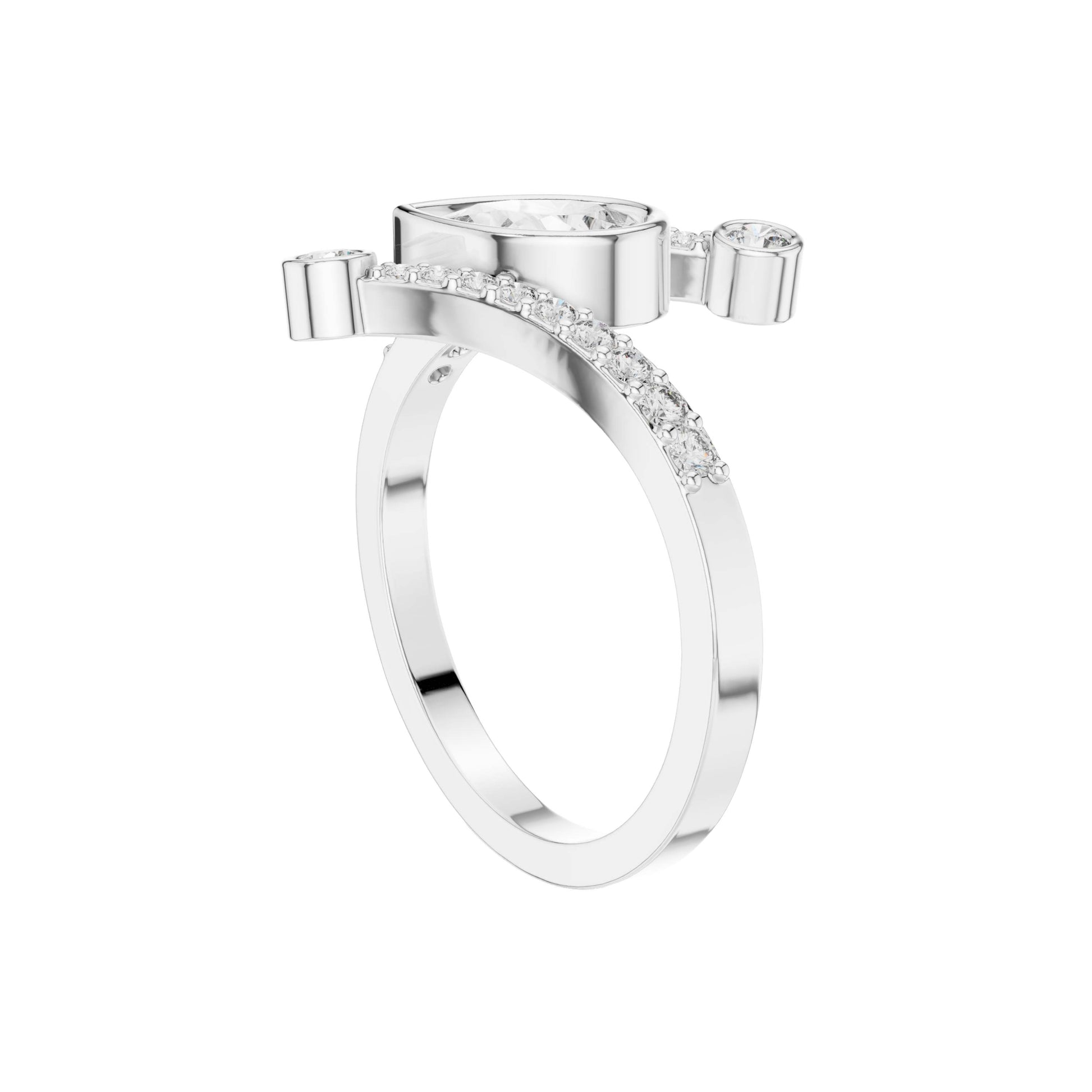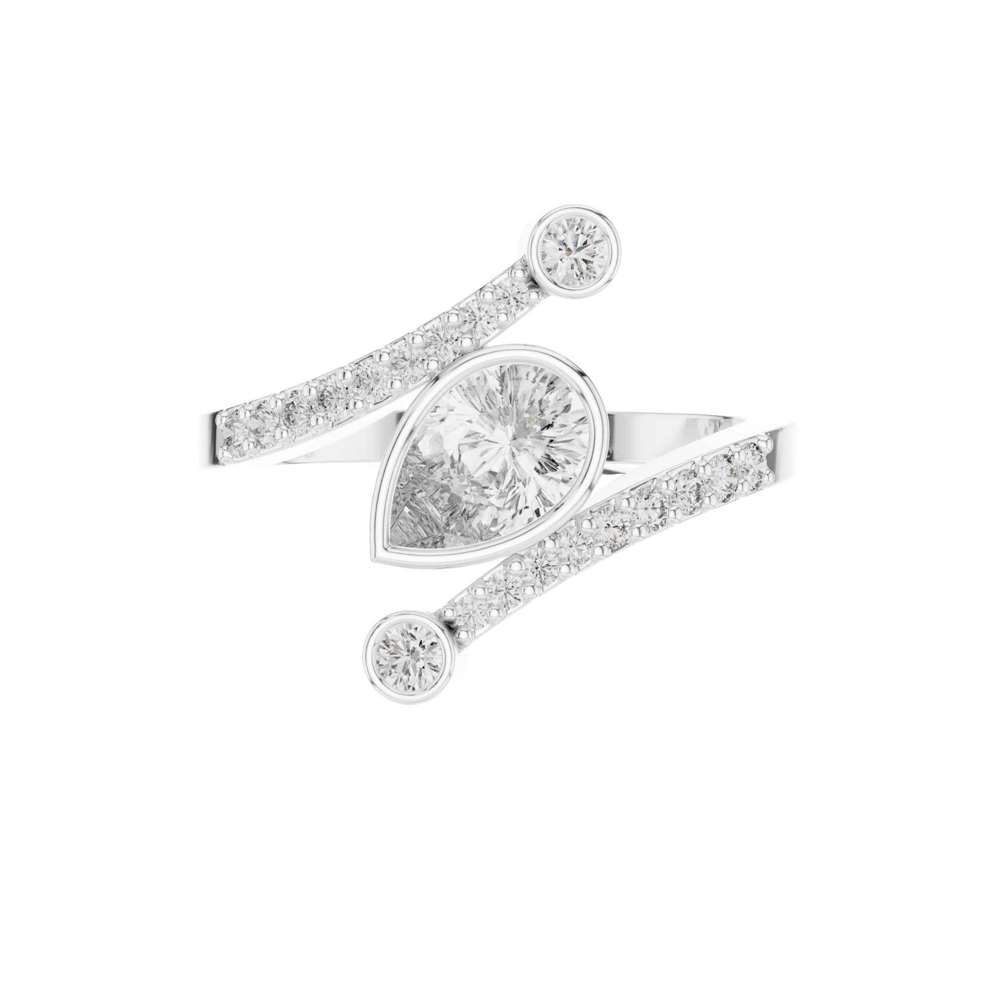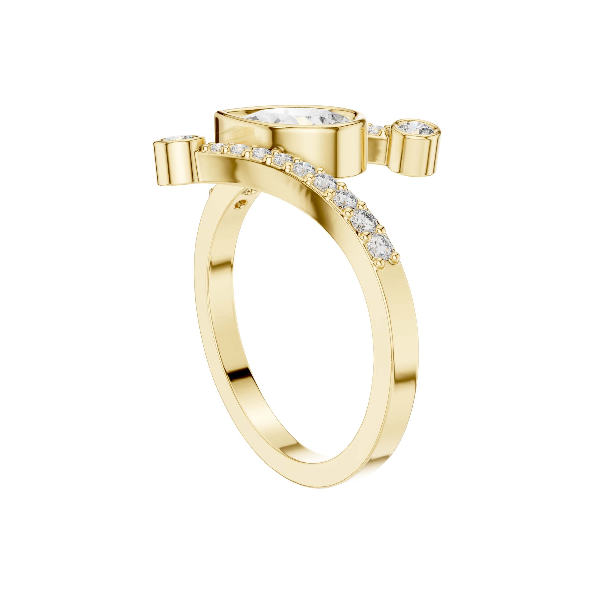 This captivating gold bypass ring features a luminous pear-shaped center diamond cradled in a sleek bezel setting, symbolizing elegance in motion. The gracefully crossing band is adorned with pave-set diamonds that lead the eye toward two bezel-set round diamonds at each open end, adding balance and brilliance. Modern yet romantic, this sculptural design blends fluid curves with refined sparkle, making it an unforgettable statement ring perfect for engagements, anniversaries, or a bold expression of personal style by Ivevar.