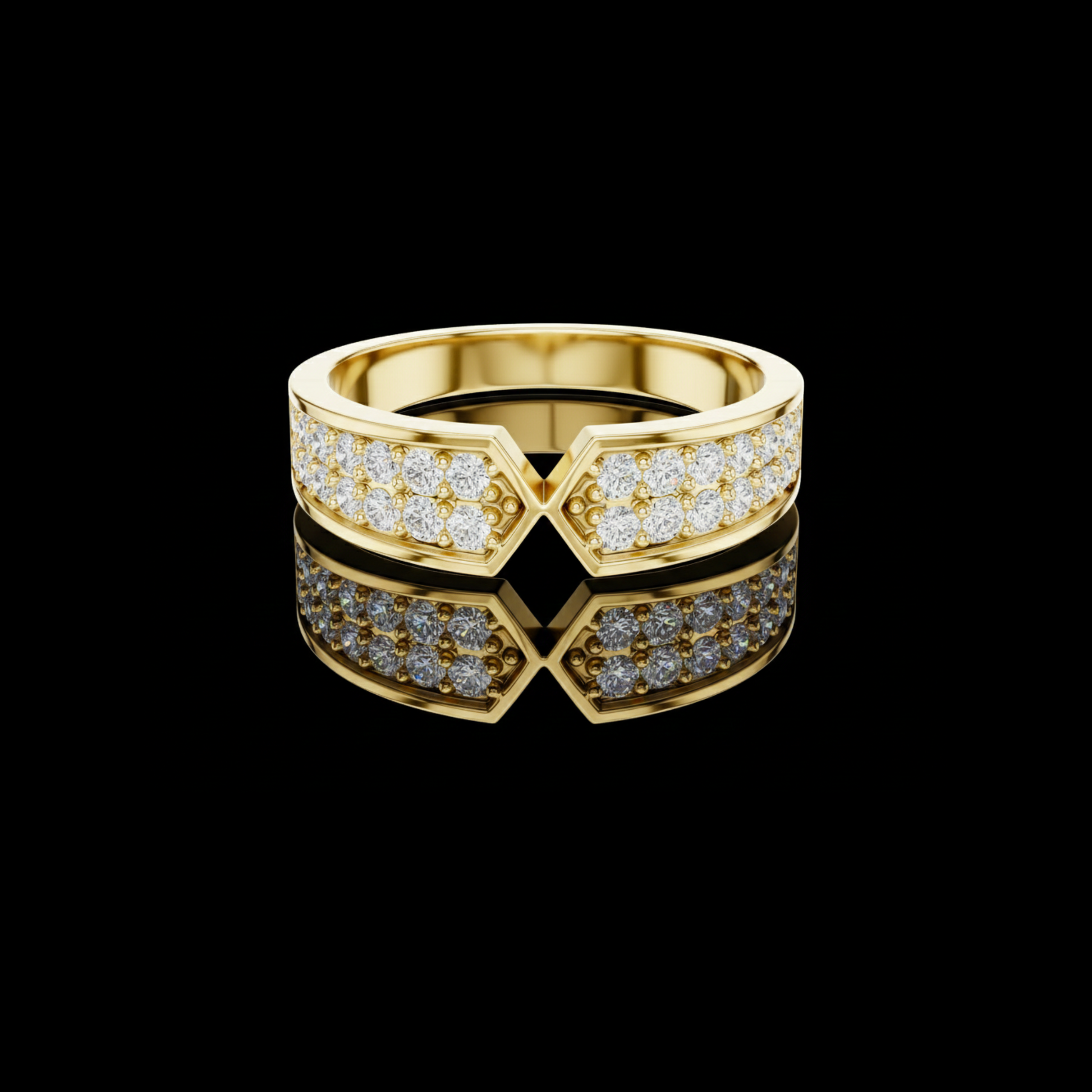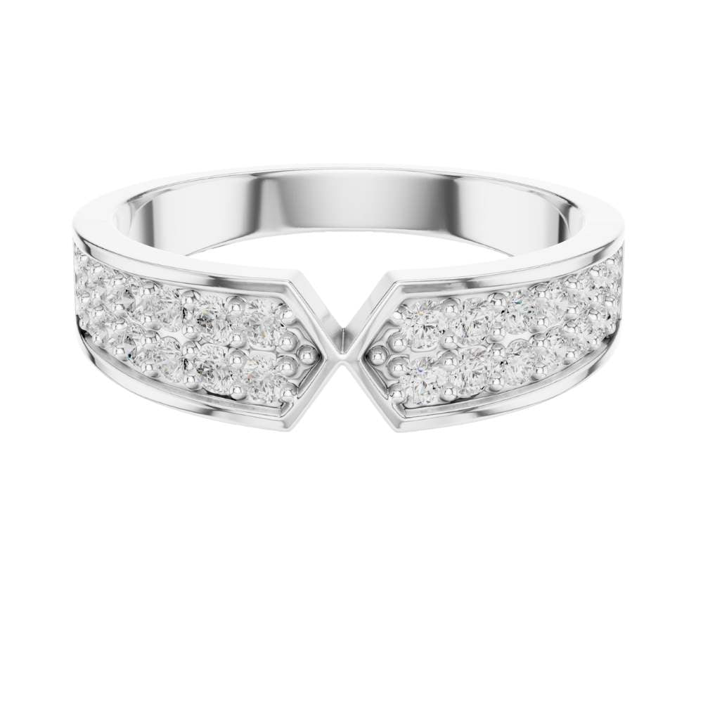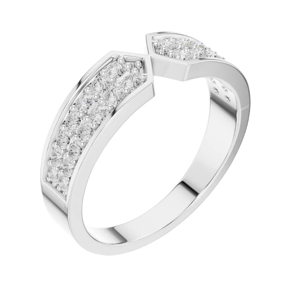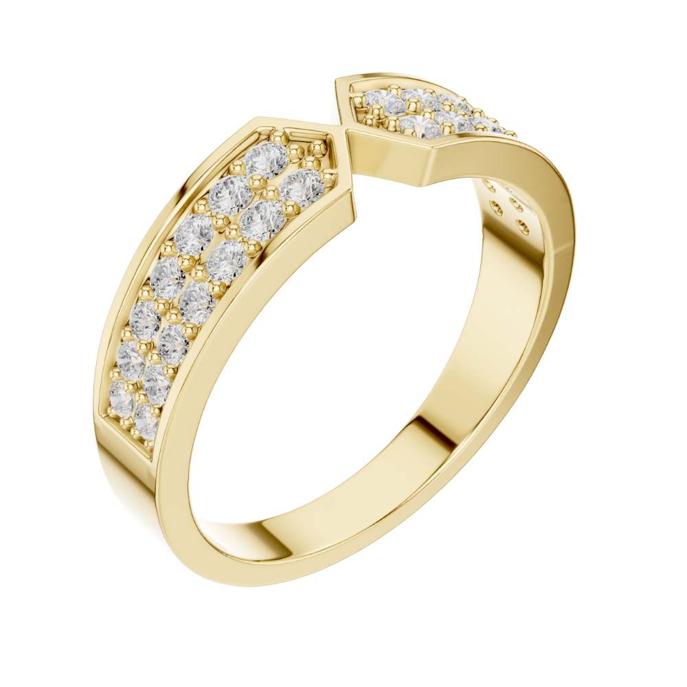 This sleek and contemporary ring showcases a striking chevron design crafted in rich gold, accentuated by rows of sparkling pave-set round diamonds. The open V-shaped center creates a bold, geometric focal point that adds a modern edge to the classic diamond band. With its clean lines and brilliant shimmer, this ring is a versatile statement piece that effortlessly complements both everyday wear and special occasions, embodying a perfect blend of sophistication and style by Ivevar.