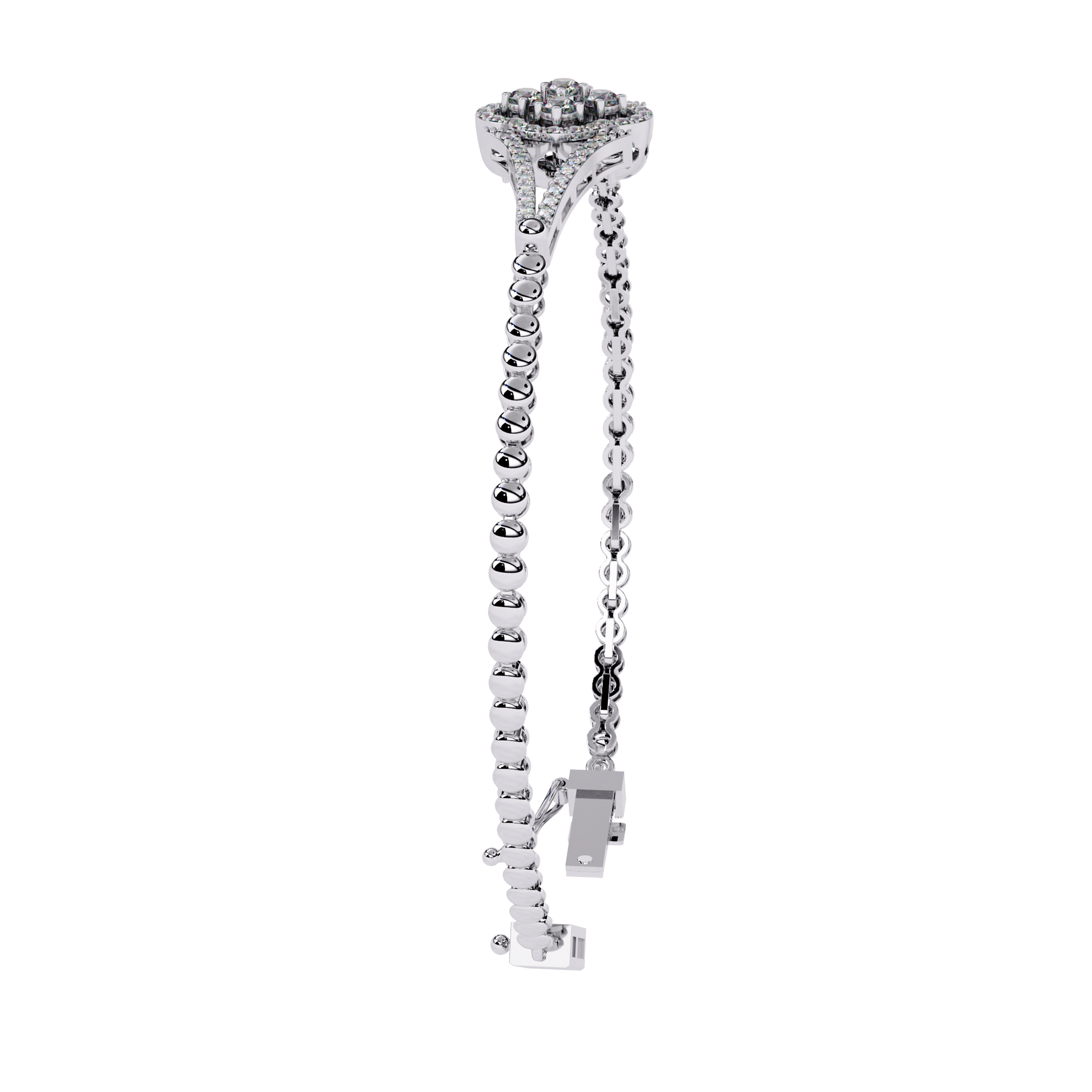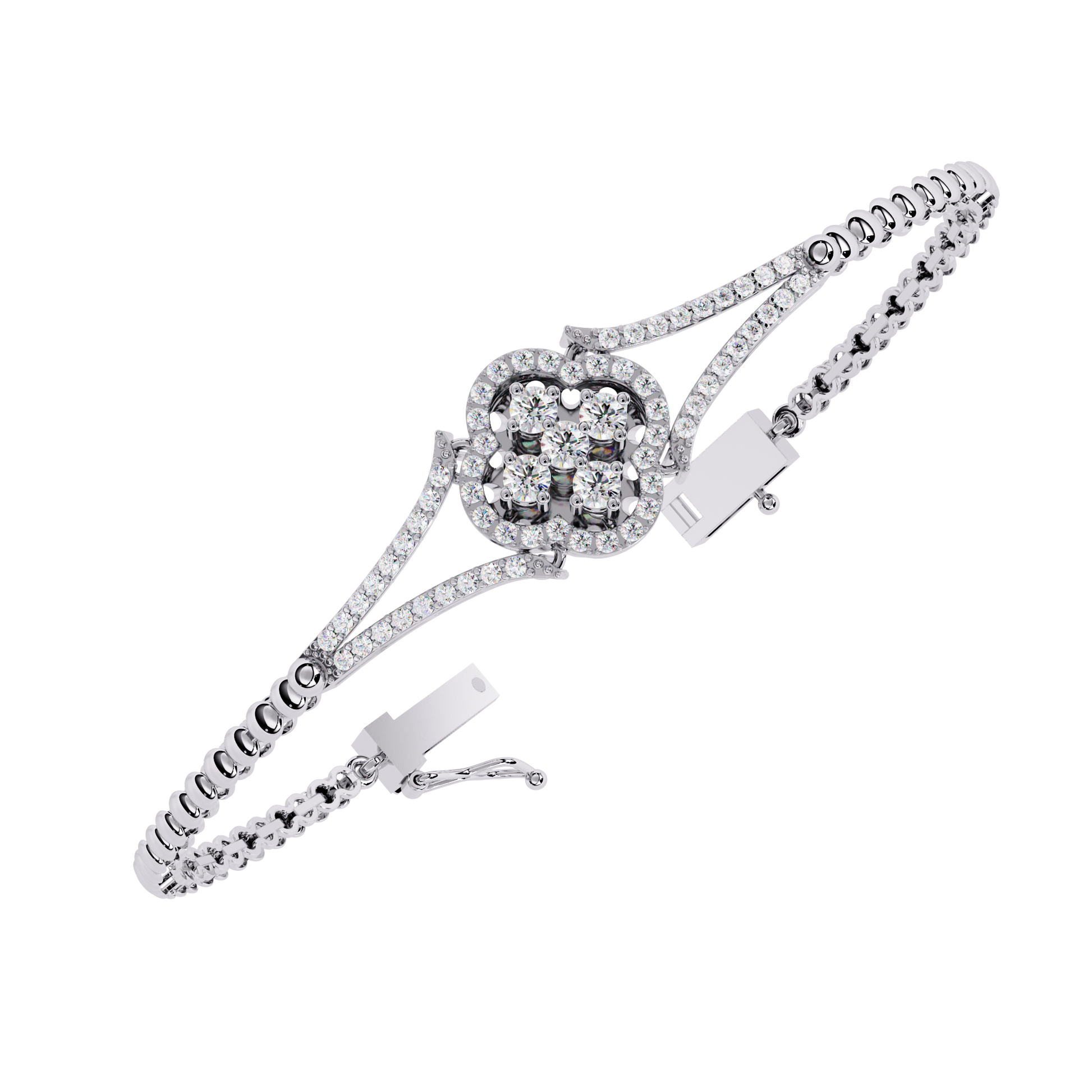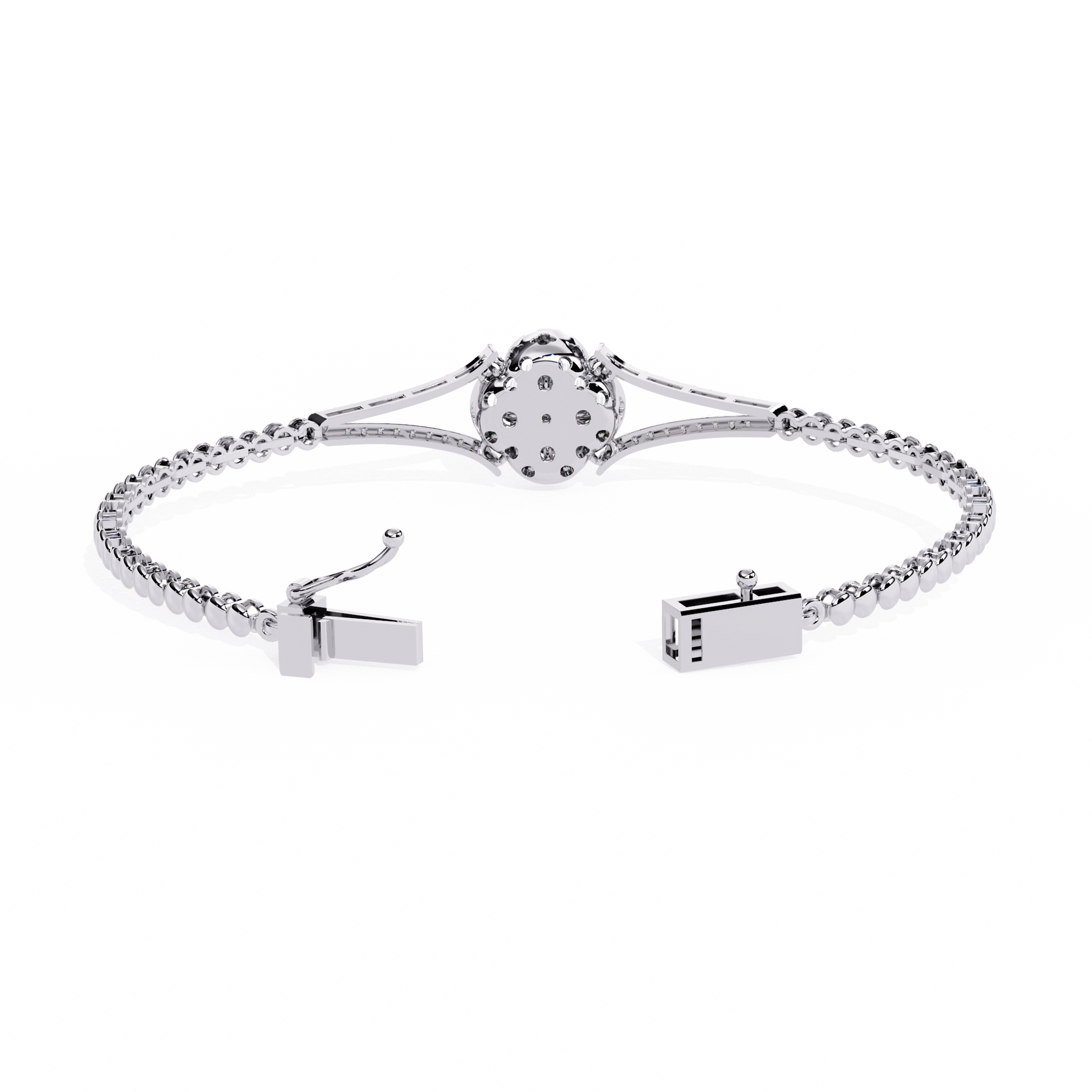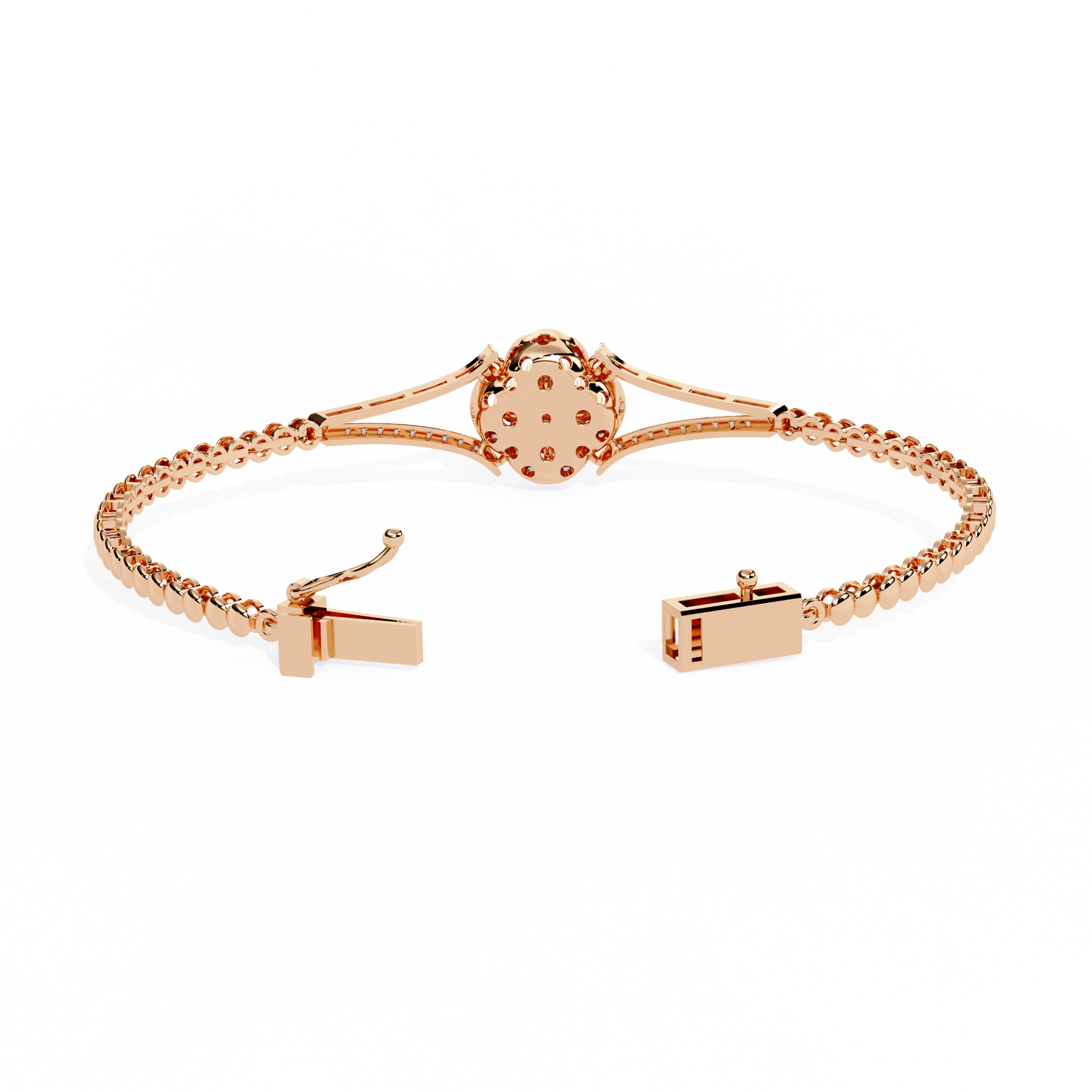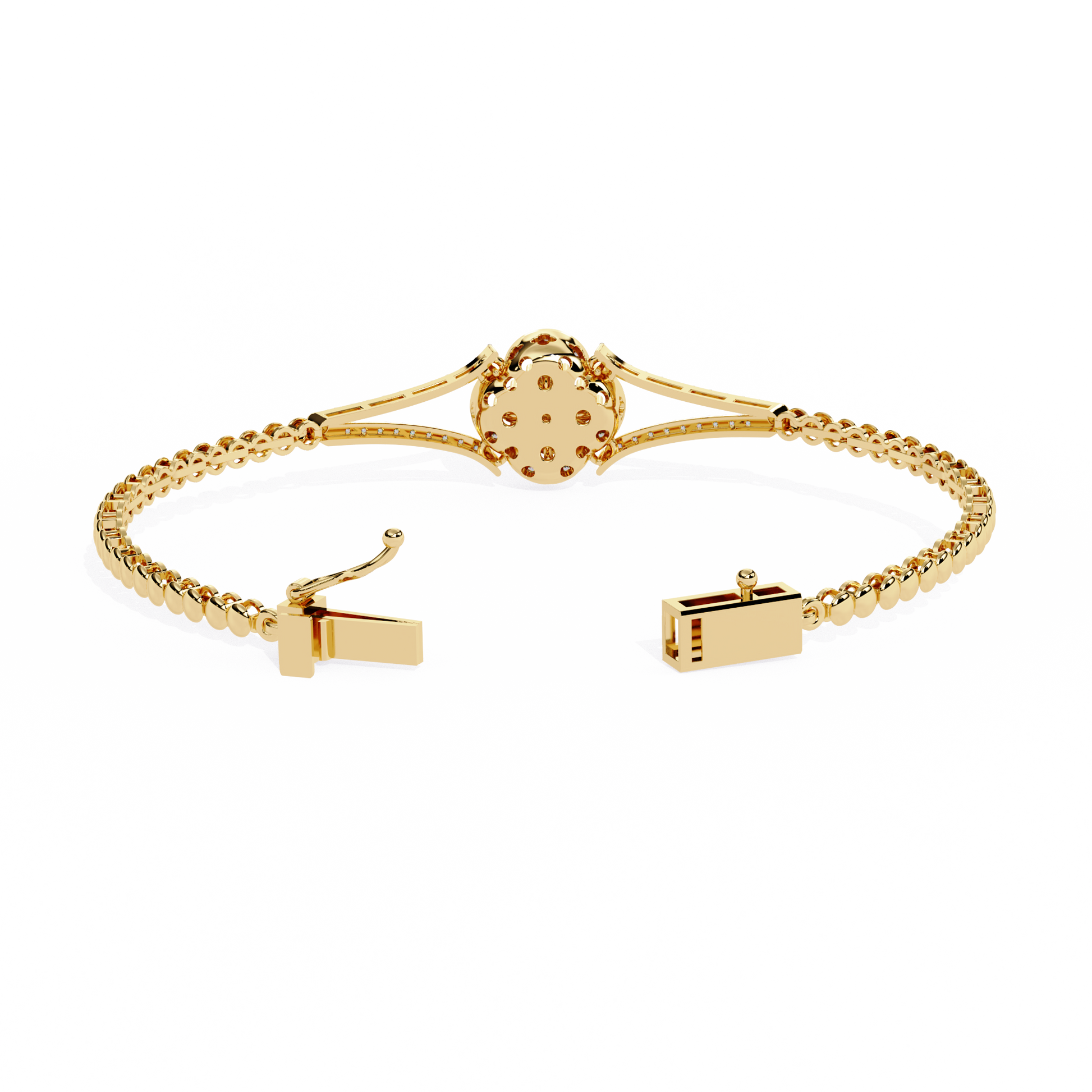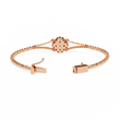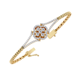 This elegant gold bracelet features a delicate central floral motif adorned with sparkling round stones, creating a refined blend of symmetry and sophistication. Its slim, polished band tapers gracefully toward the centerpiece, where the petal-like design adds a touch of timeless charm. The surrounding accents enhance the brilliance of the stones, while the bracelet’s reflective presentation highlights its luxurious craftsmanship. Perfect for both special occasions and everyday elegance, it exudes a classic yet modern allure by Ivevar.
