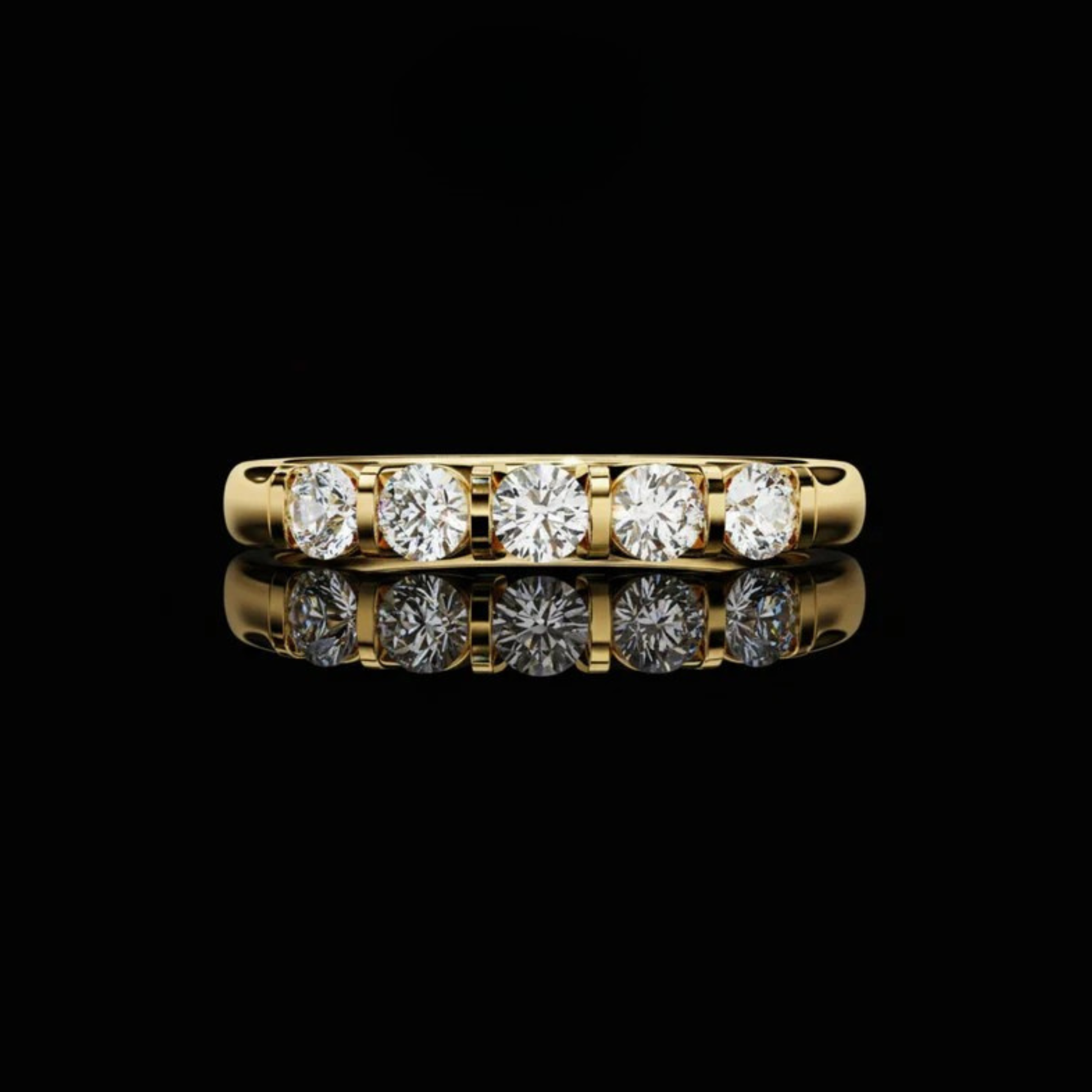 This stunning five-stone diamond band is crafted in gold and features five dazzling round-cut diamonds set in sleek, modern prong settings. Each diamond is perfectly aligned, showcasing their exceptional brilliance and creating an elegant, timeless appeal. The ring’s simple yet sophisticated design makes it an ideal choice for an engagement ring, anniversary gift, or a statement piece for any occasion. The combination of sparkling diamonds and luxurious gold offers a perfect balance of glamour and class.
