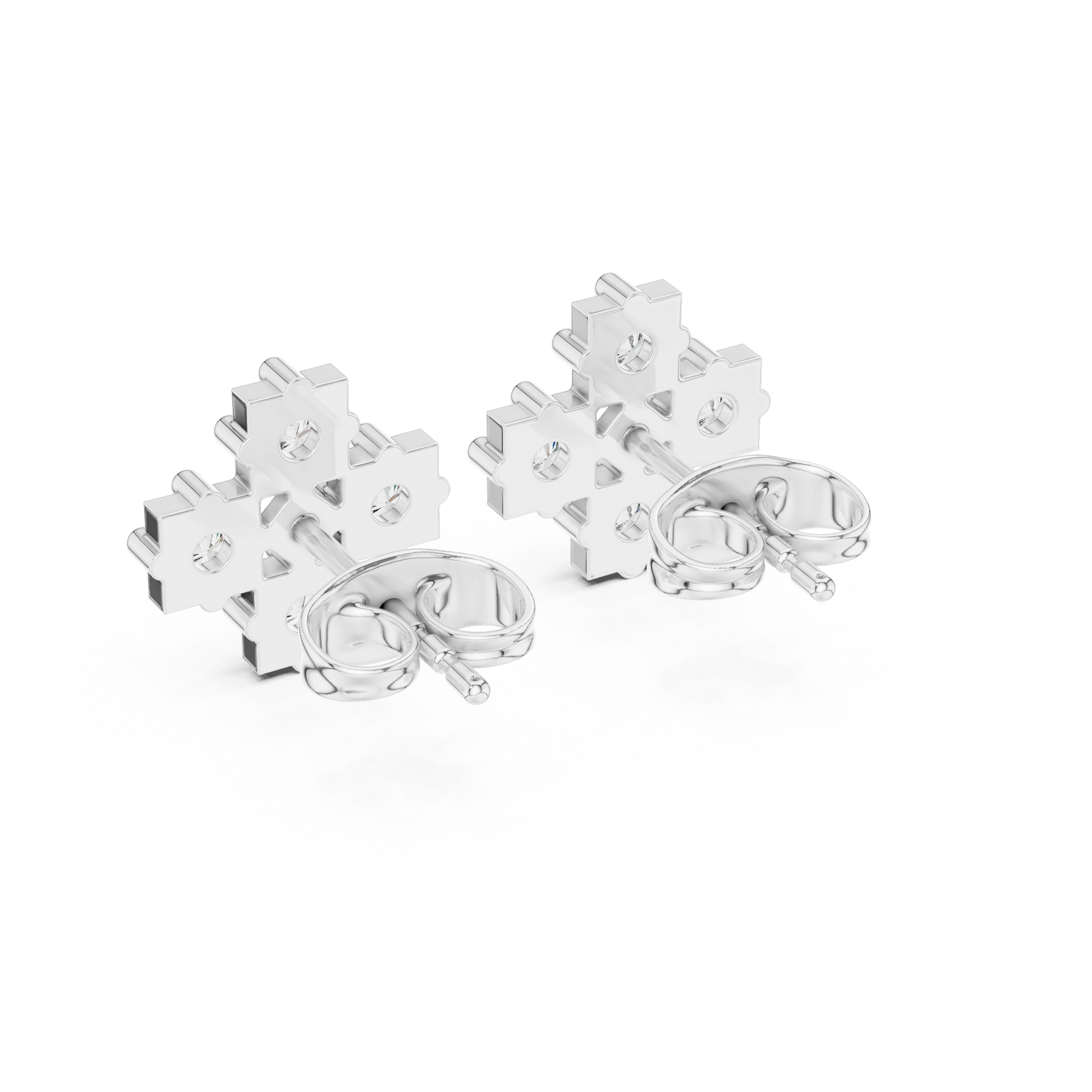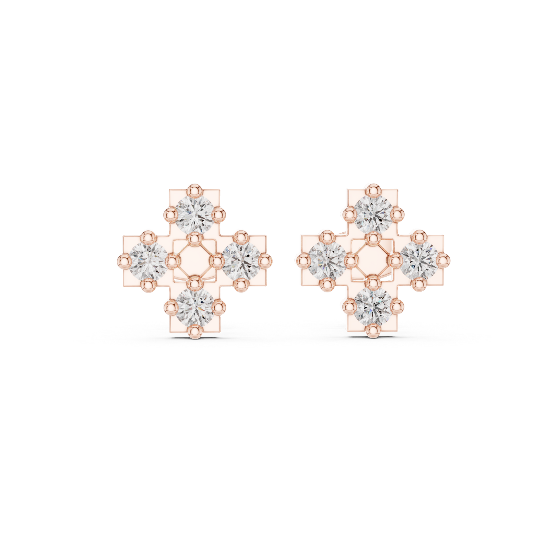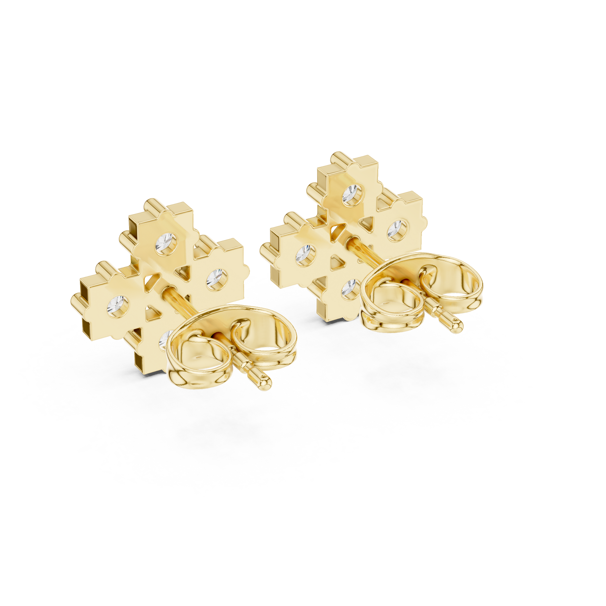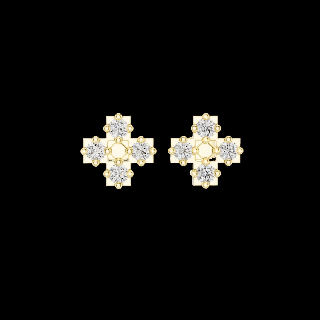 These architectural diamond stud earrings feature a bold cross silhouette crafted in polished gold. Each stud is accented with precisely set round diamonds positioned at every arm, creating a balanced and radiant design with strong geometric appeal. Clean gold planes contrast beautifully with the sparkle of the diamonds, giving these earrings a modern, structured elegance. Ideal for everyday luxury or refined statement wear, they offer a confident blend of craftsmanship, symmetry, and timeless shine.