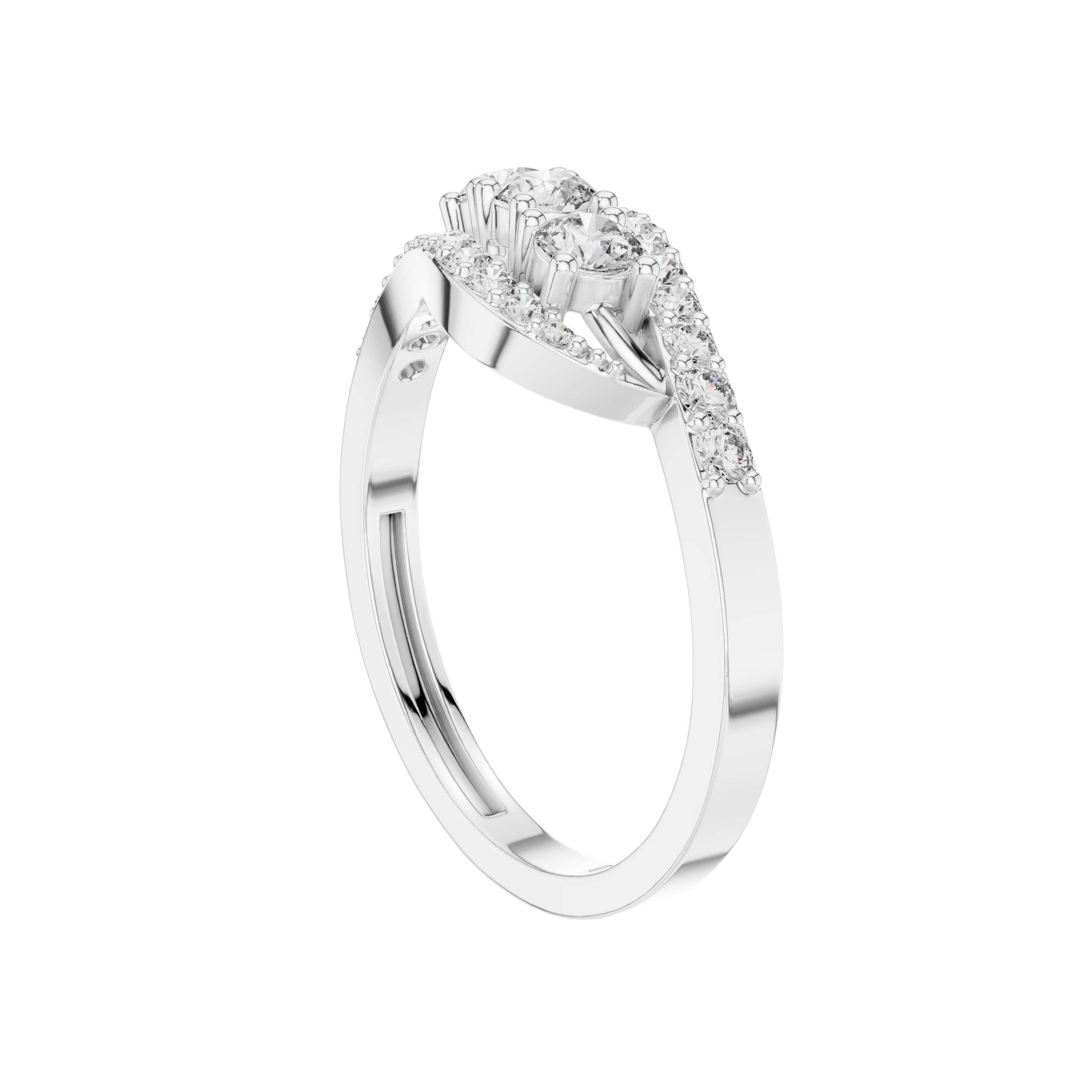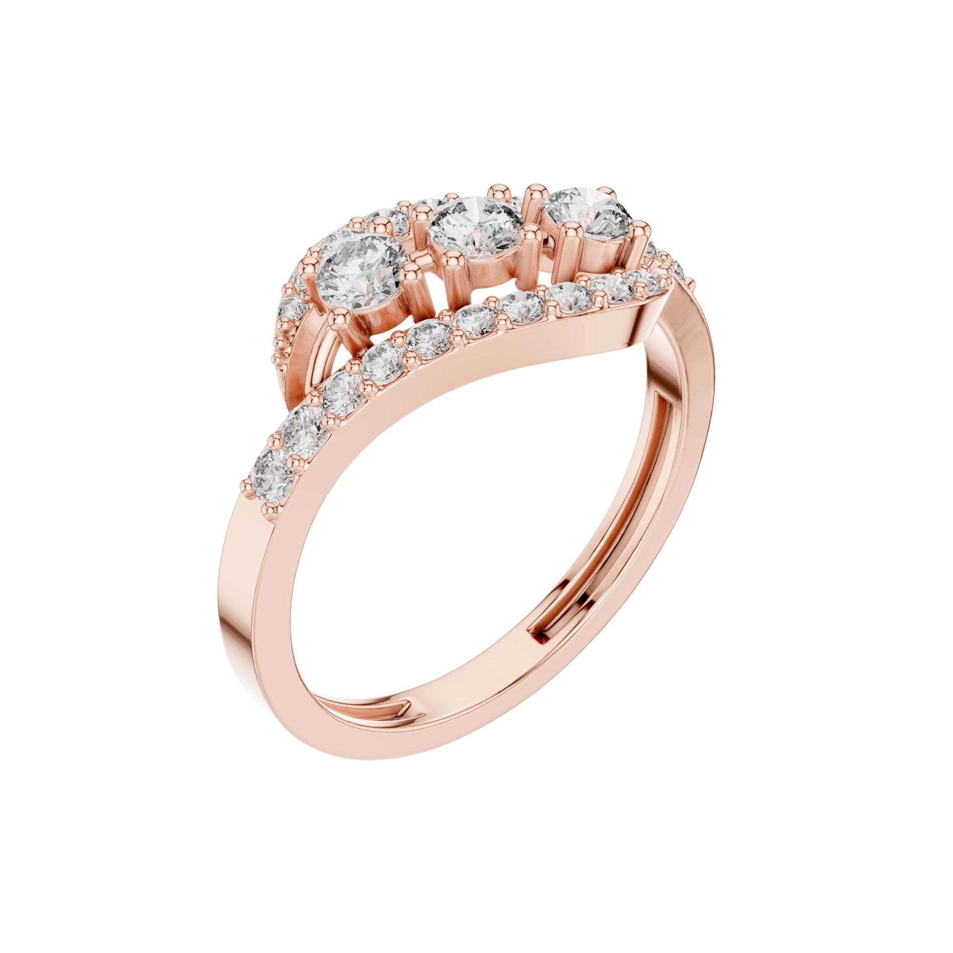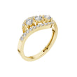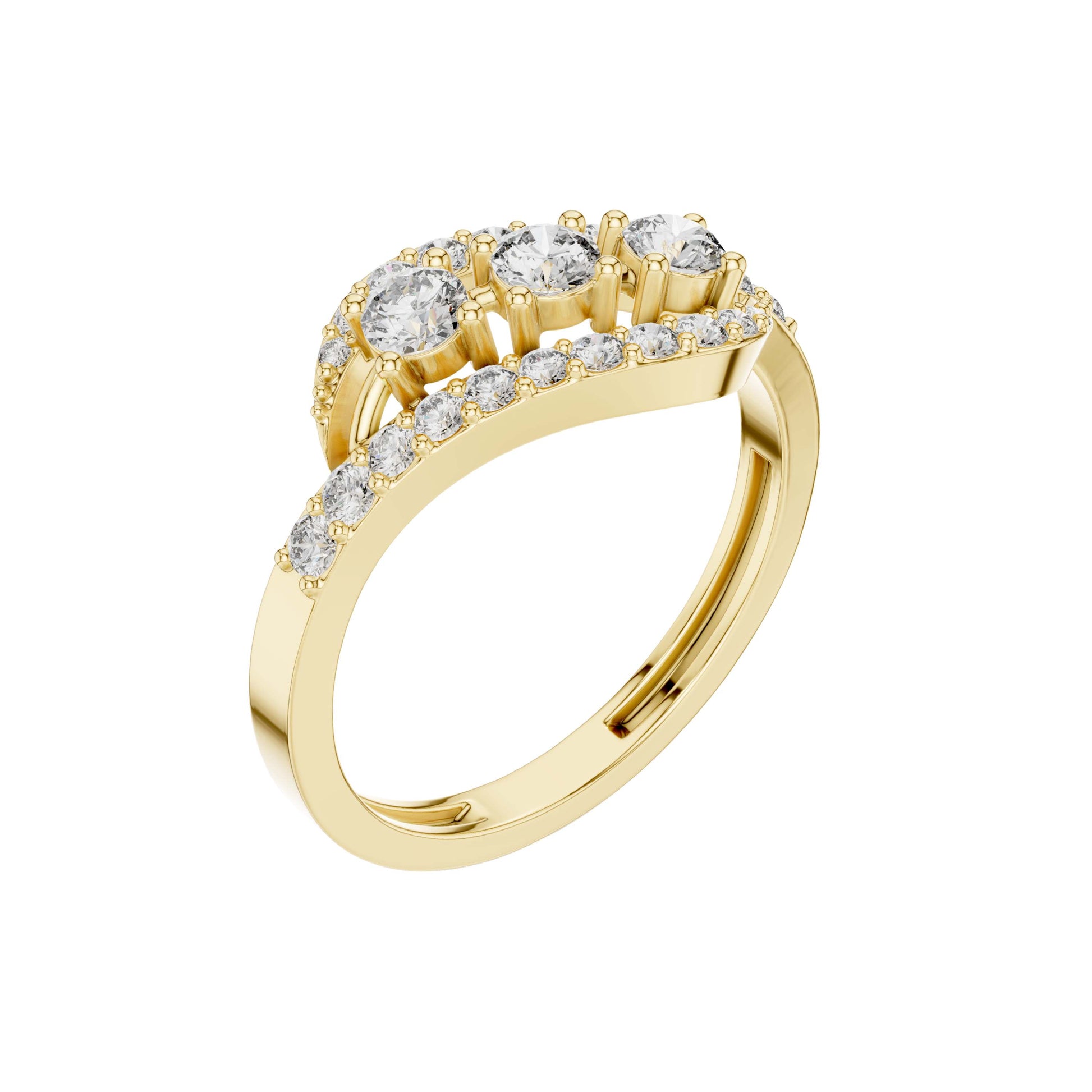 This elegant gold ring features a graceful interwoven design that brings movement and brilliance together in perfect harmony. Three round brilliant-cut diamonds form a striking center, while pave-set diamonds trace the flowing gold bands, adding continuous sparkle from every angle. The overlapping silhouette creates depth and sophistication, making this ring a beautiful statement of modern luxury—ideal as a fashion ring, anniversary gift, or a distinctive alternative to traditional diamond styles.