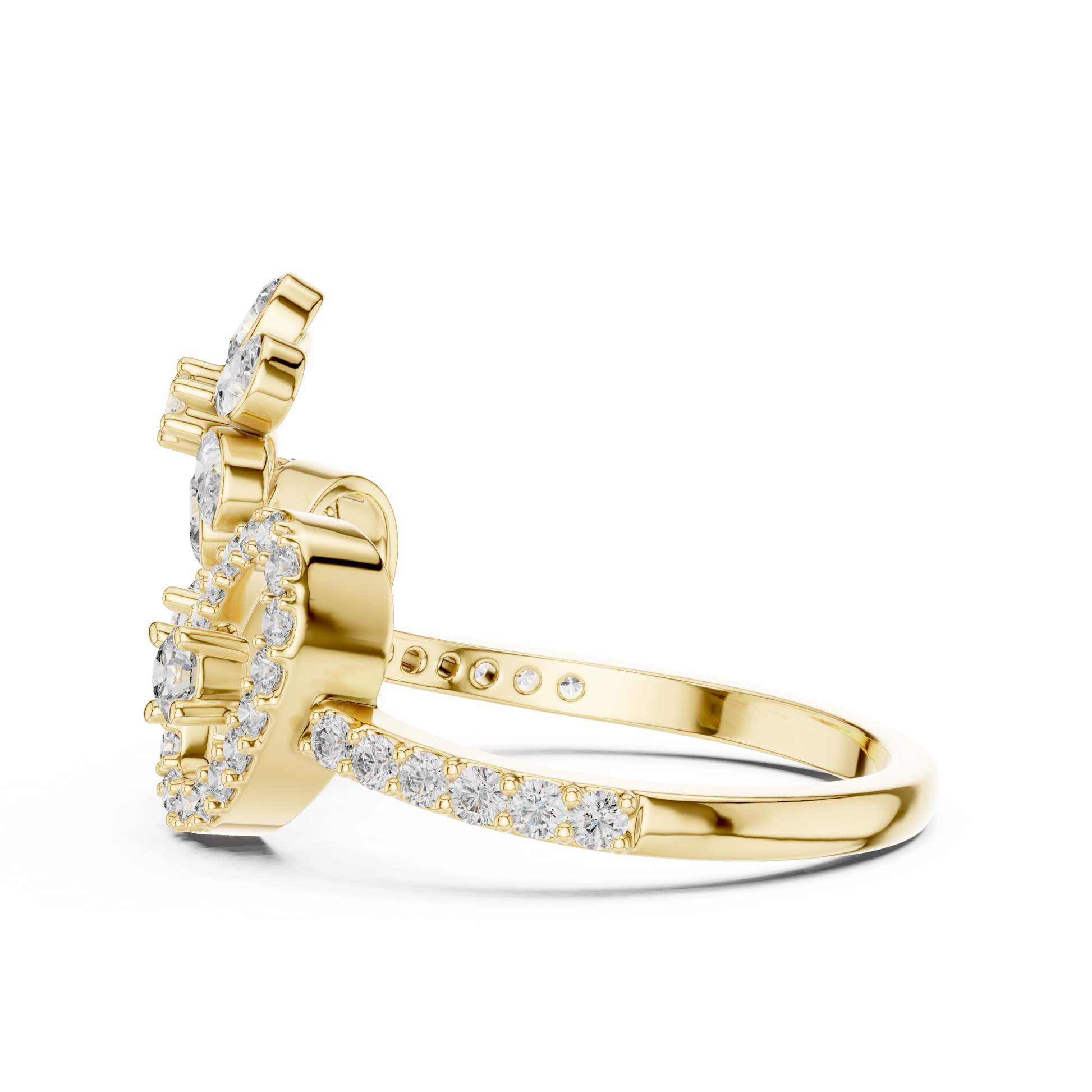 Celebrate elegance and romance with this luxury gold diamond ring, exquisitely crafted in a royal floral design with graceful heart-shaped curves. The centerpiece features a brilliant flower of pear-cut diamonds, radiating timeless beauty and feminine charm.Designed for women who adore unique designer jewelry, this ring is a symbol of love, sophistication, and everlasting brilliance.