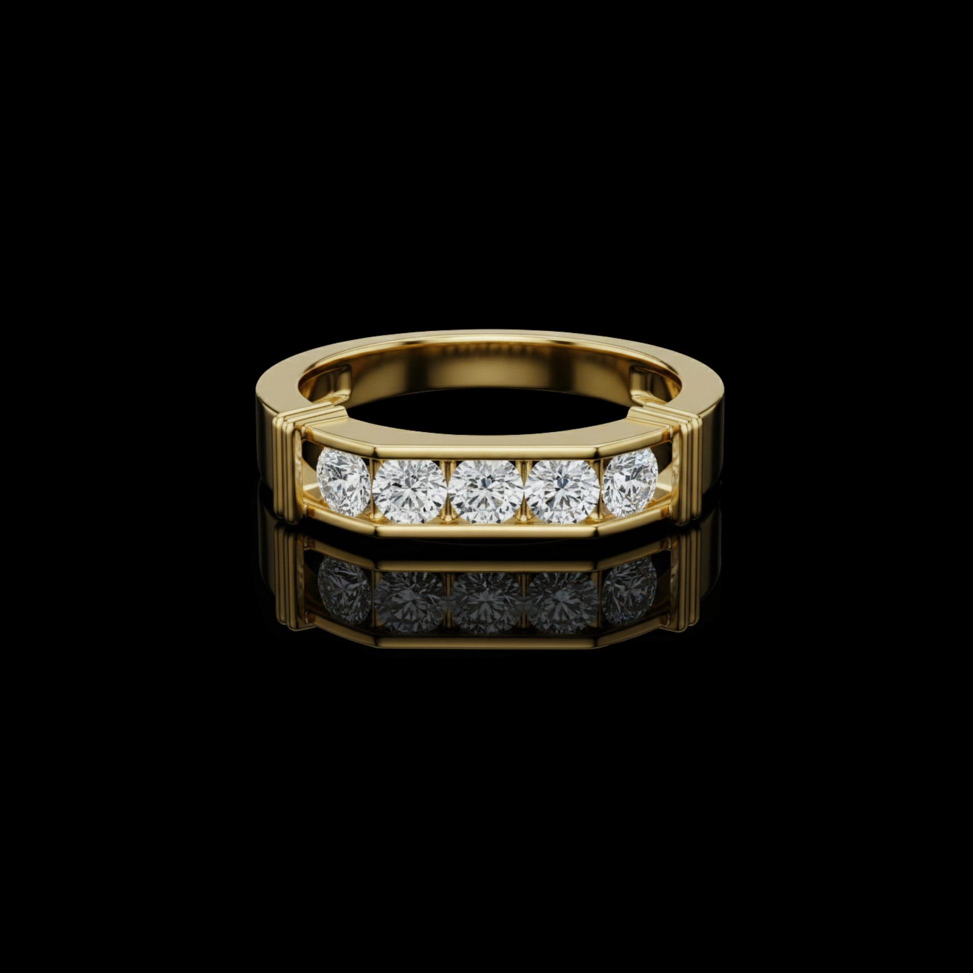 This sophisticated ring is designed with a bold channel-set row of round brilliant diamonds, securely framed within a high-band. The clean architectural lines give the ring a contemporary, confident presence, while the diamonds deliver exceptional sparkle and balance.Perfect for those who appreciate minimalist luxury and enduring design, this band works beautifully as a wedding ring, anniversary band, or everyday statement piece.