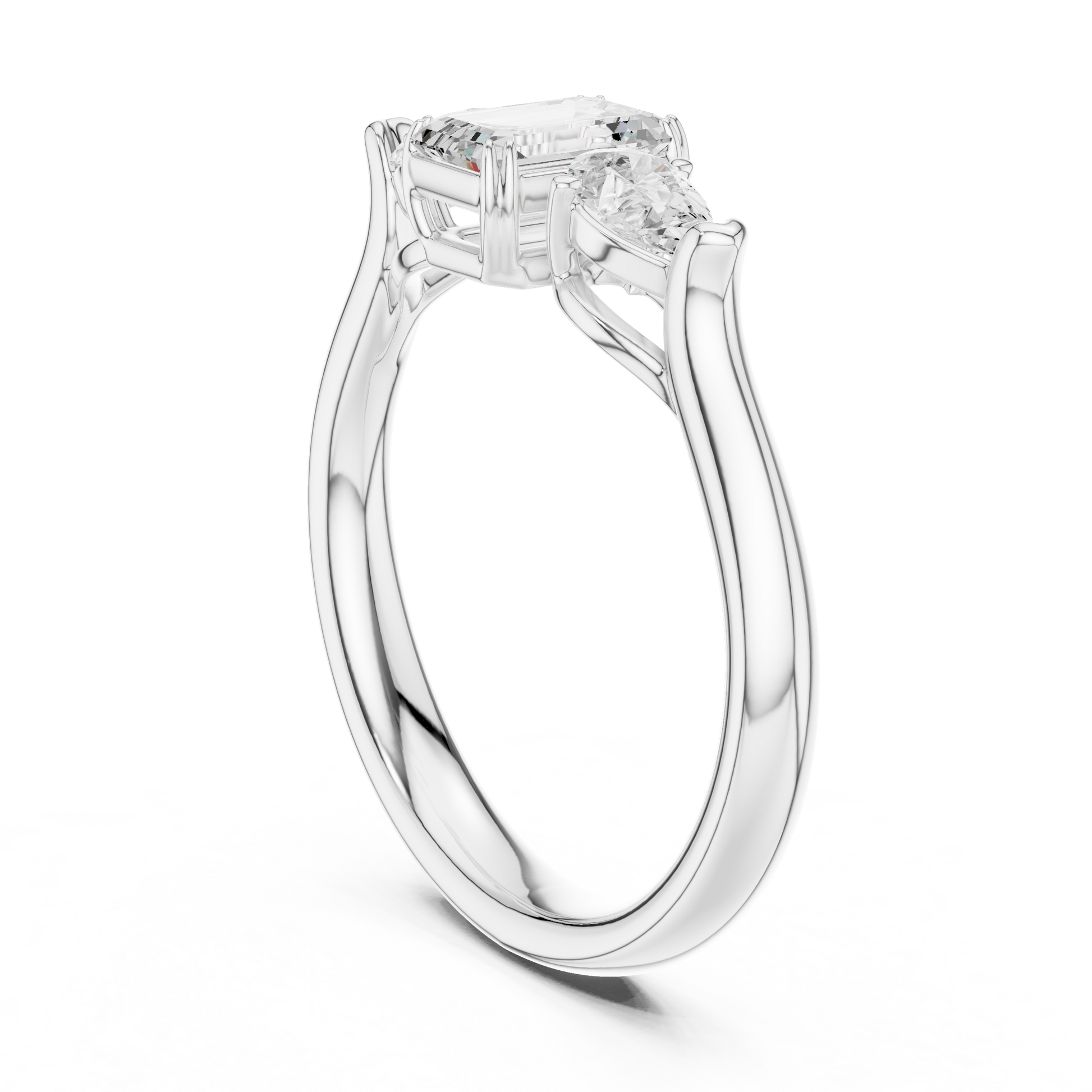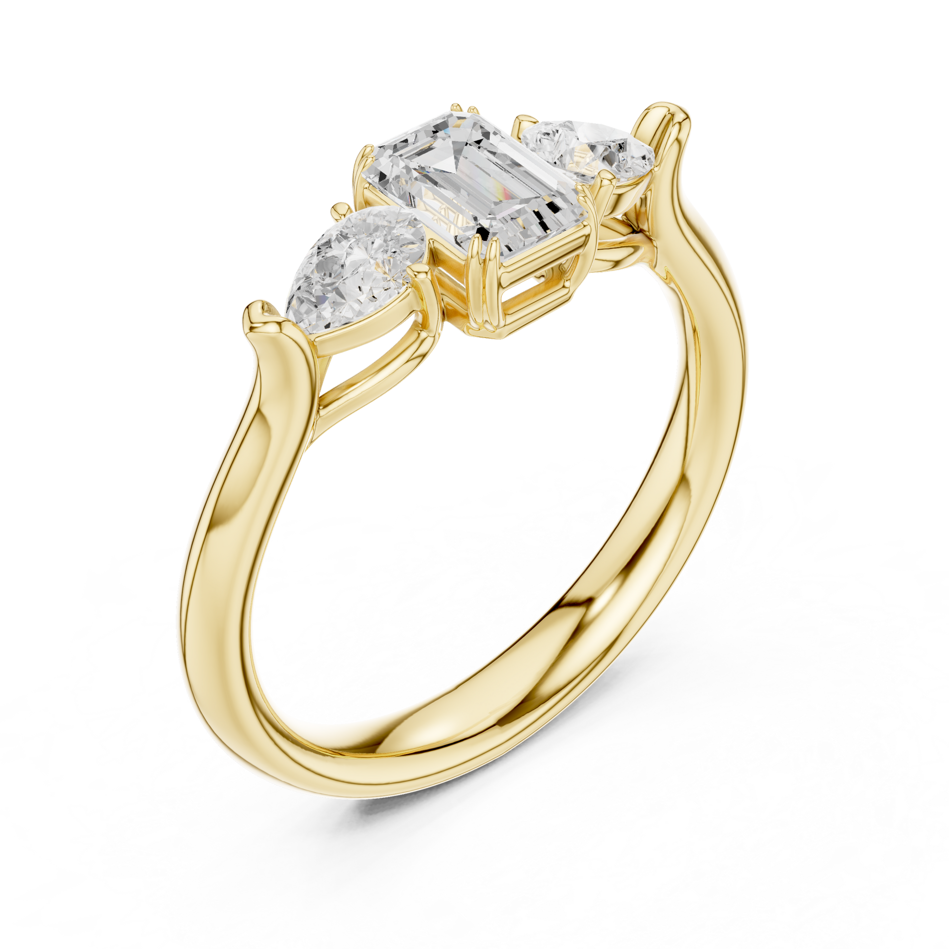 Introducing a stunning creation from Ivevar Luxury, this exquisite ring features a brilliant emerald-cut center stone framed by two sparkling trillian-cut side stones, creating a perfectly balanced and luxurious three-stone design. the band offers a warm radiance that enhances the clarity and shape of each stone. Its sleek, modern silhouette blends timeless sophistication with contemporary artistry, making it a breathtaking choice for engagements, anniversaries, or meaningful celebrations.