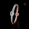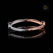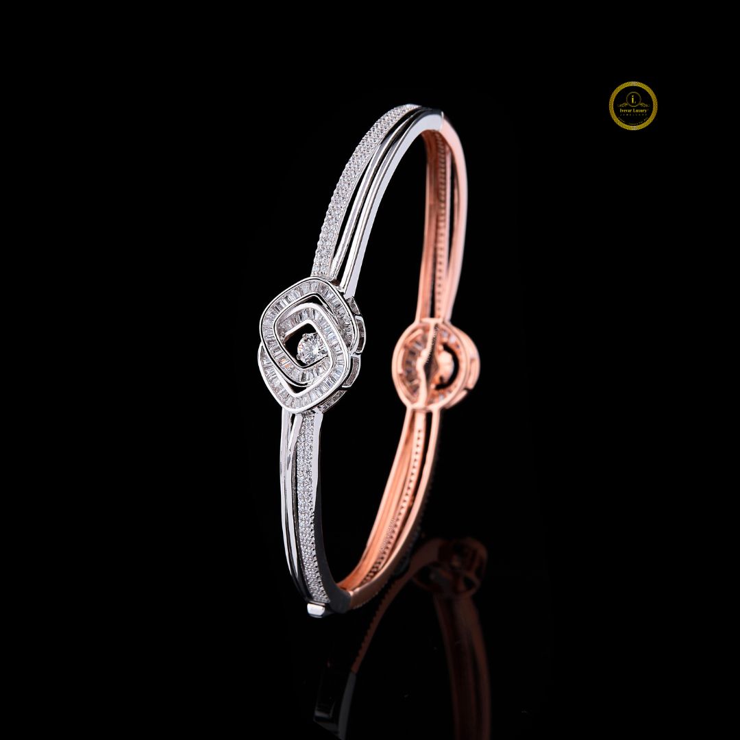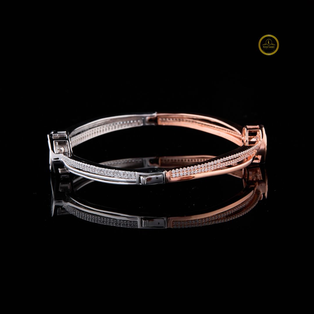 This elegant two-tone bracelet features a sleek blend of white and rose metal tones, highlighted by a striking geometric diamond centerpiece. Its refined double-band structure and pavé detailing create a perfect balance of sparkle and sophistication. Lightweight, modern, and versatile, this bracelet adds a touch of luxury to both everyday looks and special occasions.