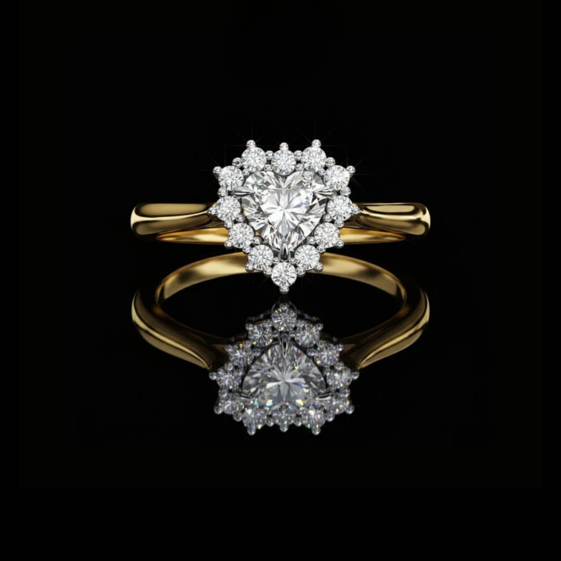 This enchanting ring features a dazzling heart-shaped center diamond surrounded by a radiant halo of brilliant round diamonds. Set on a polished gold ring, the design captures the essence of romance and elegance. The halo enhances the sparkle and definition of the heart shape, creating a breathtaking display of light and luxury. Perfect for engagements, anniversaries, or heartfelt gifts, this ring symbolizes deep love and timeless devotion.