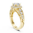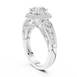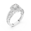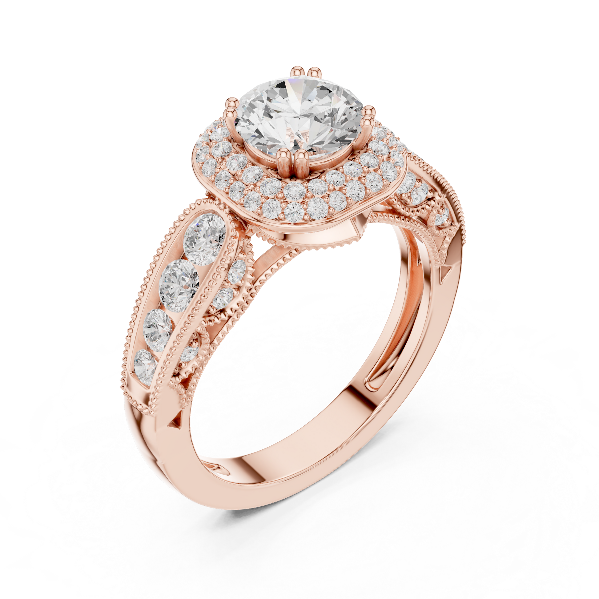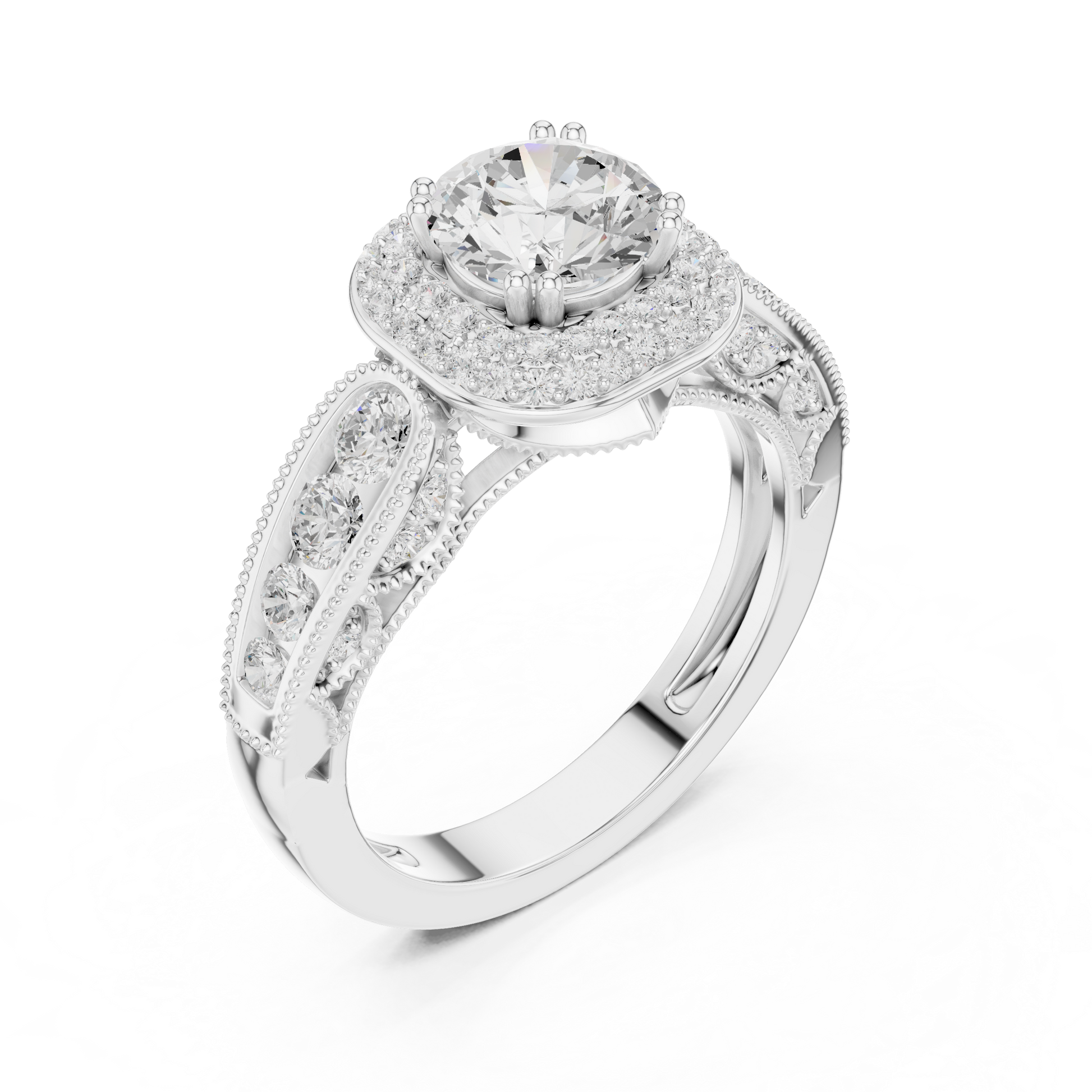 A Masterpiece Of Refined Brilliance, This Halo Ring Showcases A Round Center Diamond That Captures Light With Extraordinary Fire. Surrounding It Is A Soft Cushion-Shaped Halo Of Pavé Diamonds, Creating A Luminous Frame That Enhances Every Facet. The Shoulders Of The Band Are Adorned With Prong-Set Round Diamonds, Enriched With Delicate Milgrain Accents That Bring A Hint Of Vintage Artistry.