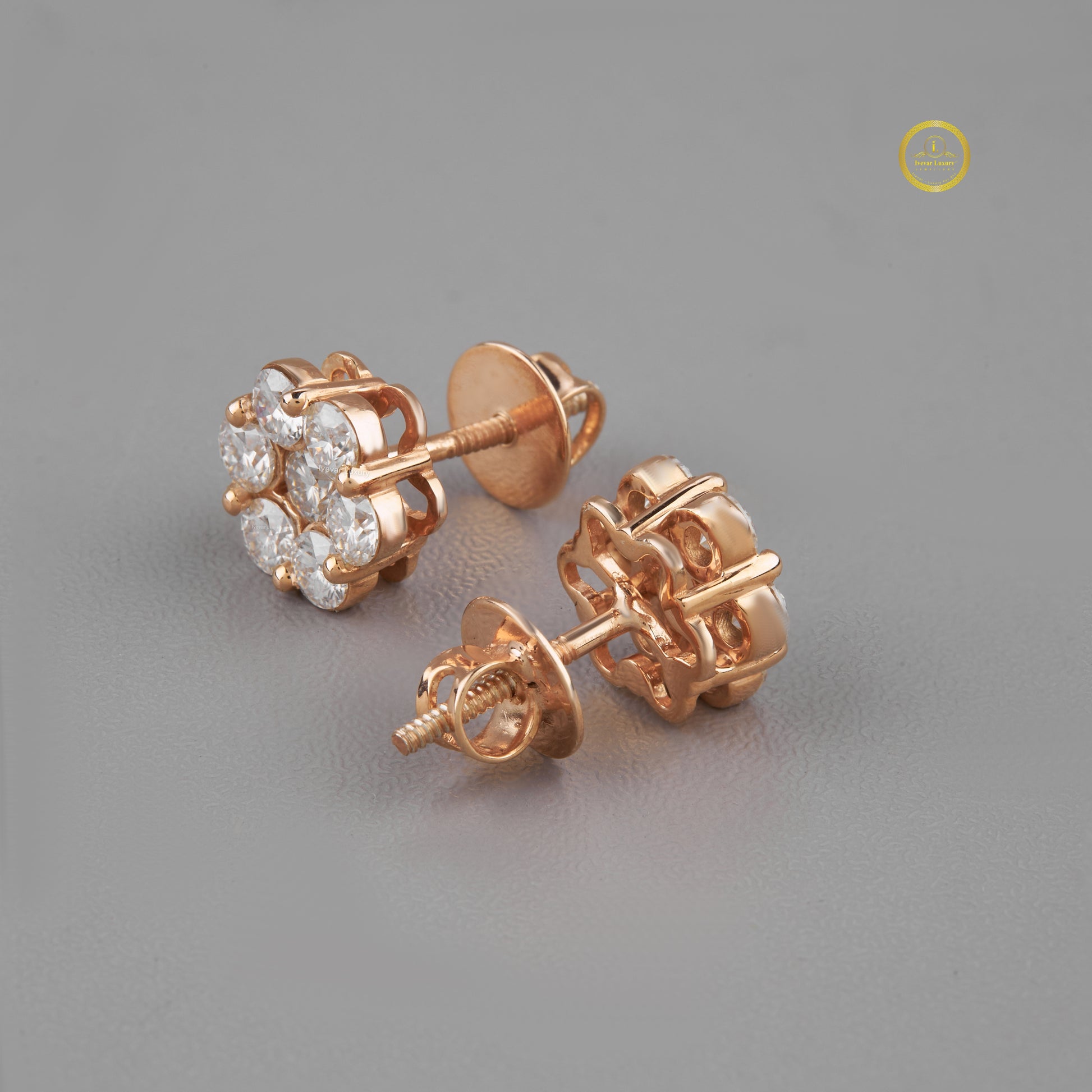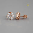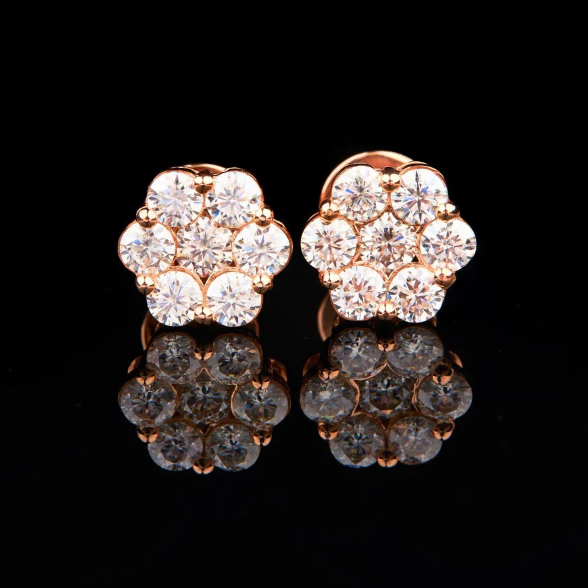 These exquisite stud earrings showcase a floral-inspired cluster design, featuring sparkling round-cut stones set in a warm rose gold setting. The arrangement of seven dazzling gems creates a harmonious and radiant bloom effect, enhancing the brilliance and elegance of each piece. Perfectly balanced and shimmering from every angle, these earrings add a touch of timeless sophistication and refined glamour to any ensemble.