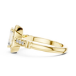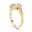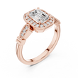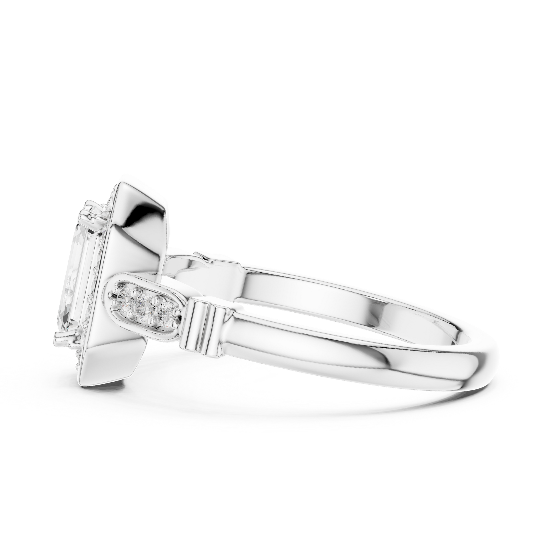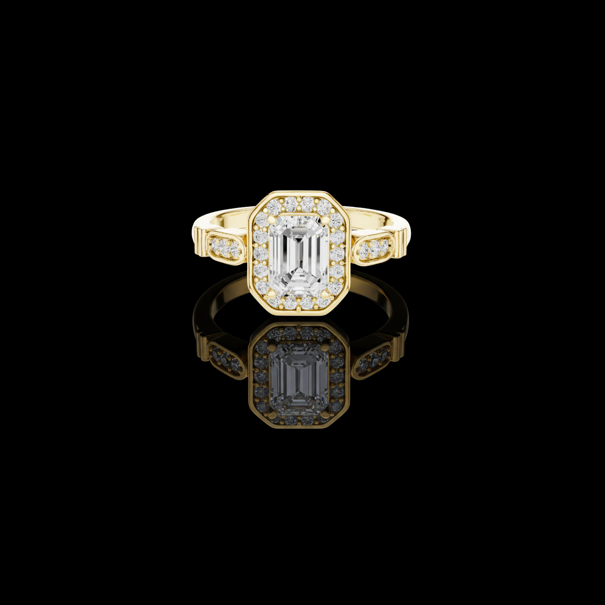 Elevate your style with this striking emerald-cut halo diamond ring, where architectural elegance meets timeless brilliance. The sleek emerald-cut center diamond commands attention with its clean lines and mirror-like sparkle, framed by a refined halo of pavé diamonds that enhances its luminous presence. Distinctive sculpted shoulders, accented with shimmering diamonds, add depth and a touch of vintage-inspired sophistication.