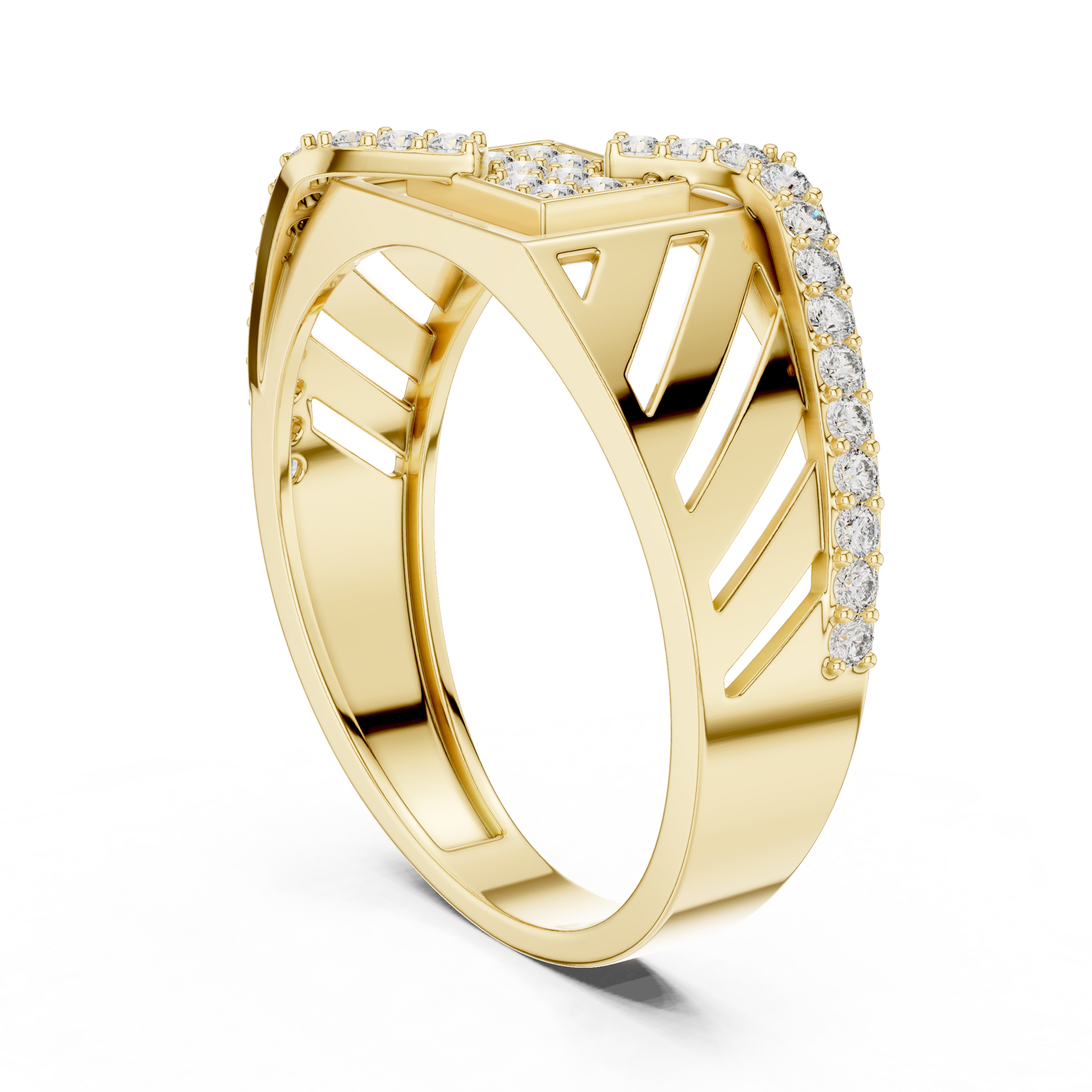 At Ivevar Luxury, this exquisite gold diamond ring is crafted for those who appreciate bold elegance and refined craftsmanship. The design features a striking geometric openwork structure, enhanced with brilliant pave-set diamonds that reflect light from every angle. Smooth high-polish gold contrasts beautifully with intricate cut details, creating a powerful yet sophisticated presence. This ring is a true statement of confidence, luxury, and modern artistry.