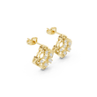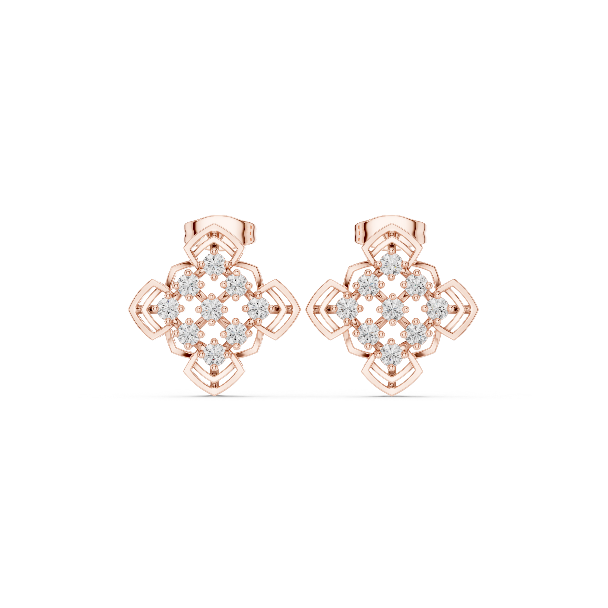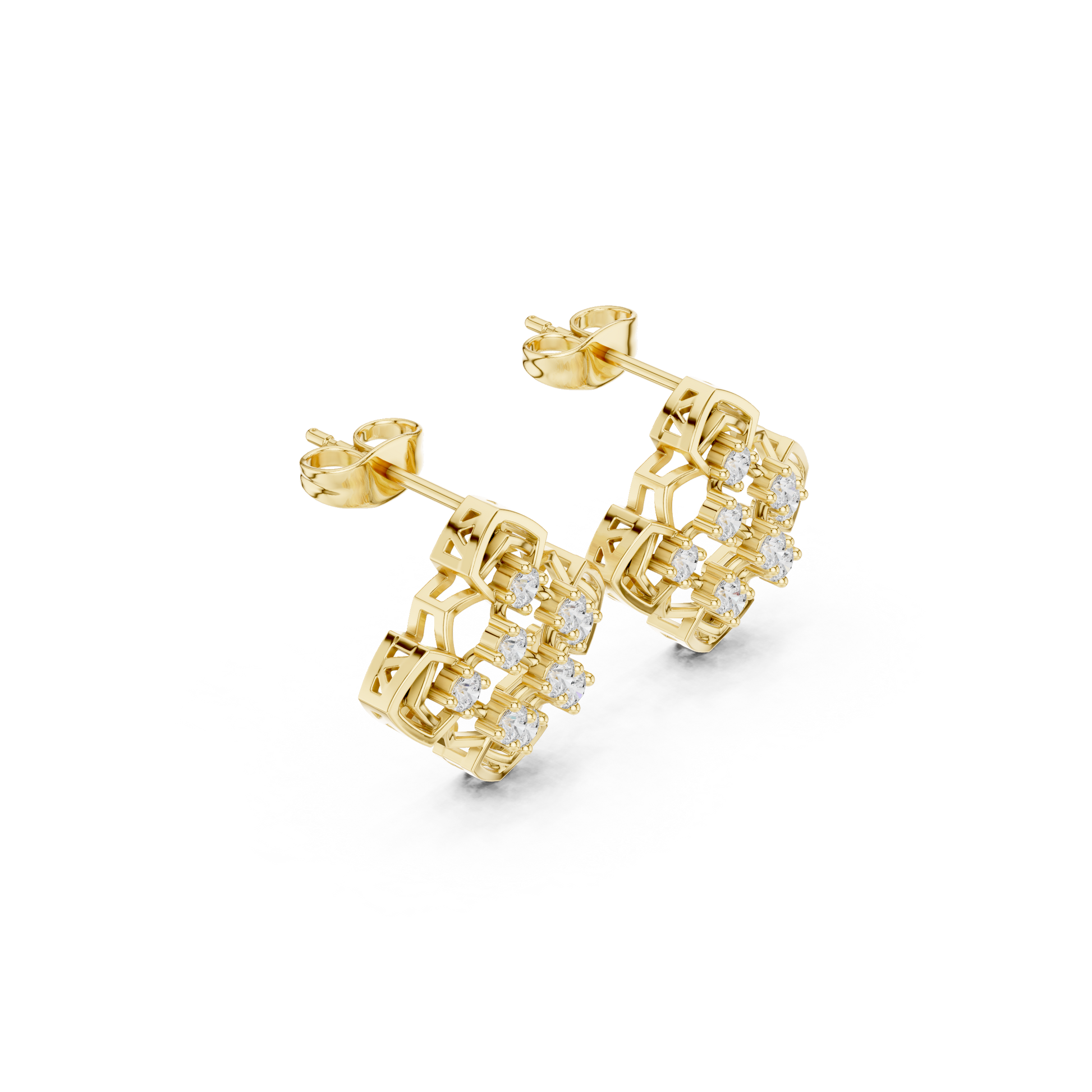 These ornate geometric diamond cluster stud earrings are crafted in polished gold, featuring an elegant open motif that blends classic symmetry with modern artistry. A radiant cluster of round brilliant diamonds forms the center, framed by structured gold accents that add depth and architectural beauty. Refined yet distinctive, these earrings are perfect for everyday luxury, festive occasions, or sophisticated gifting, offering timeless sparkle with contemporary design appeal.