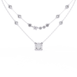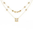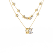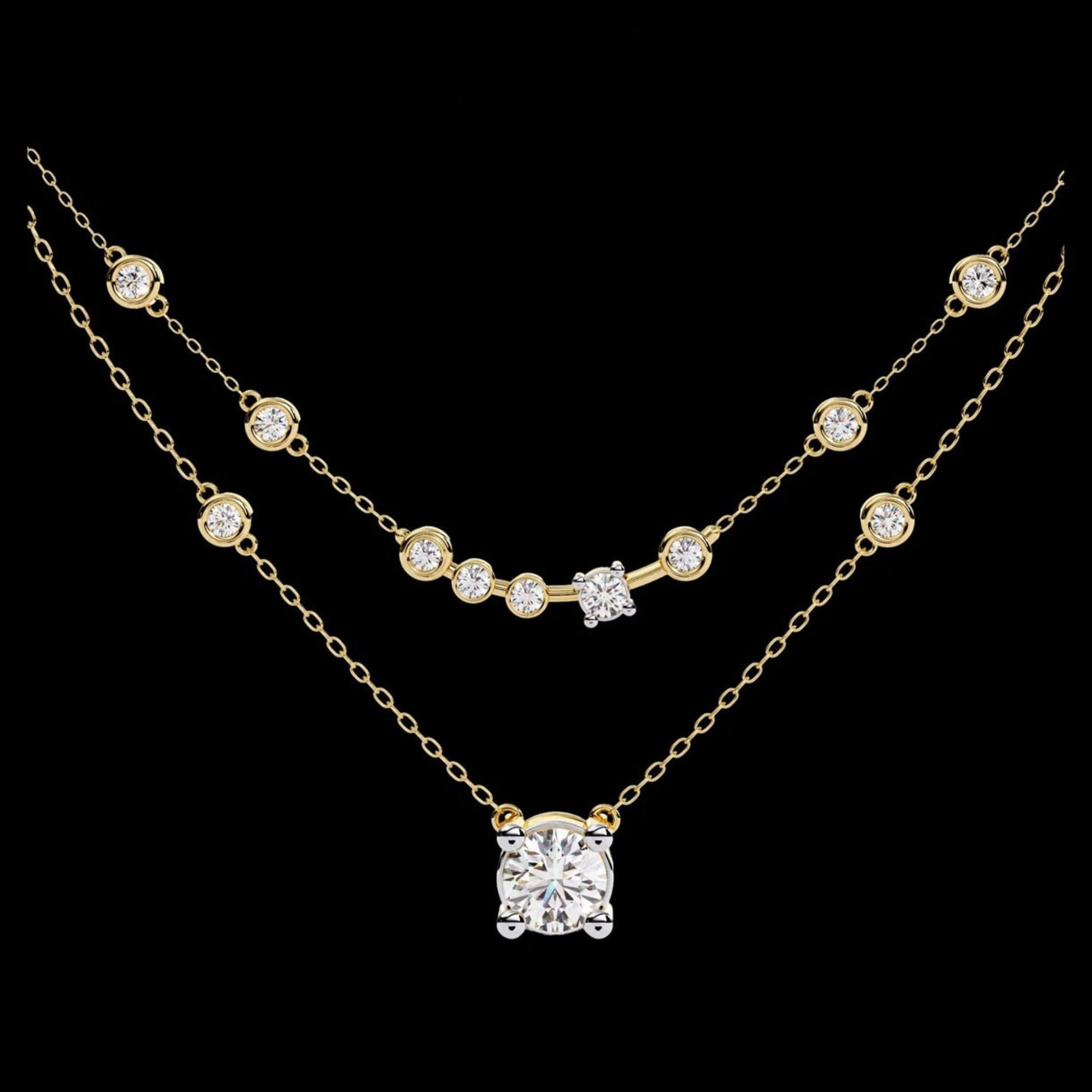 This elegant layered necklace features two delicate gold chains adorned with sparkling round-cut stones, creating a sophisticated, cascading look. The upper strand showcases evenly spaced bezel-set gems for a subtle shimmer, while the lower strand highlights a brilliant round central solitaire that adds a striking focal point. The combination of refined craftsmanship and radiant sparkle makes this piece perfect for both everyday elegance and special occasions by Ivevar.
